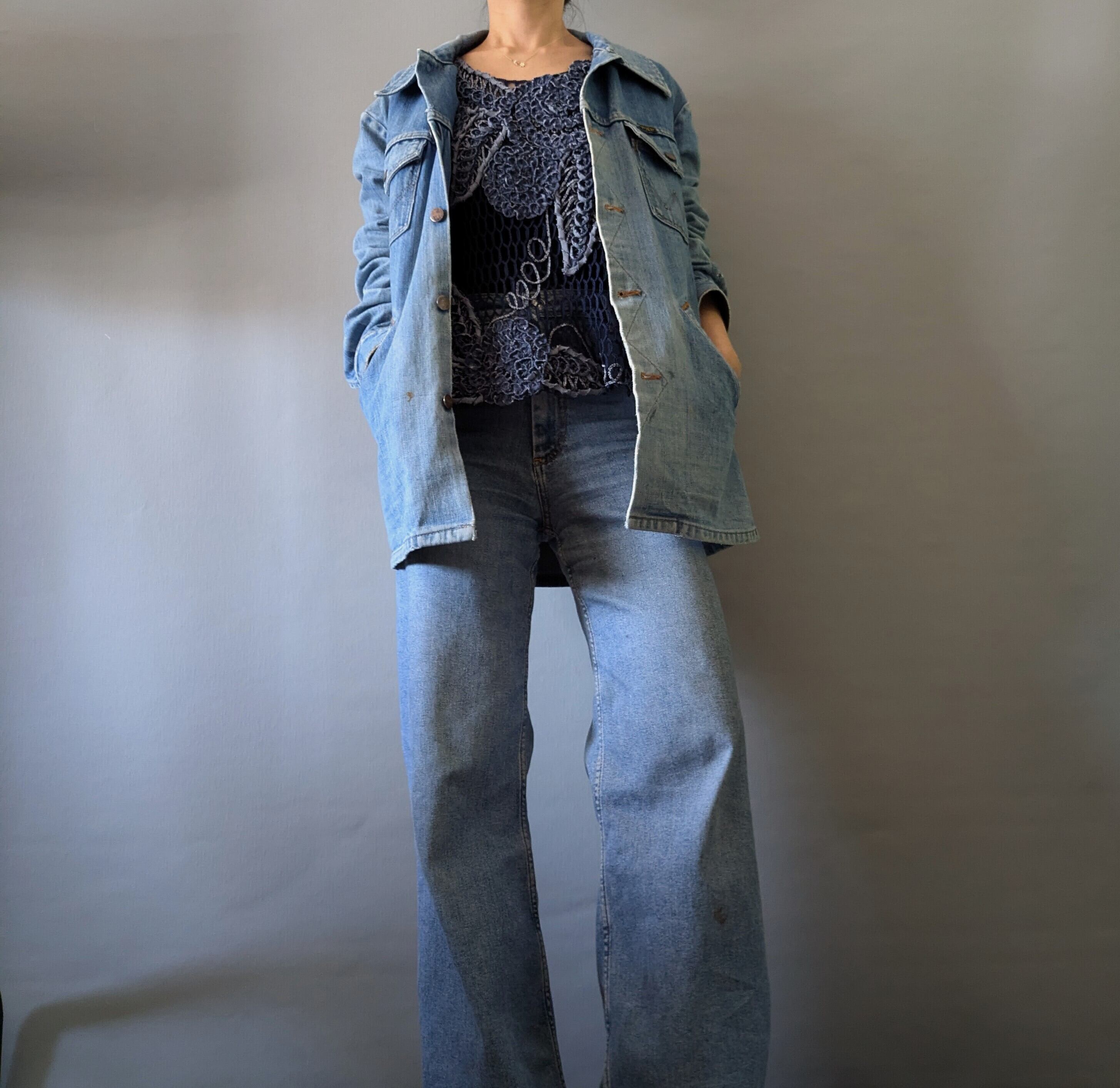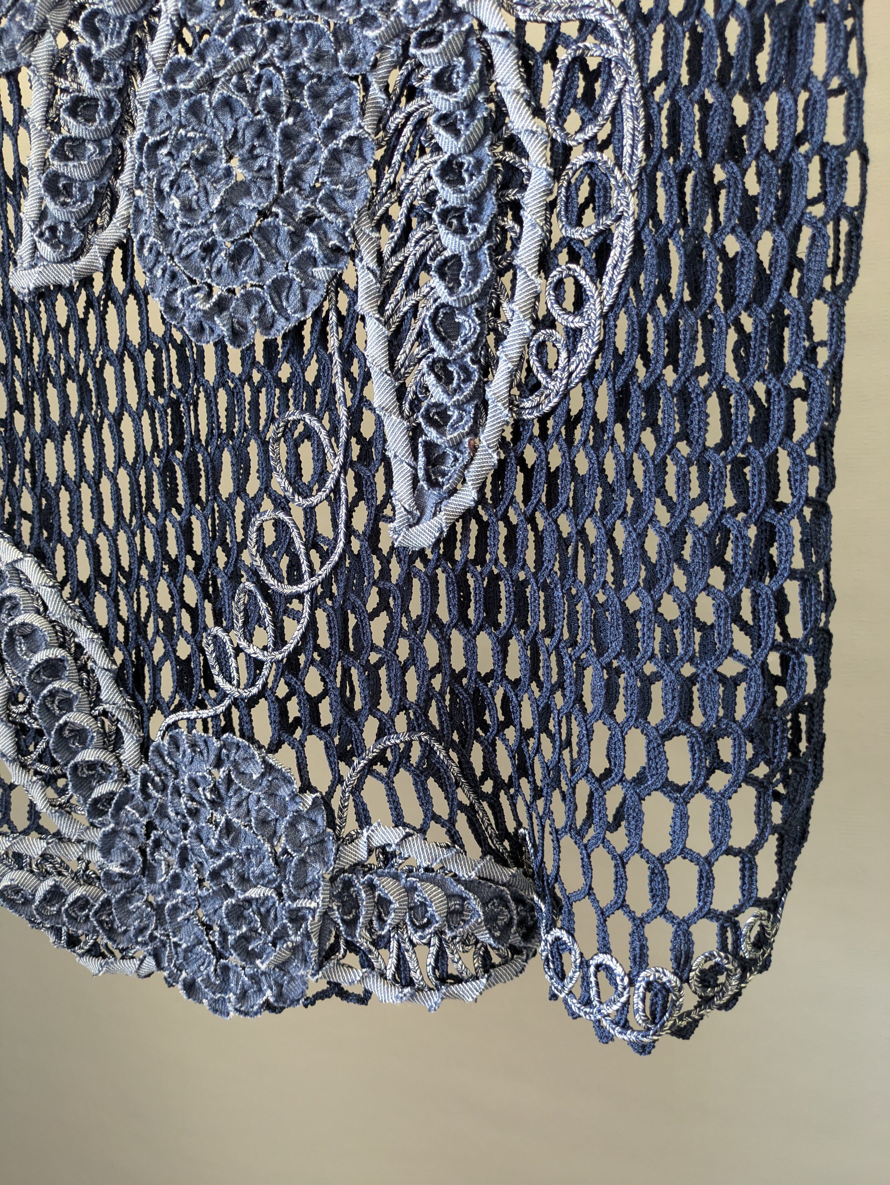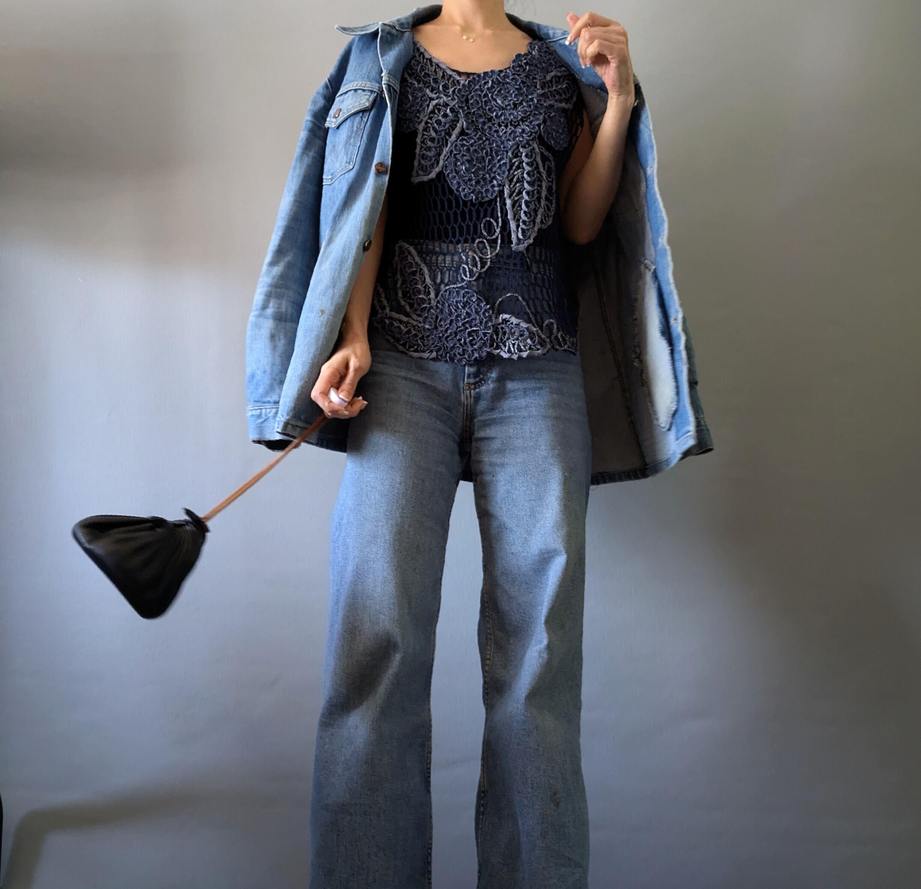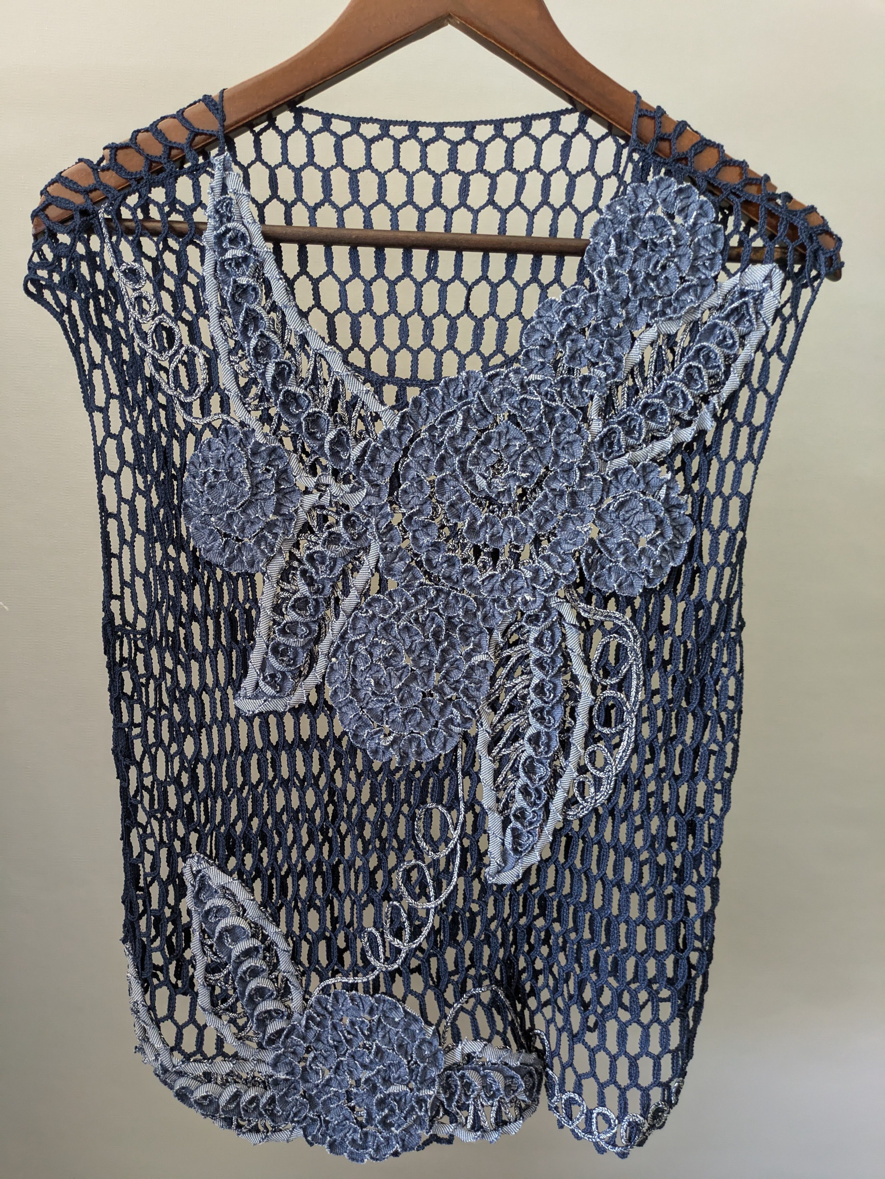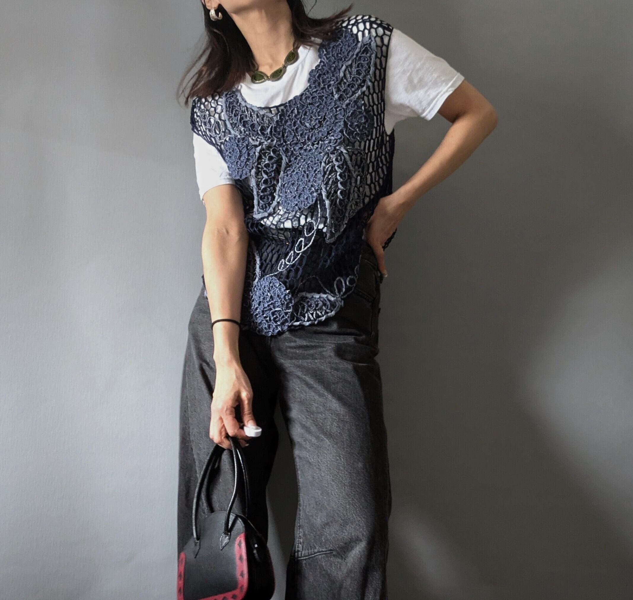 コットンメッシュにデニム刺繍が施された、ユニークでスタイリッシュなメッシュベストです。繊細な刺繍が施されており、クラフト感溢れるデザインが特徴的。シンプルなコーディネートにも華やかさをプラスしてくれます。