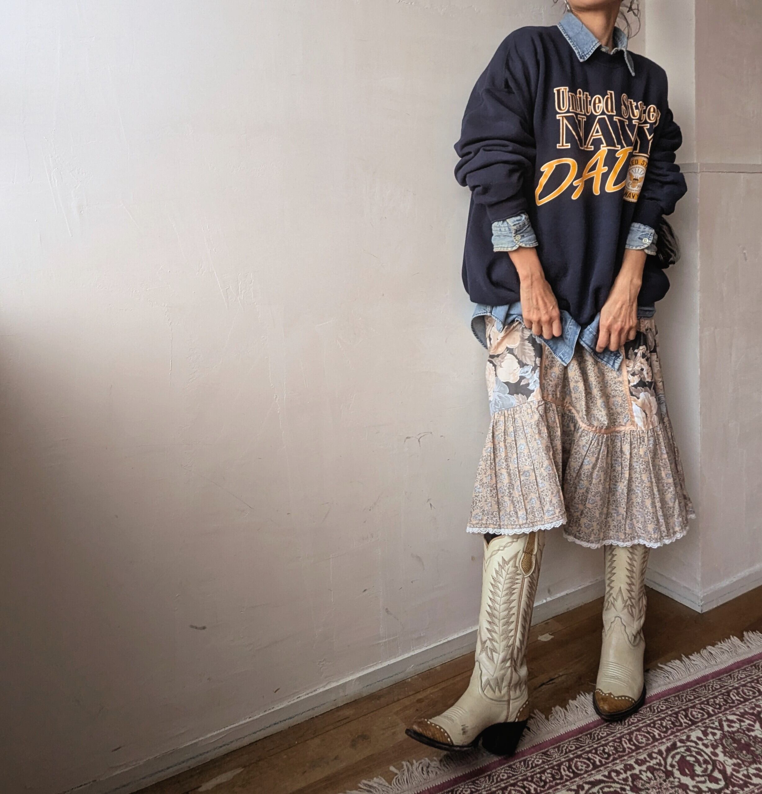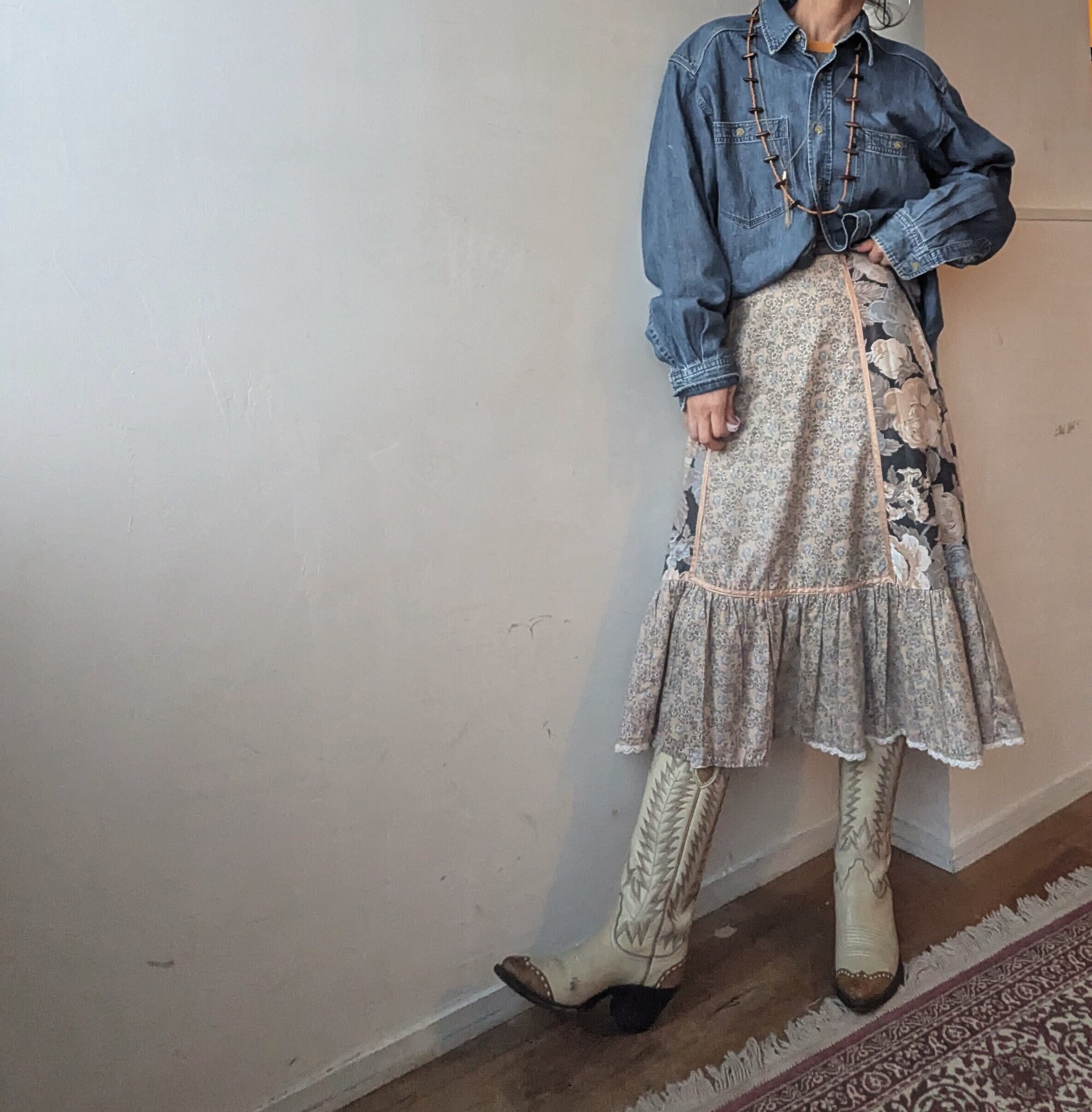 華やかなフラワーパッチワークが魅力のUSA vintage Small floral Patchwork Mermaid skirtです。