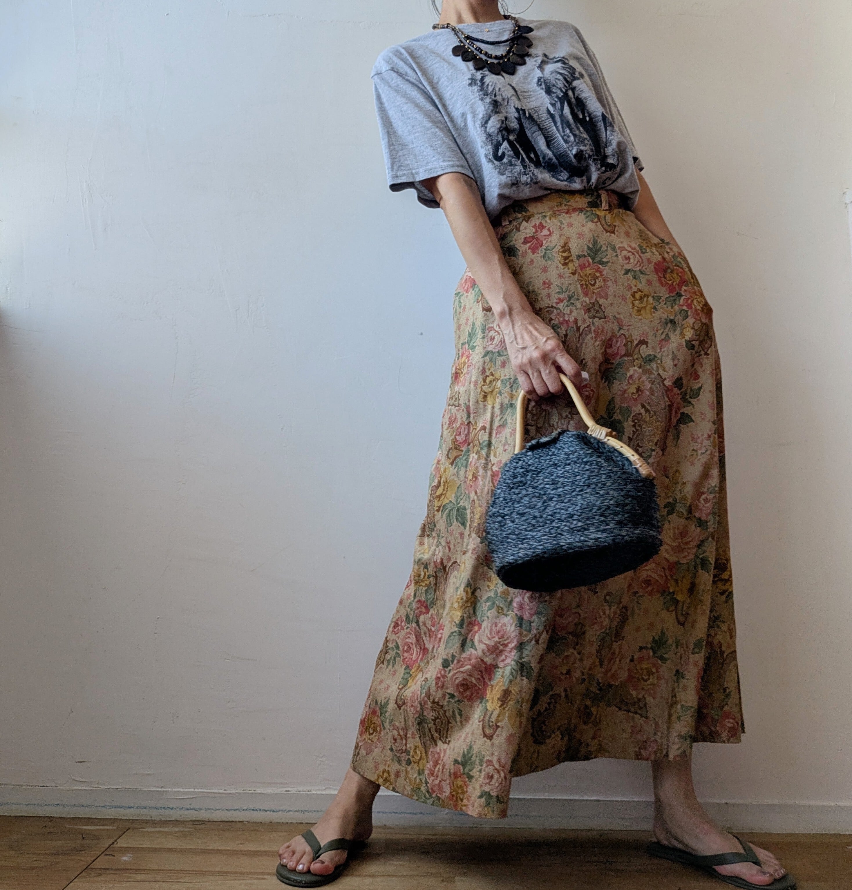 華やかな花柄ですが派手すぎず、日常のコーディネートから特別なお出かけまで幅広く活躍し、様々なトップスと合わせやすく、上品でおちついた雰囲気。