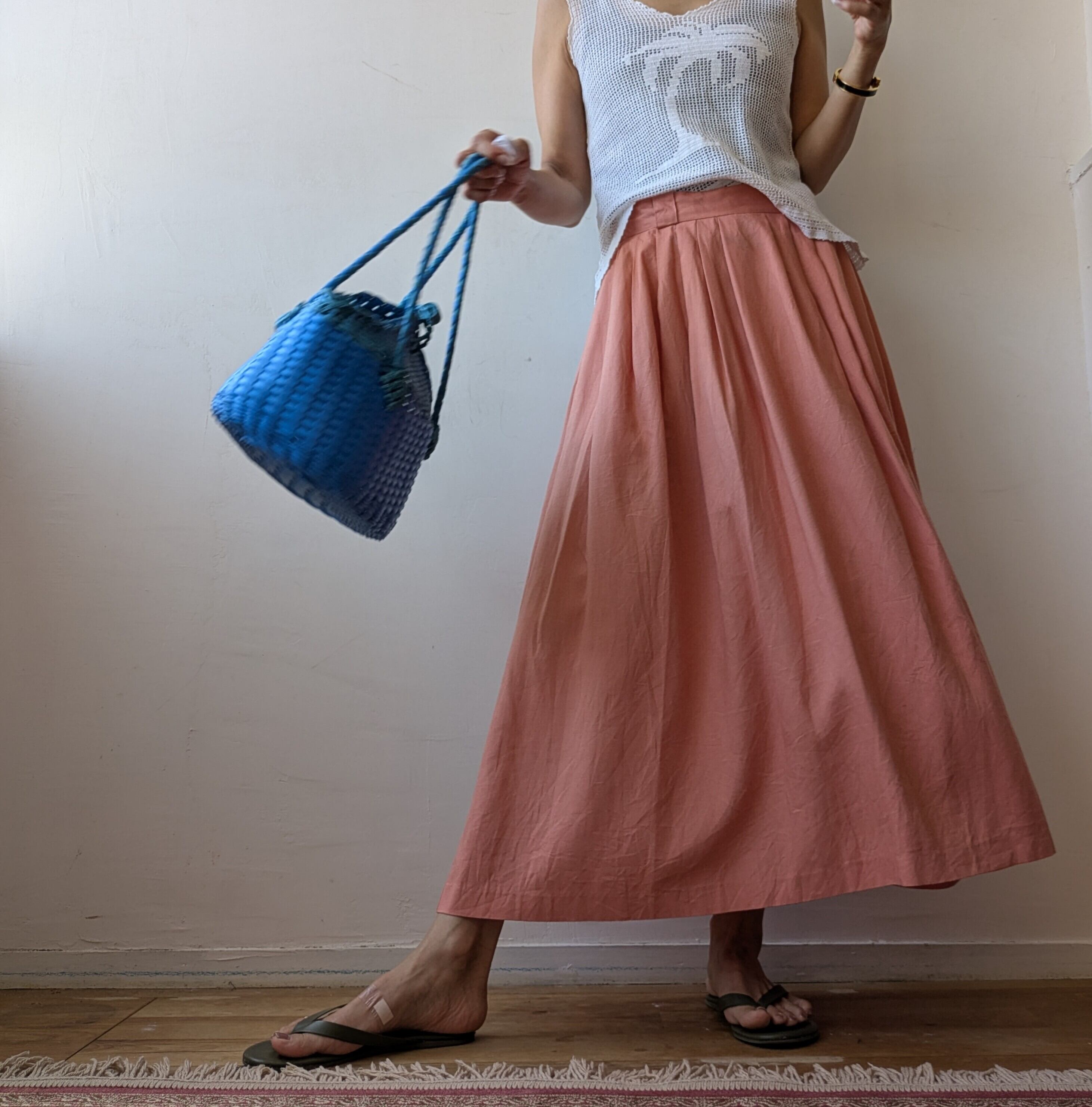 優しく柔らかなサーモンピンクの「Salmon pink Aline flare long skirt」は、女性らしさを引き立てるAラインのふんわりとしたシルエットが特徴です。
