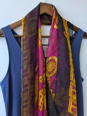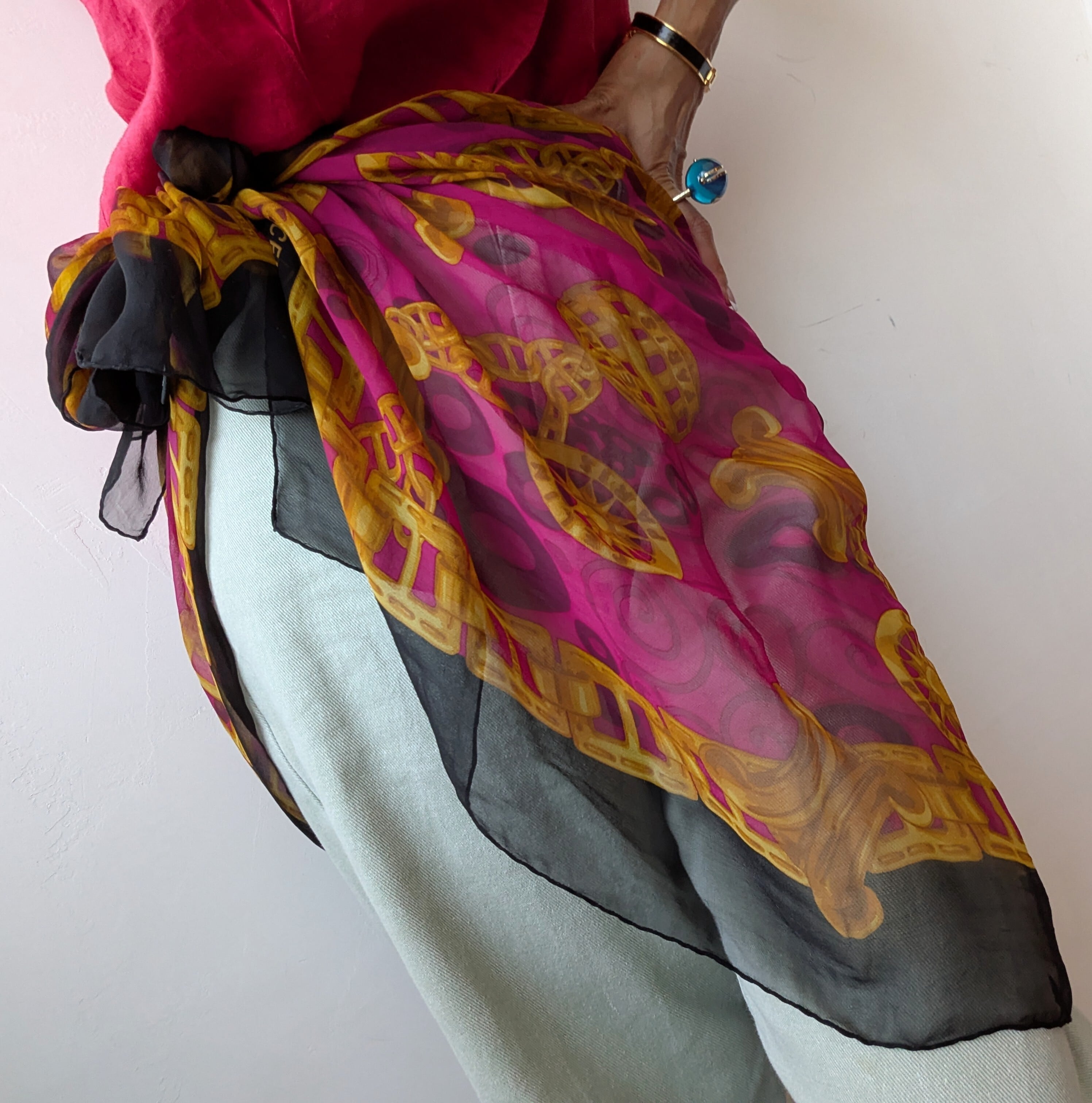 さまざまなアレンジが可能で、腰や、頭や首元に巻いたり、バッグに結びつけたりすることで、コーディネートに華やかさをプラスします。シルクの柔らかな光沢感が、普段の装いをグッと格上げしてくれます。