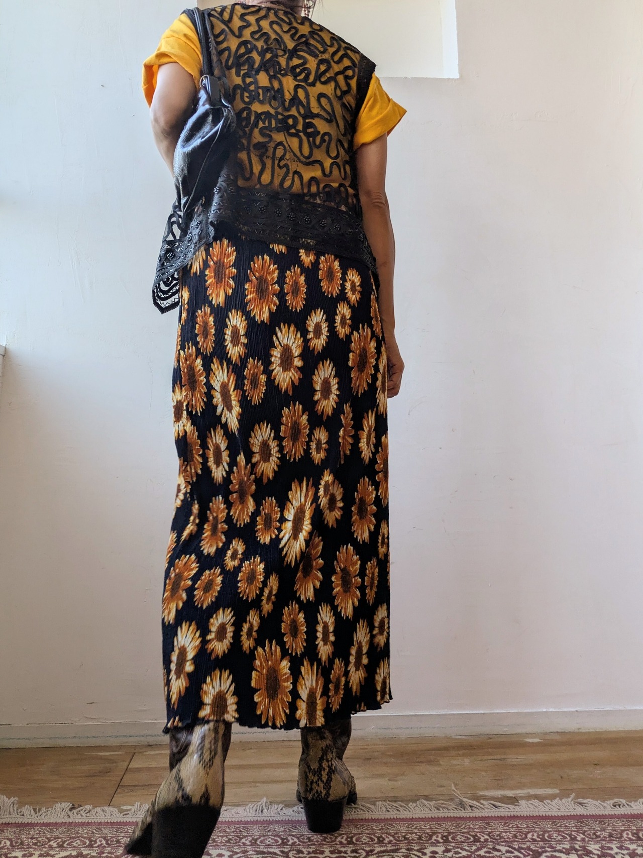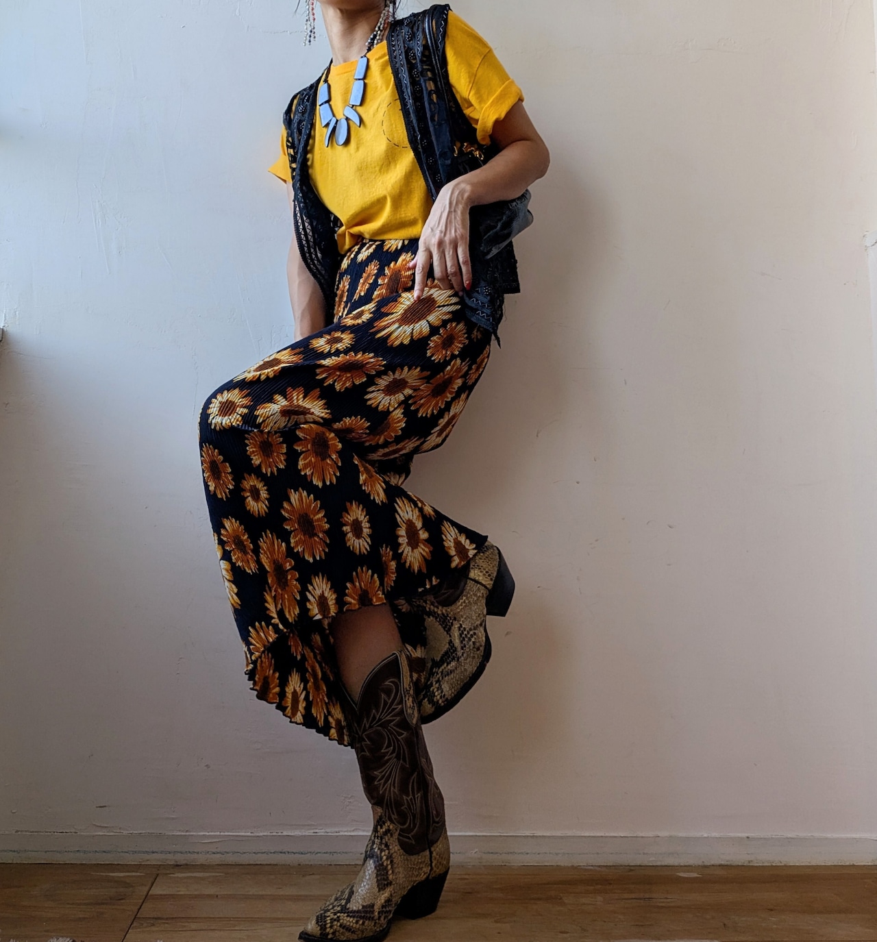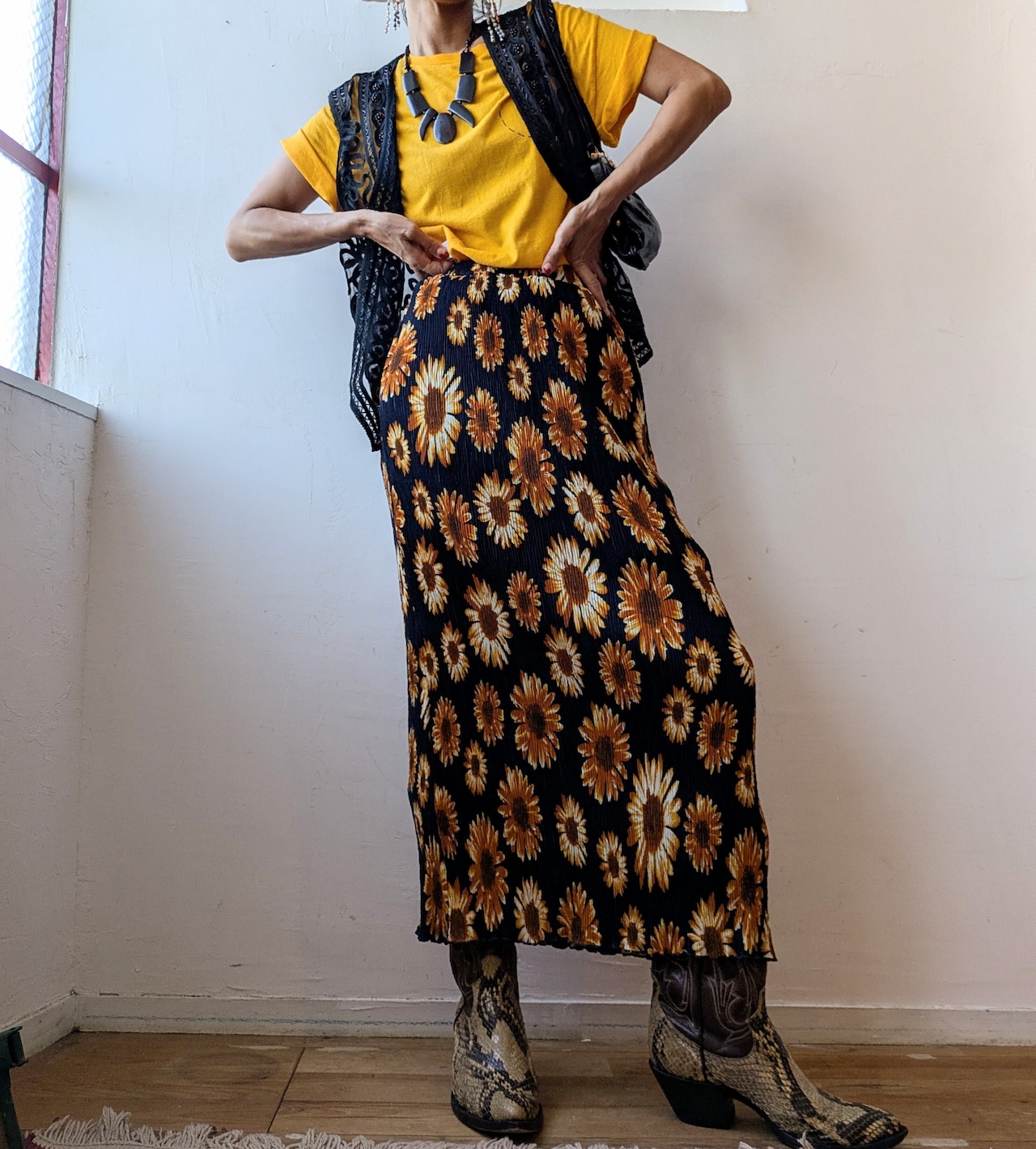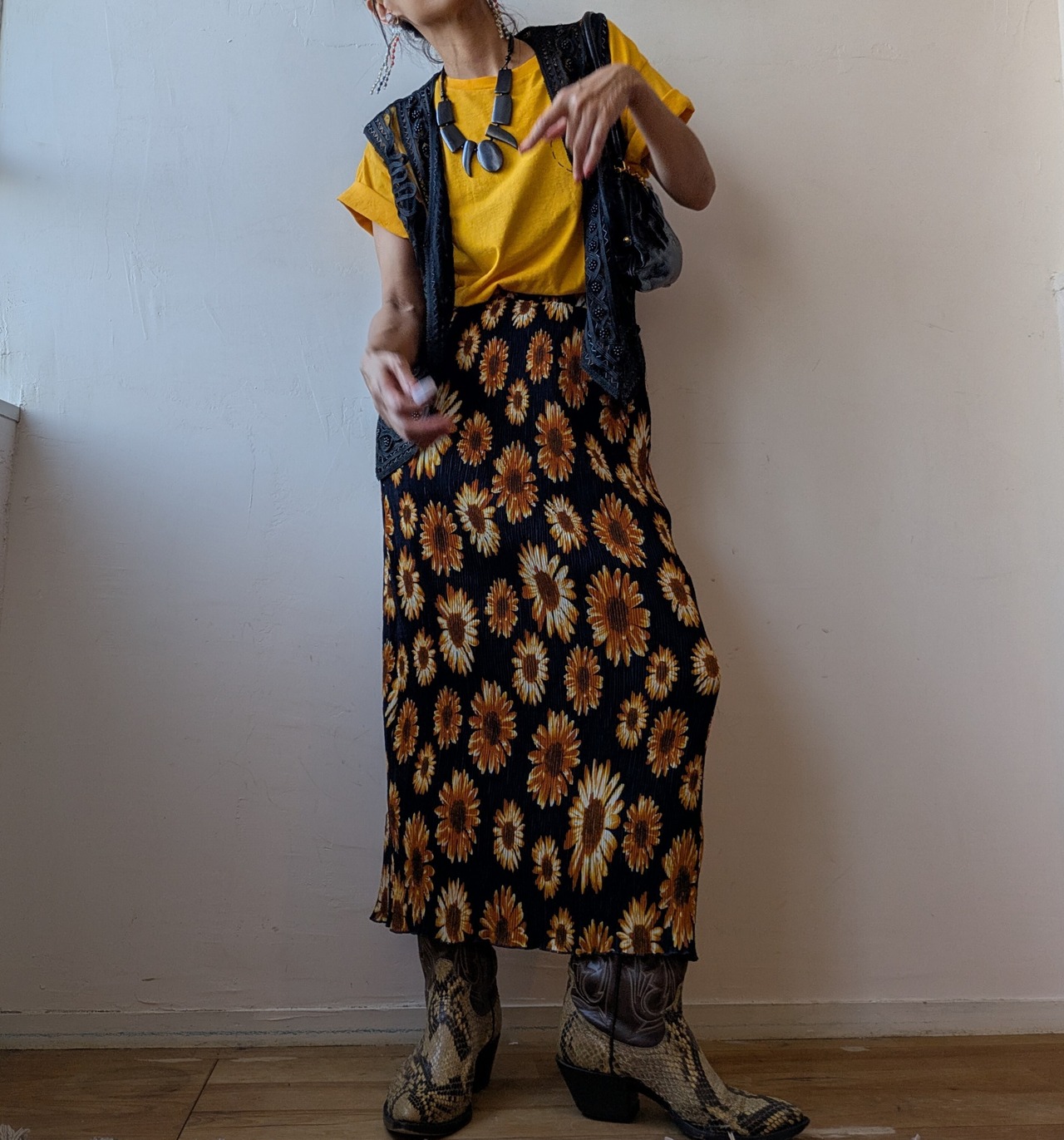 大きな向日葵の柄が、夏らしい、爽やかな印象の「Sunflower shirring long skirt」