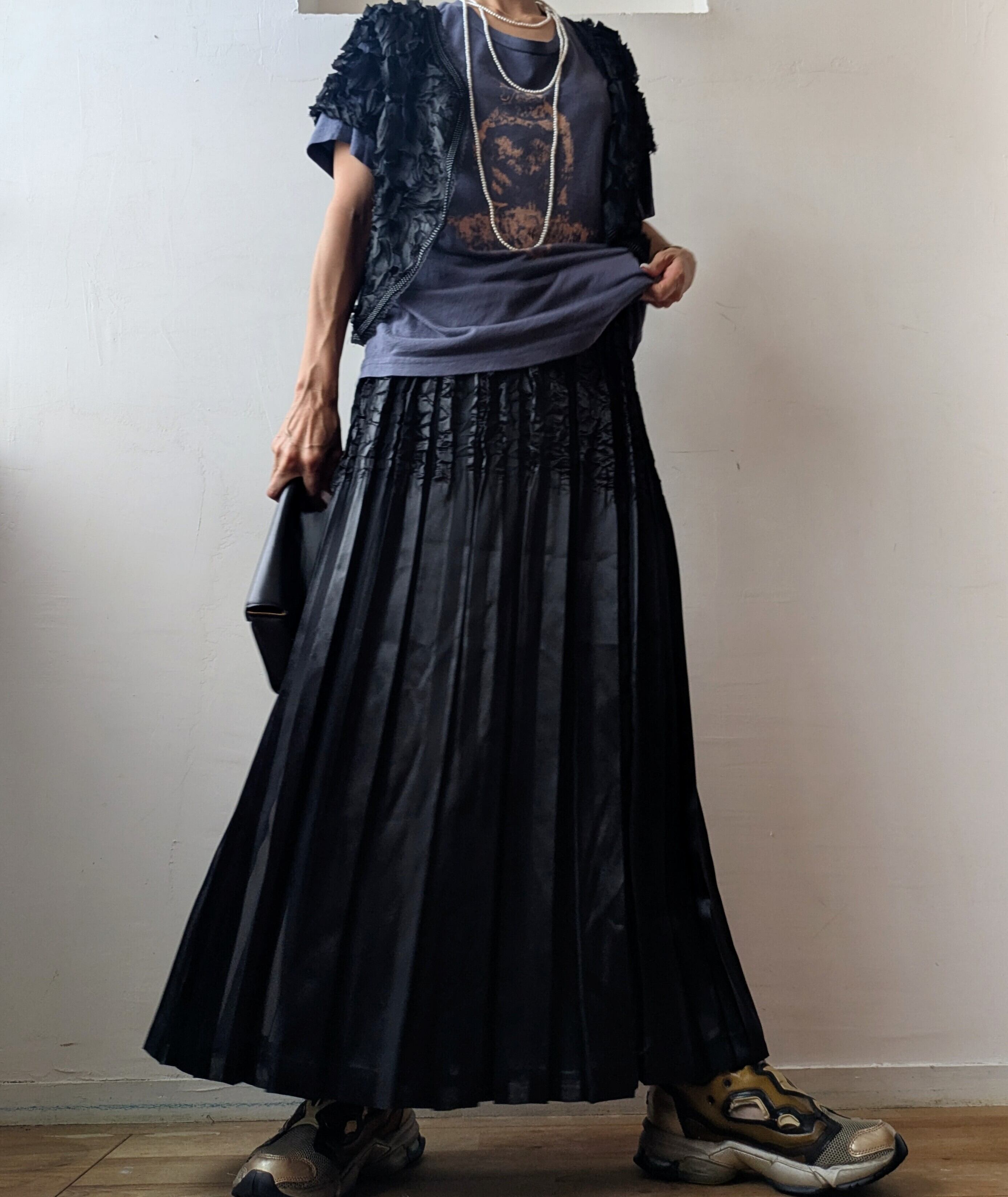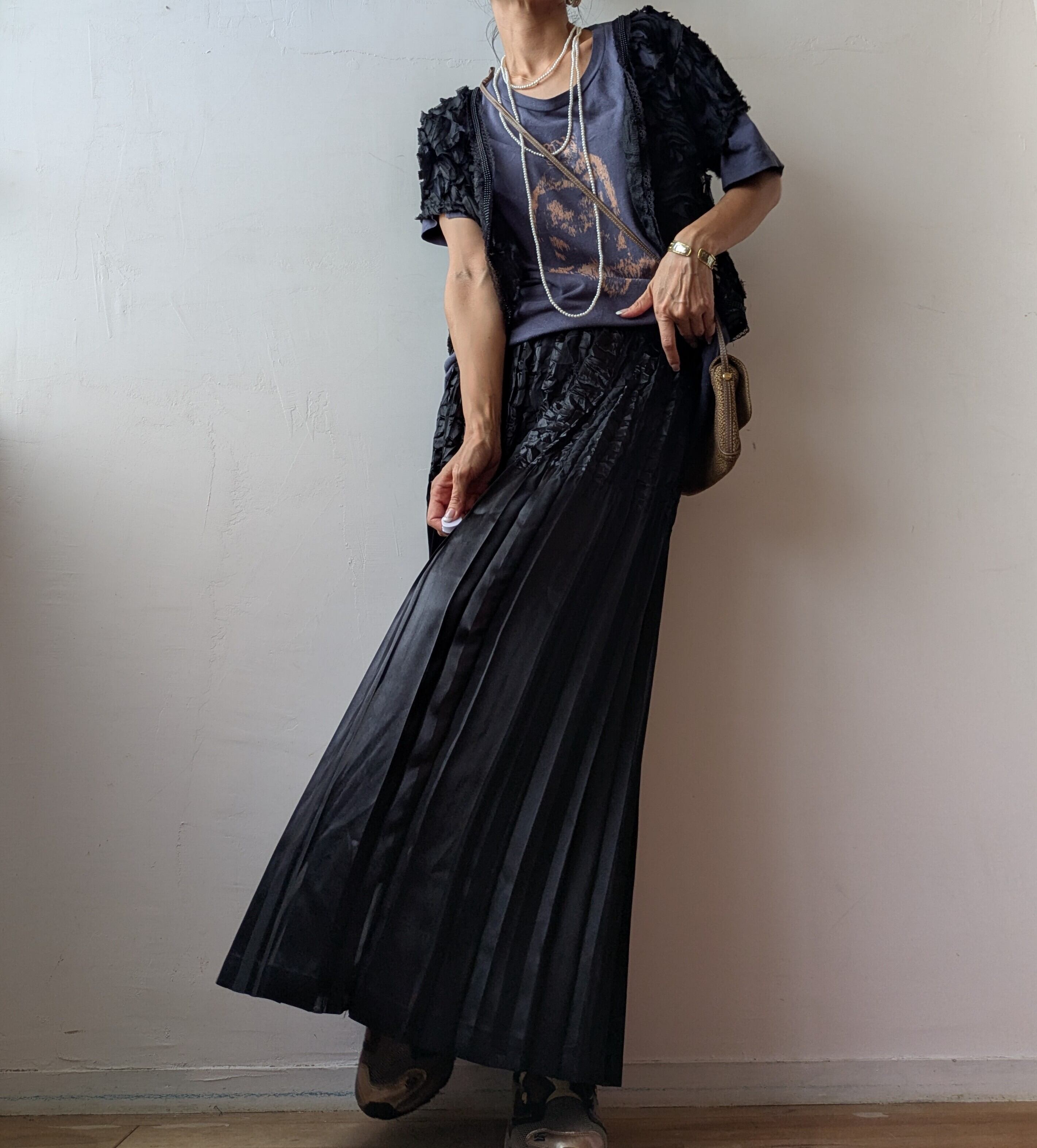 ワンピースや、スラックスパンツなど落ち着いた大人アイテムとも好相性。