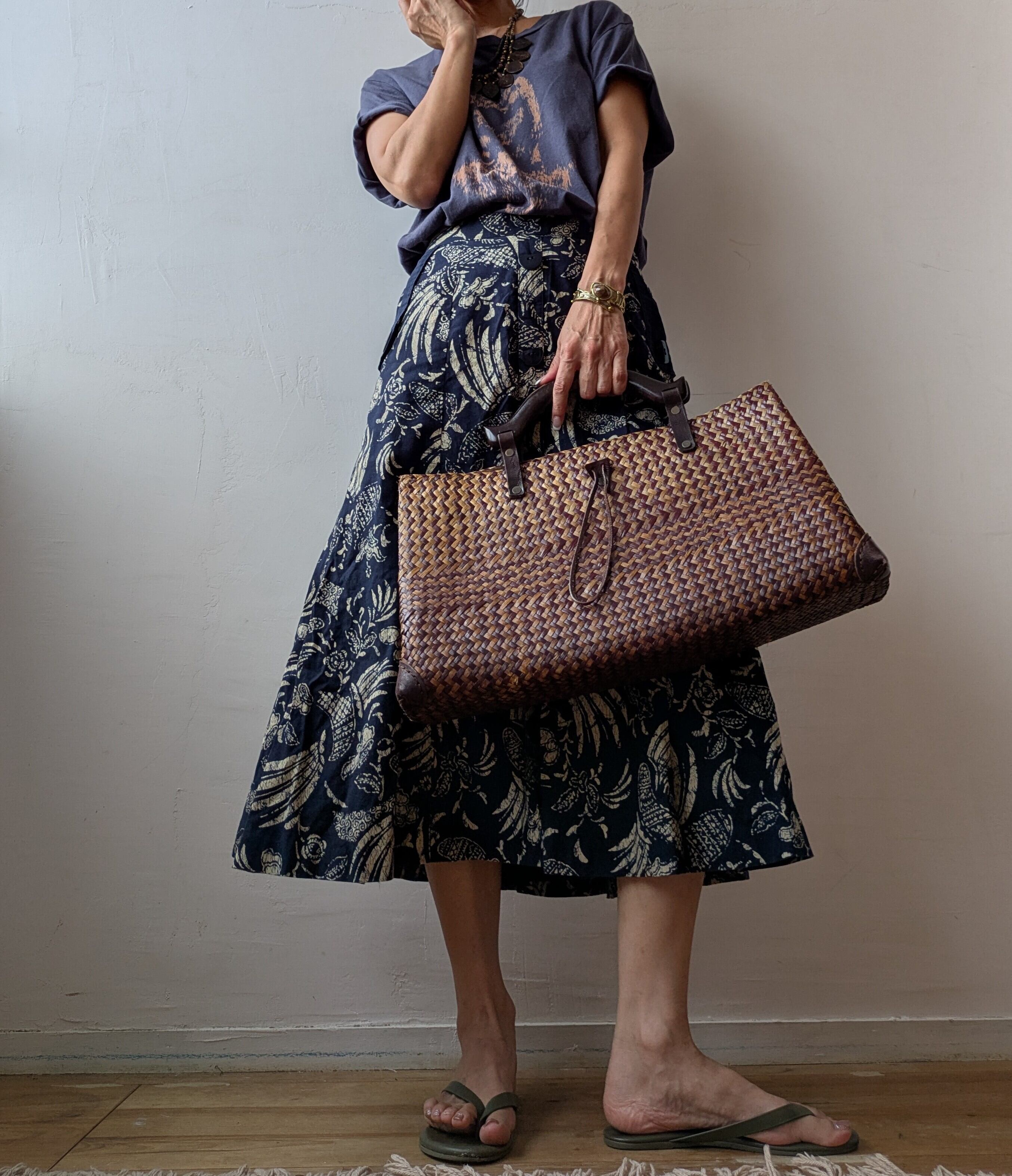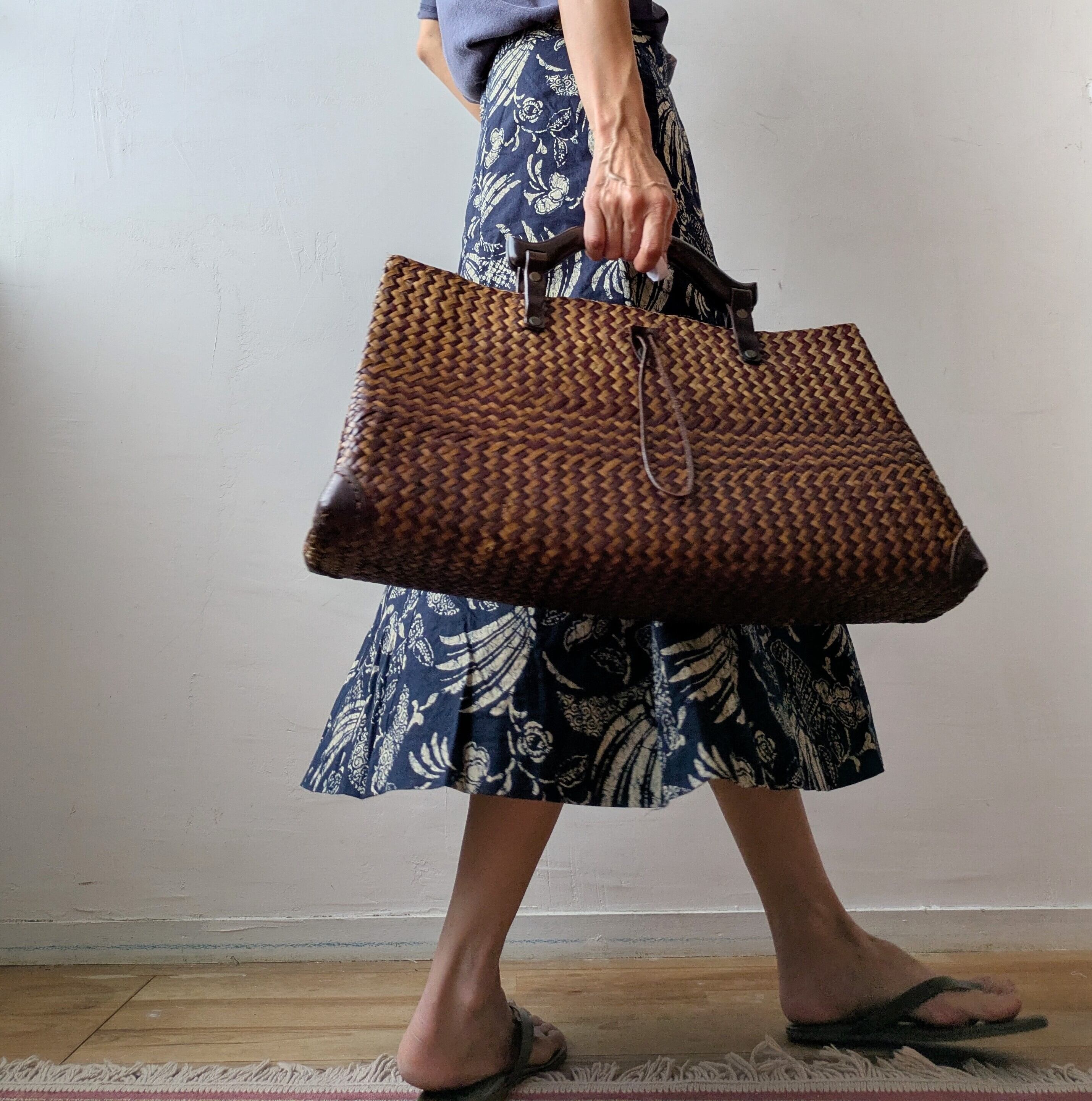 ウッドハンドルに天然素材のラタンと細部にはレザーを使用したこのバッグは、独特のテクスチャーと温かみのある風合いが特徴です。カジュアルなデニムスタイルにも、特別な日のコーディネートにもぴったりです。