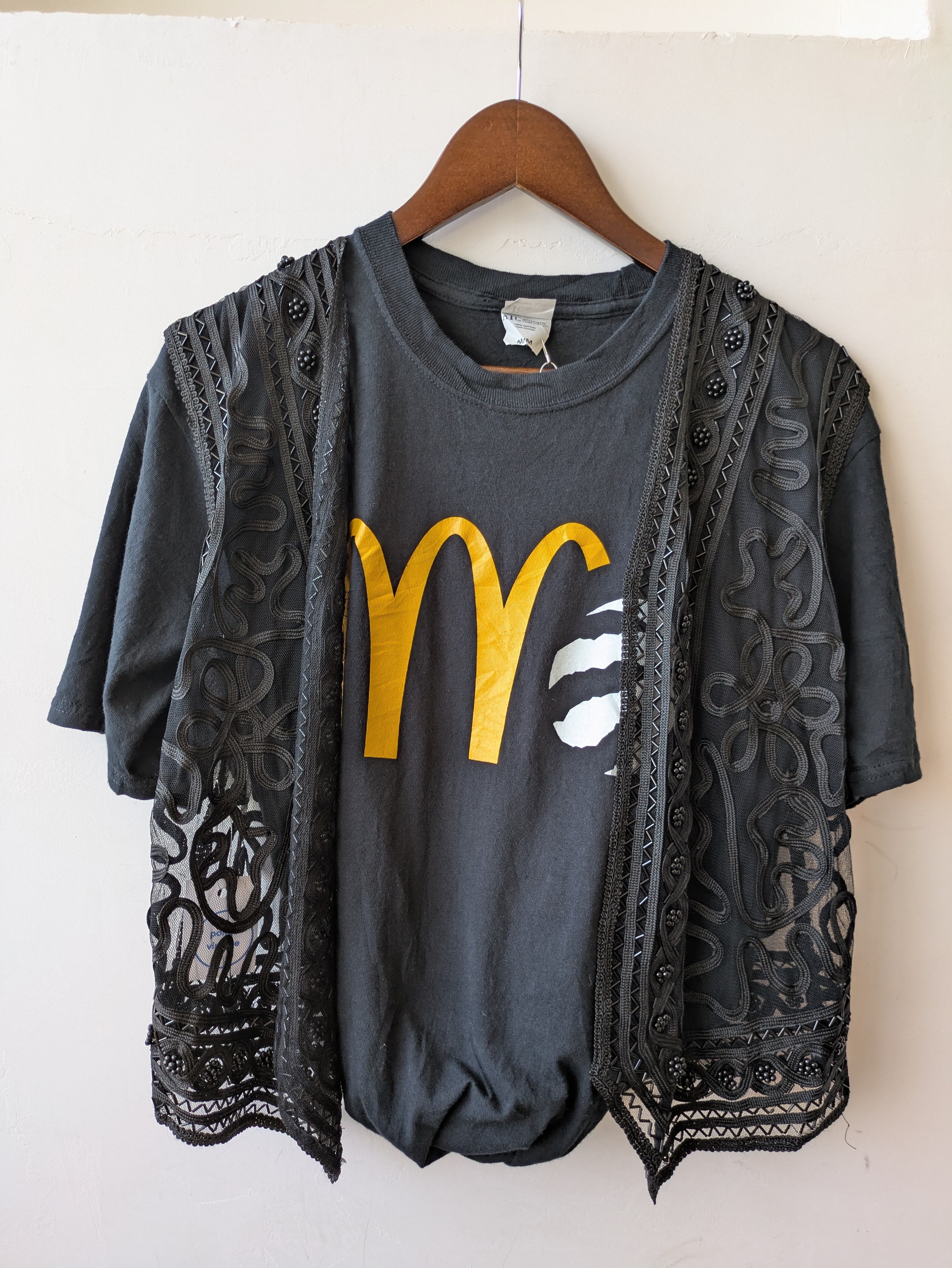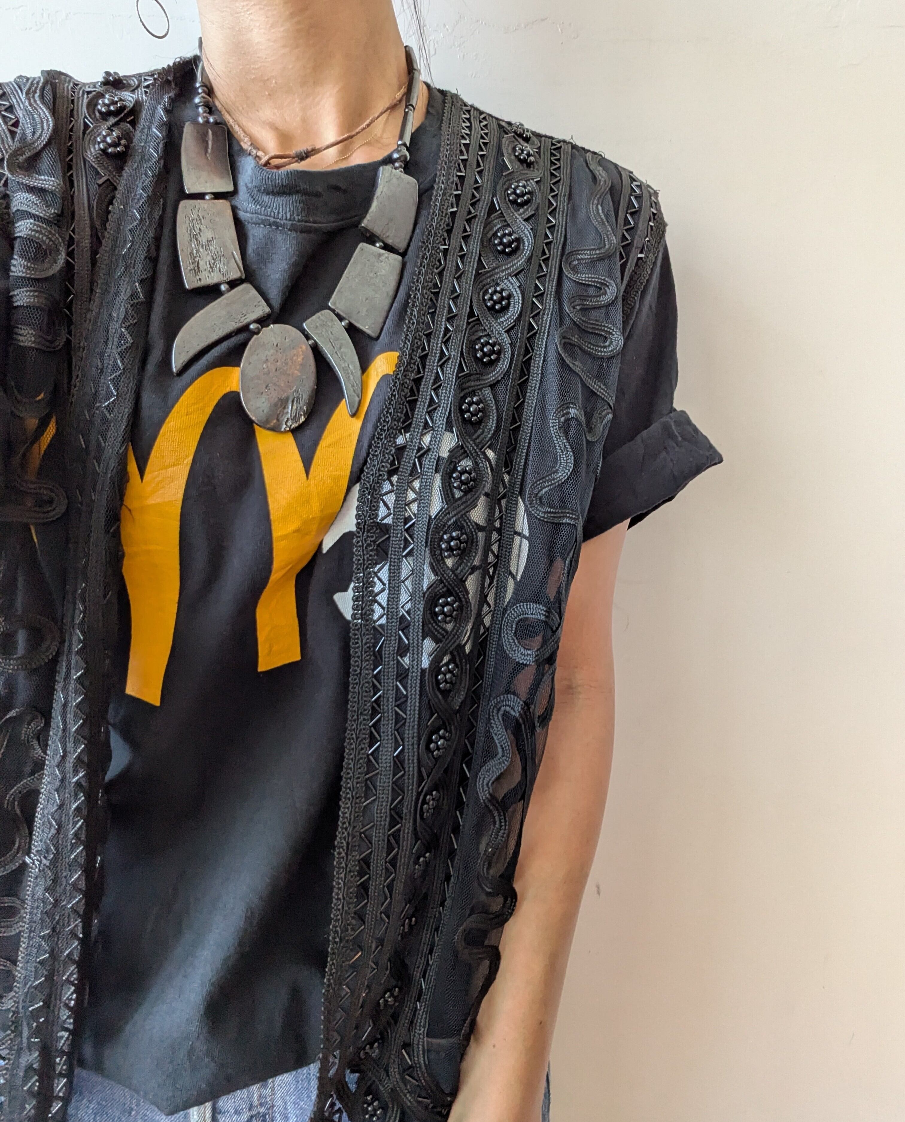 やわらかなコットン素材で、ゆったりとしたシルエットが、リラックスして着用できます。ブラックにイエローのデザインが映える個性的な1着です