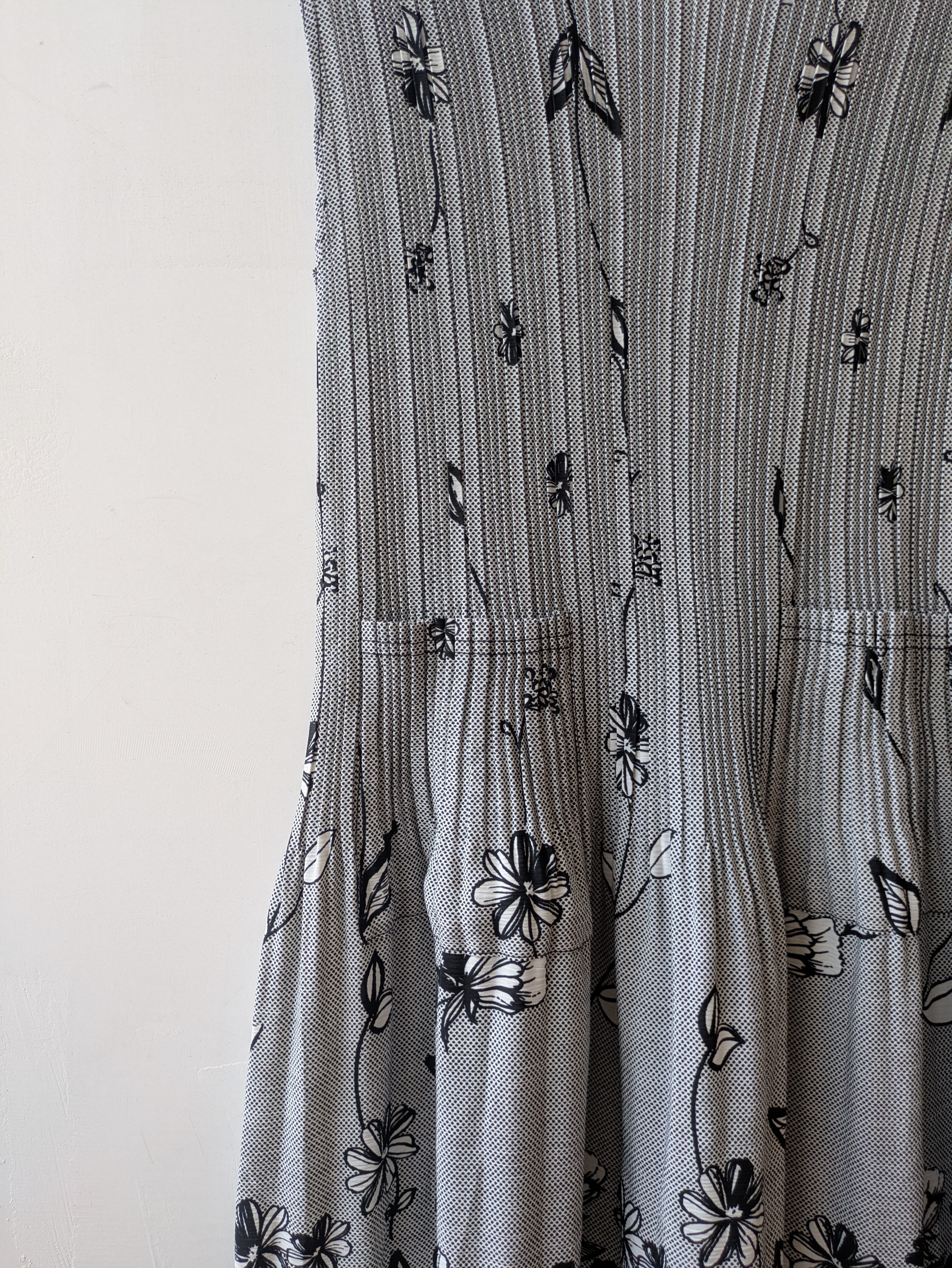 エレガントなモノトーンフラワーデザインが魅力のShirring monotone flower design dress。柔らかな素材とシャーリング加工によるストレッチ感が特徴で、華やかなデザインながら、モノトーンカラーで落ち着いた雰囲気でレディなスタイルに仕上げてくれます。