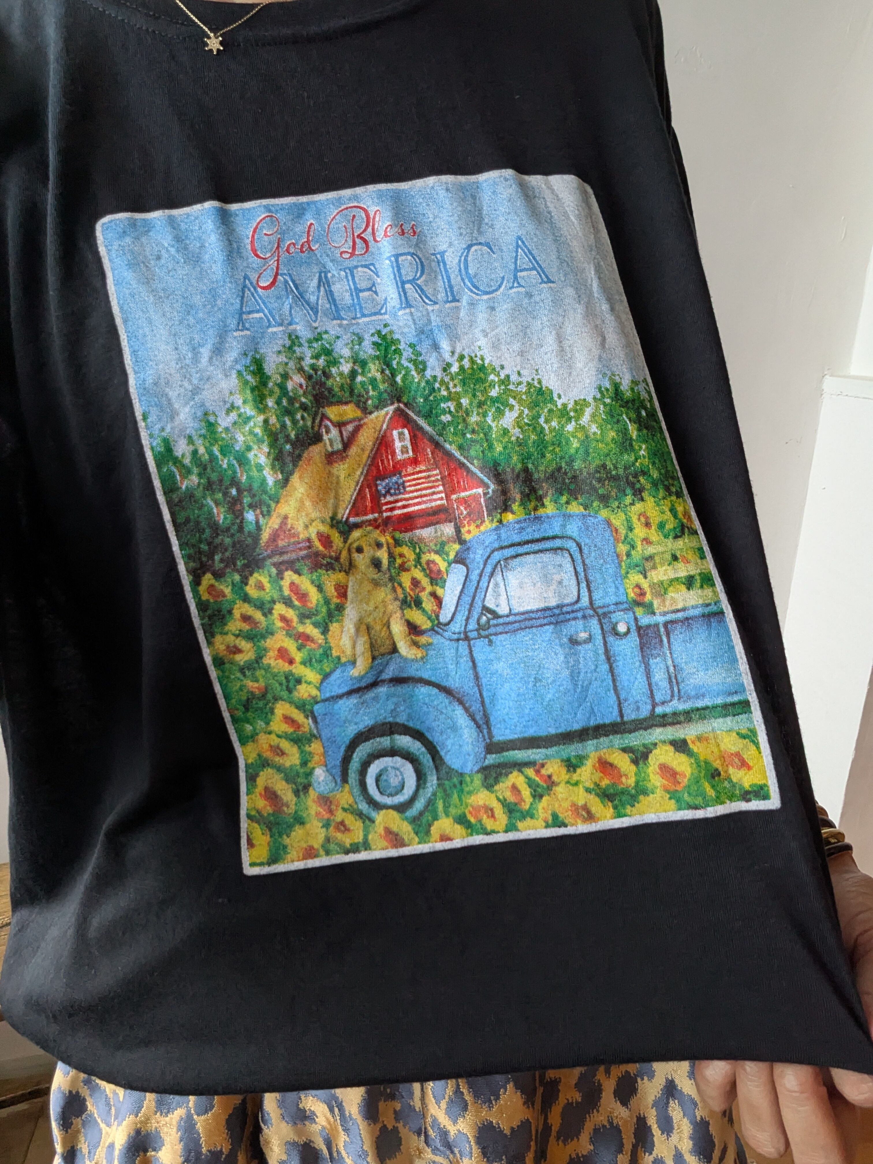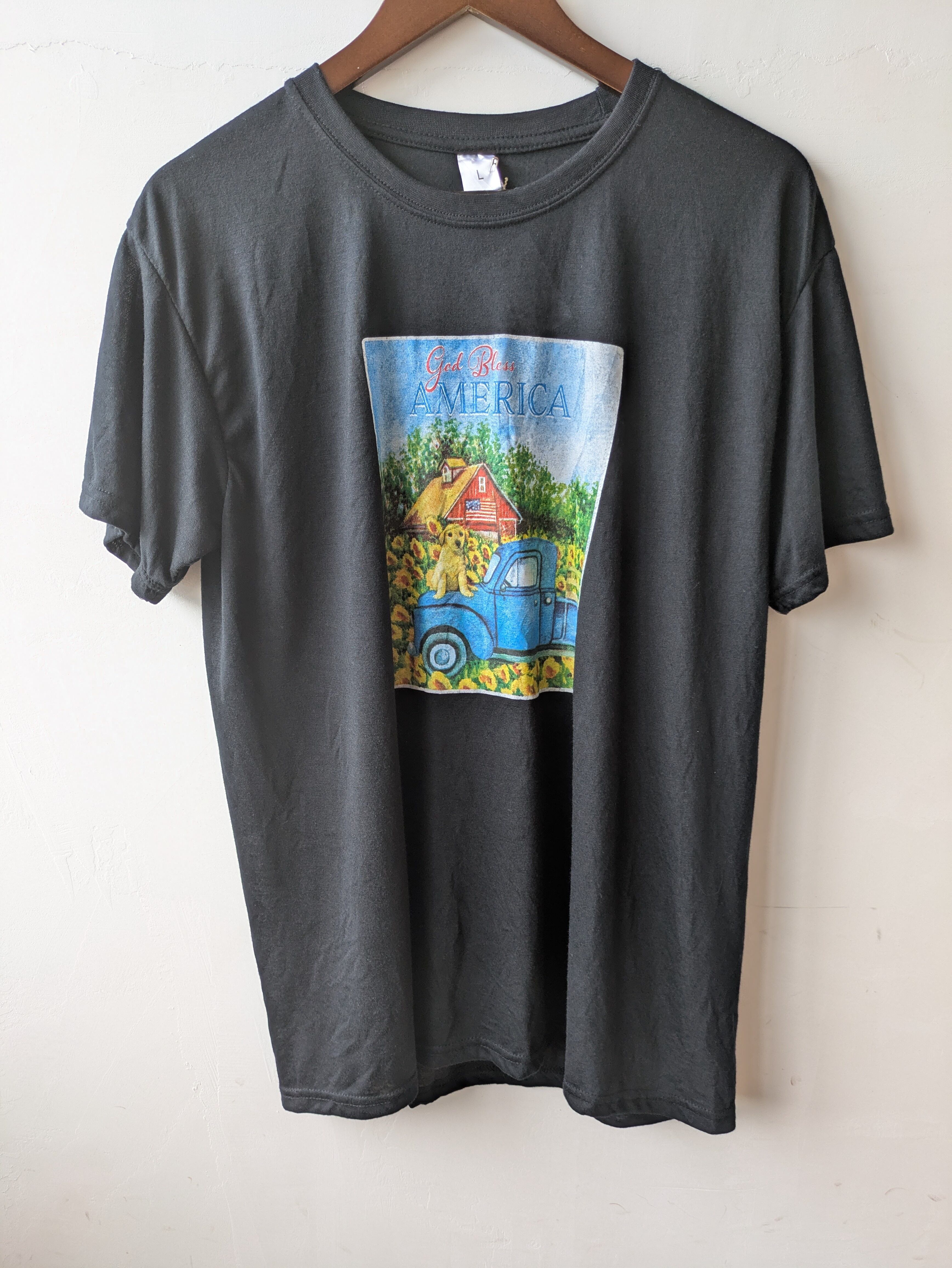 かわいらしいラブラドールと向日葵畑の風景が絵画のように素敵なUSA Tshirt