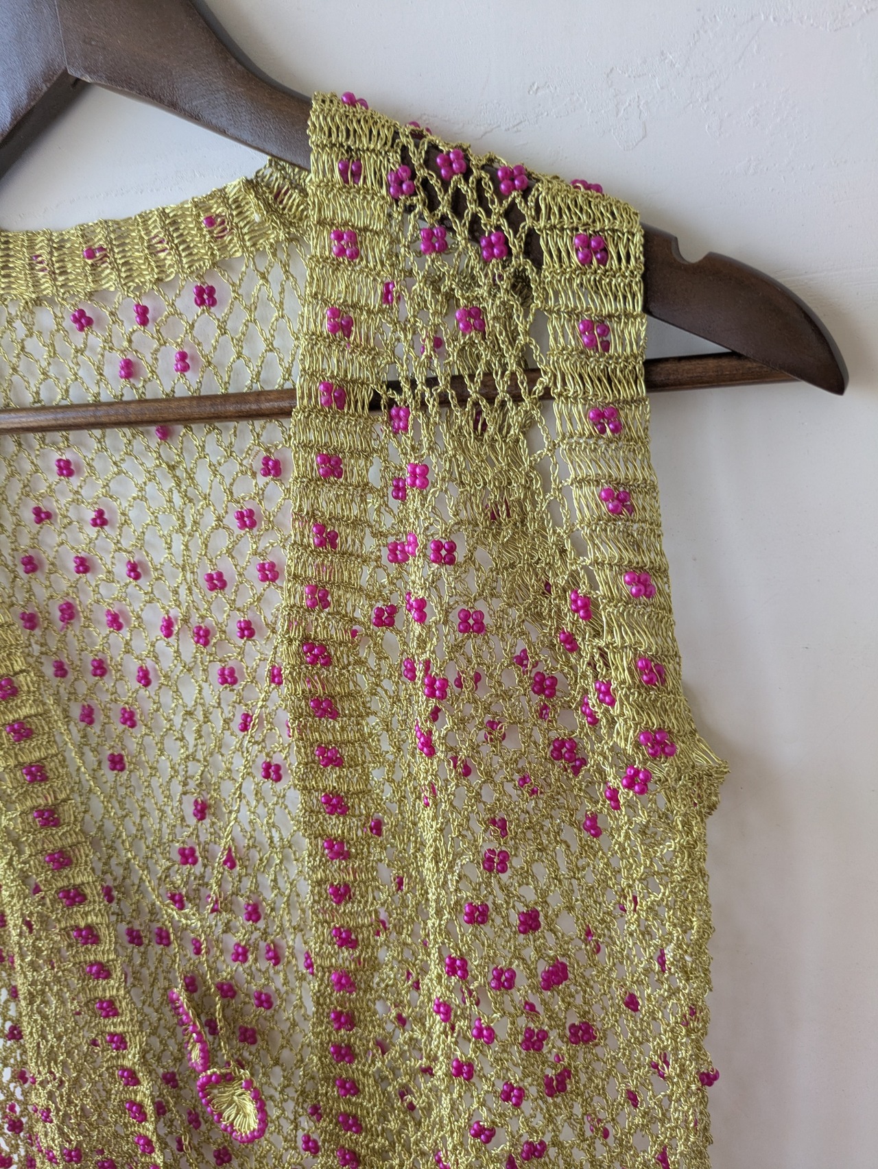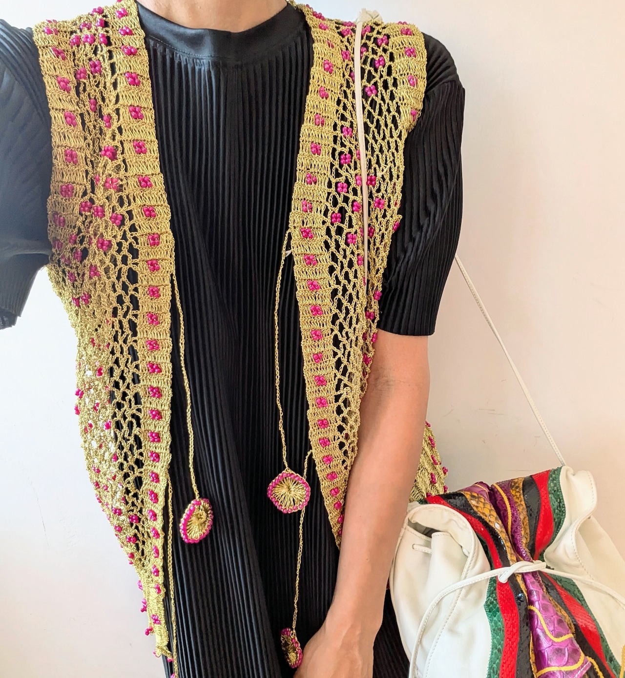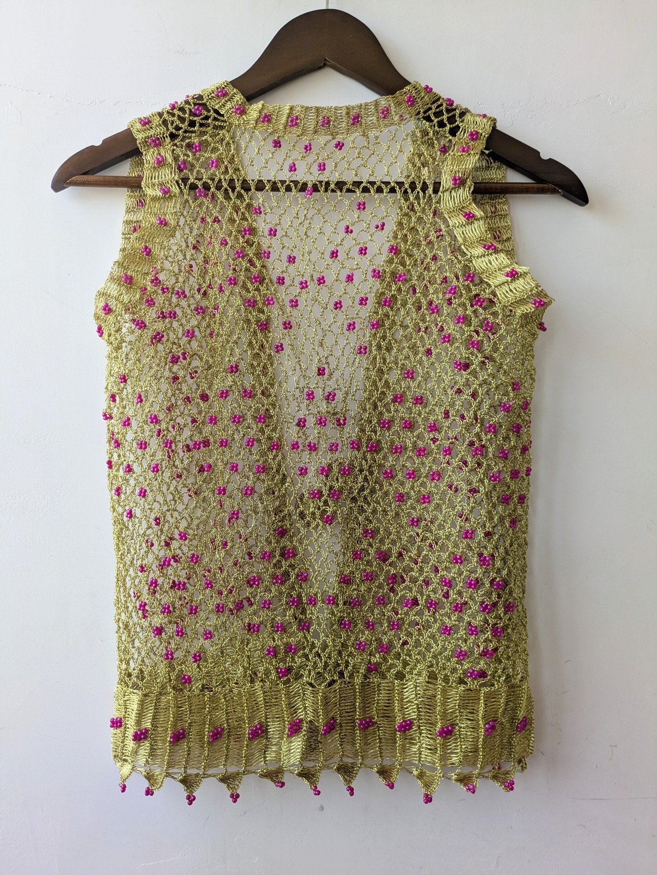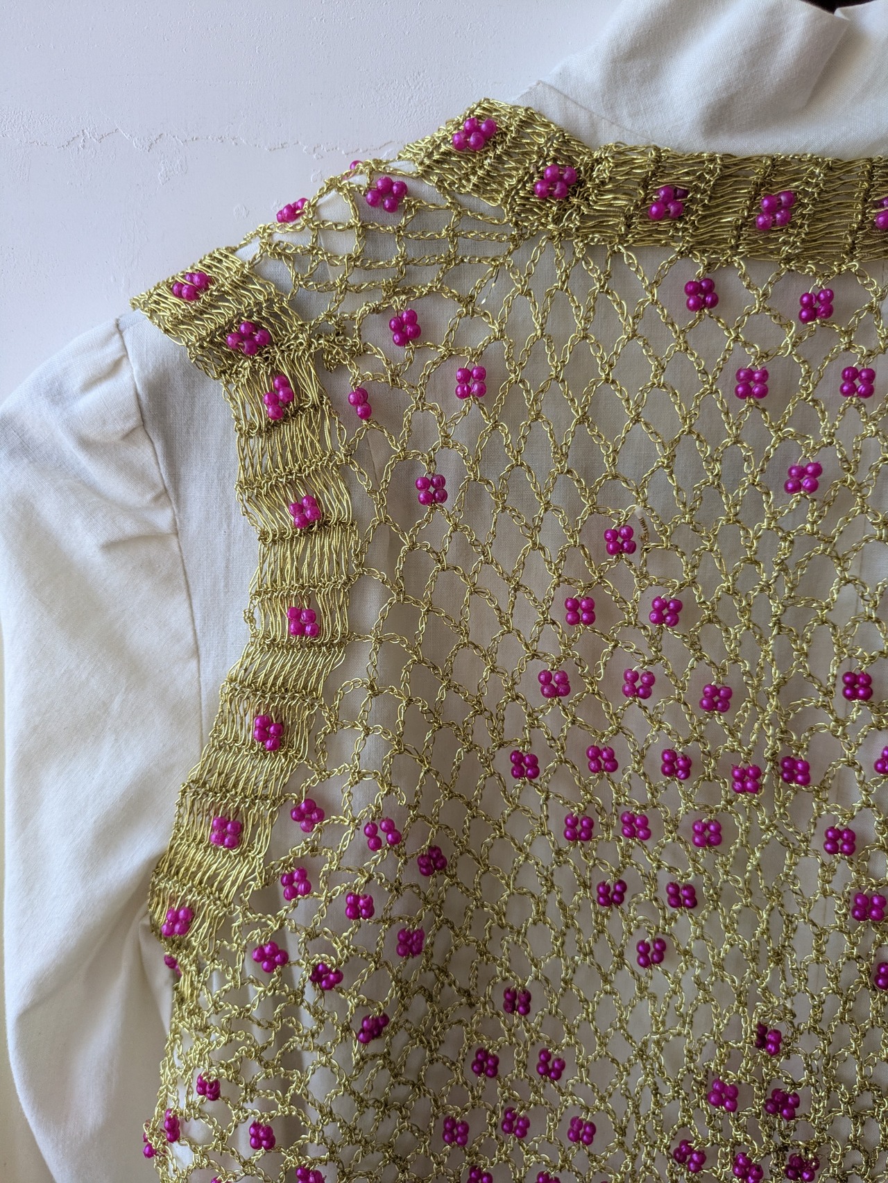 ゴールドの特殊な糸で編まれたメッシュビーズデザインがおしゃれなベストです。