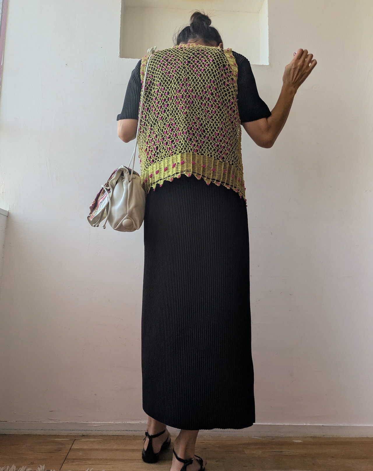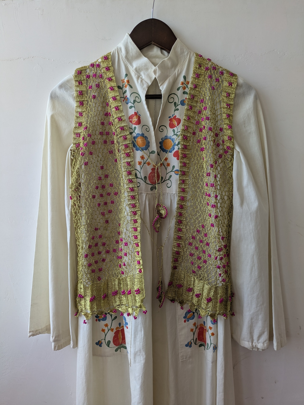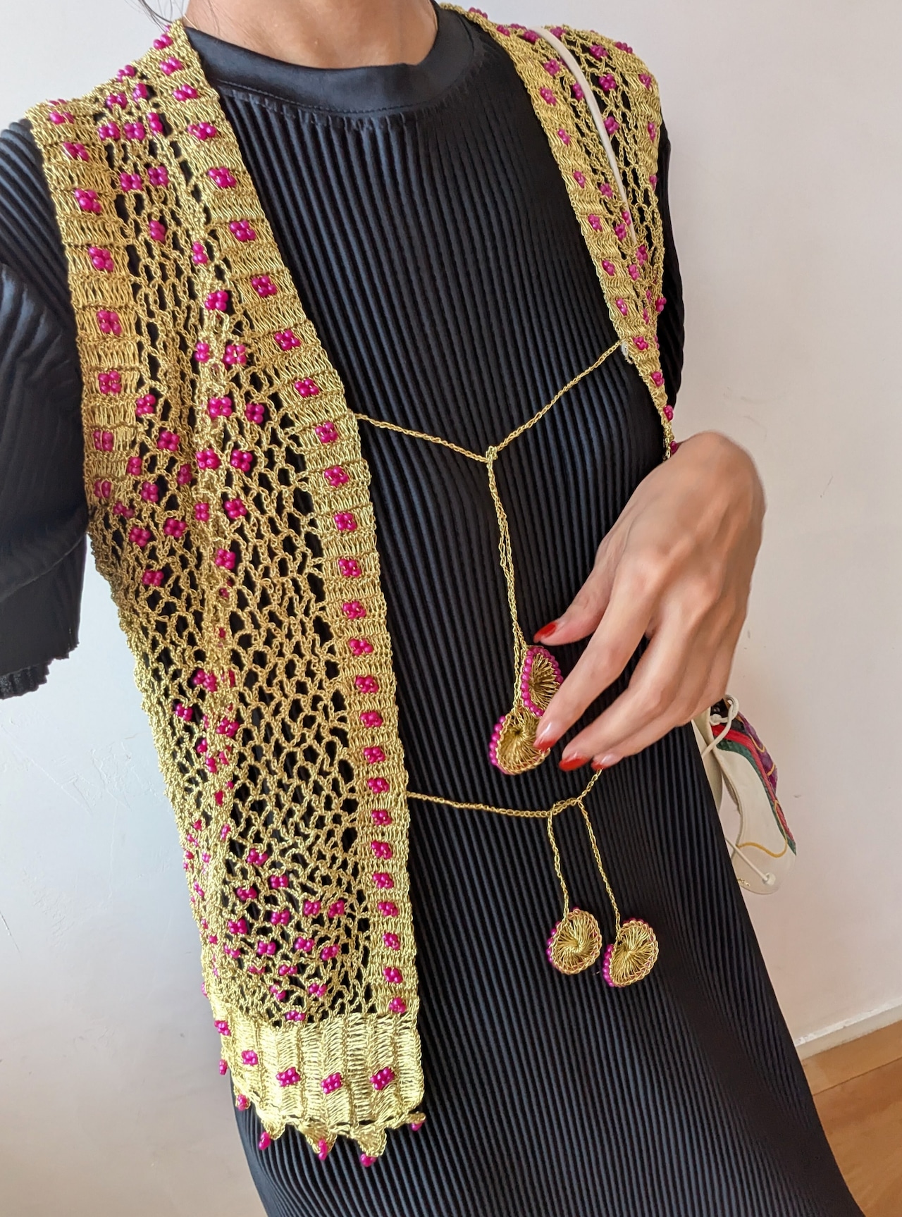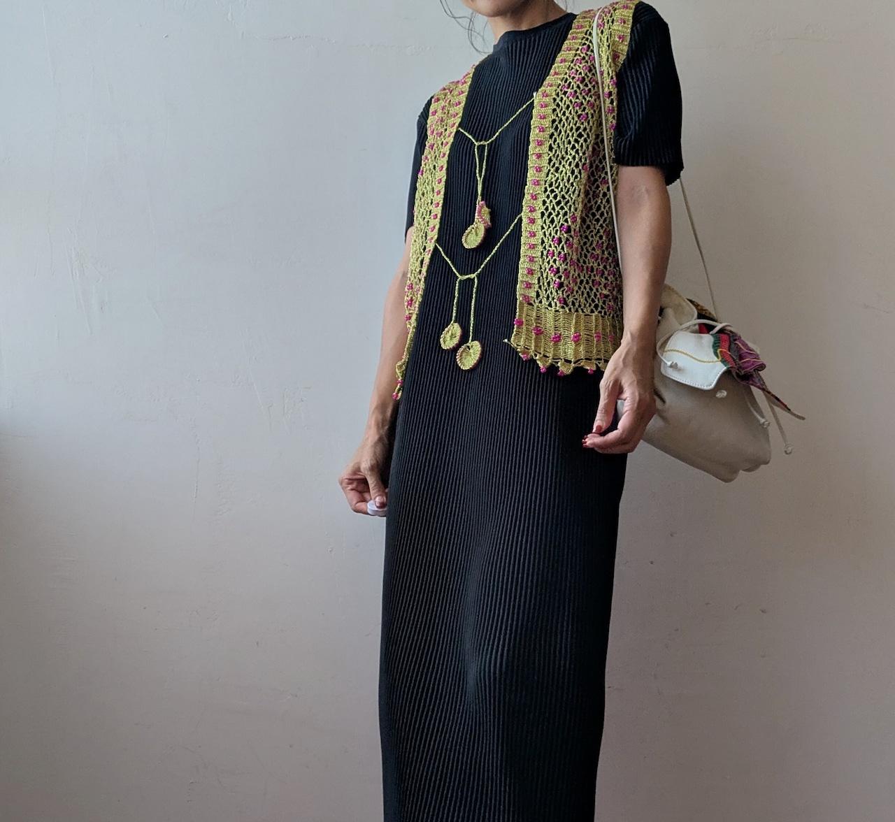 ゴールドの特殊な糸で編まれたメッシュビーズデザインがおしゃれなベストです。