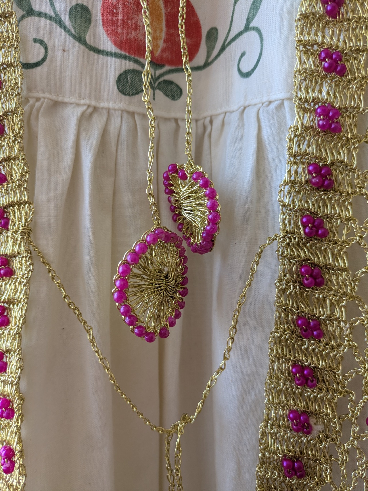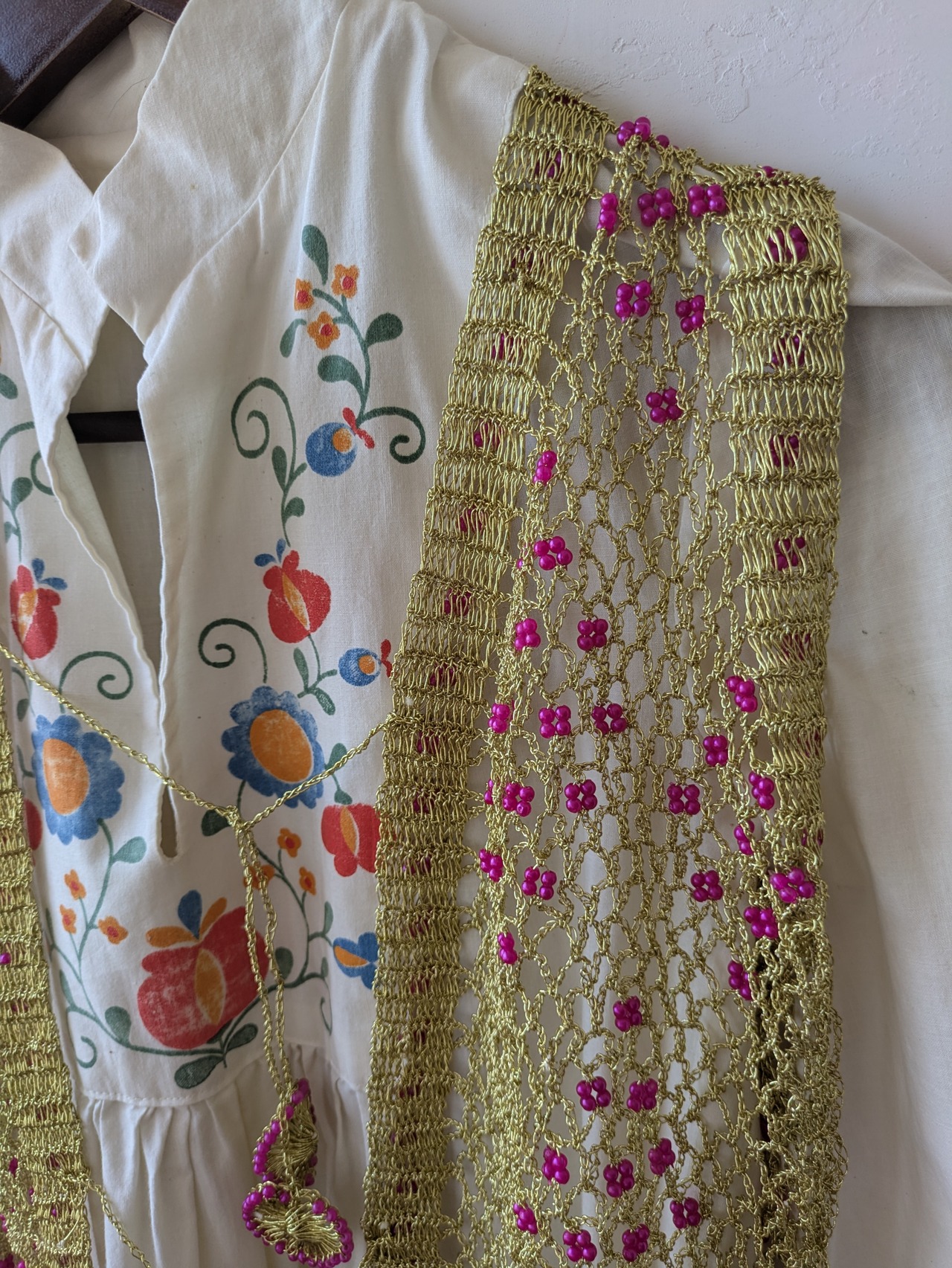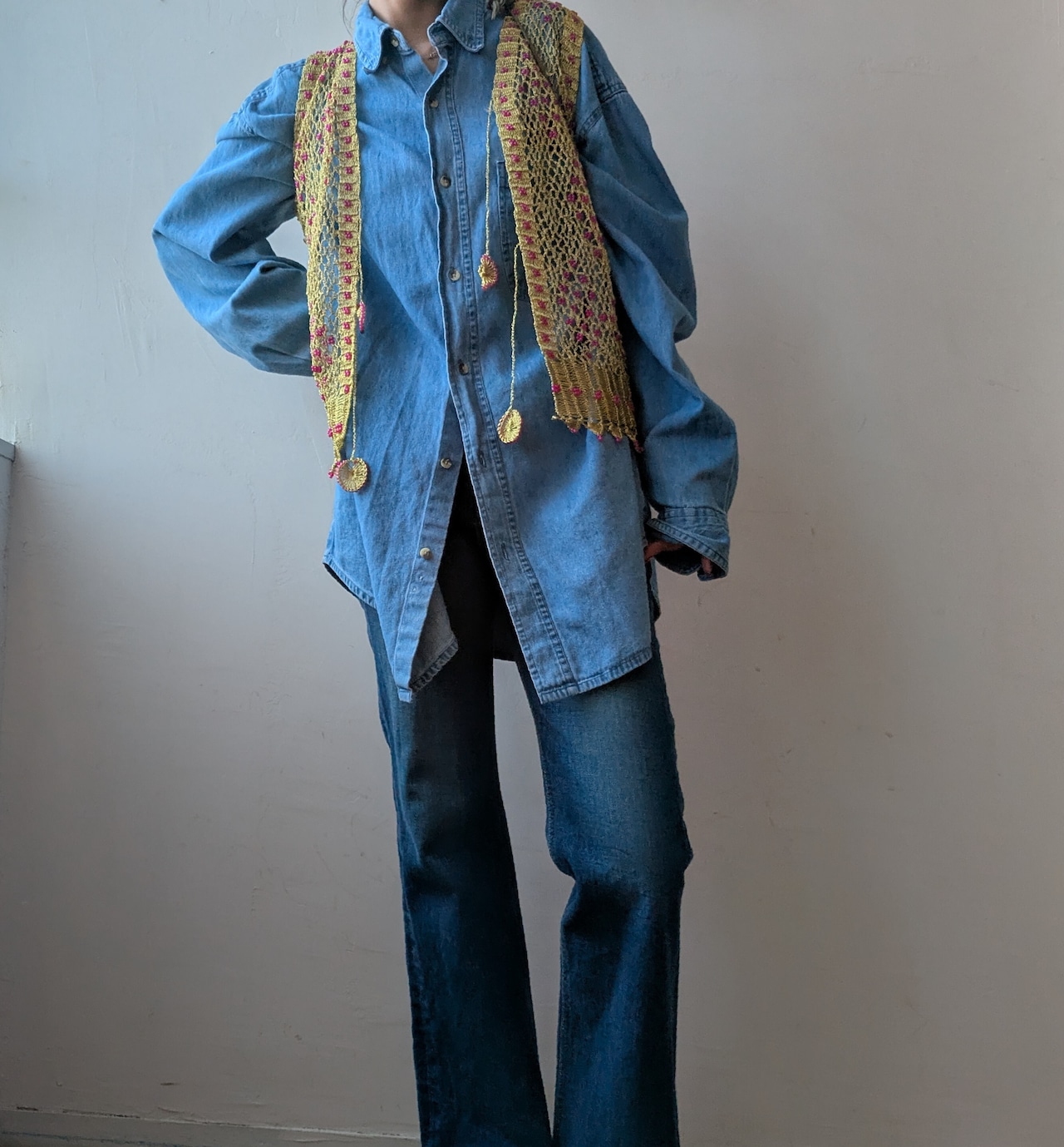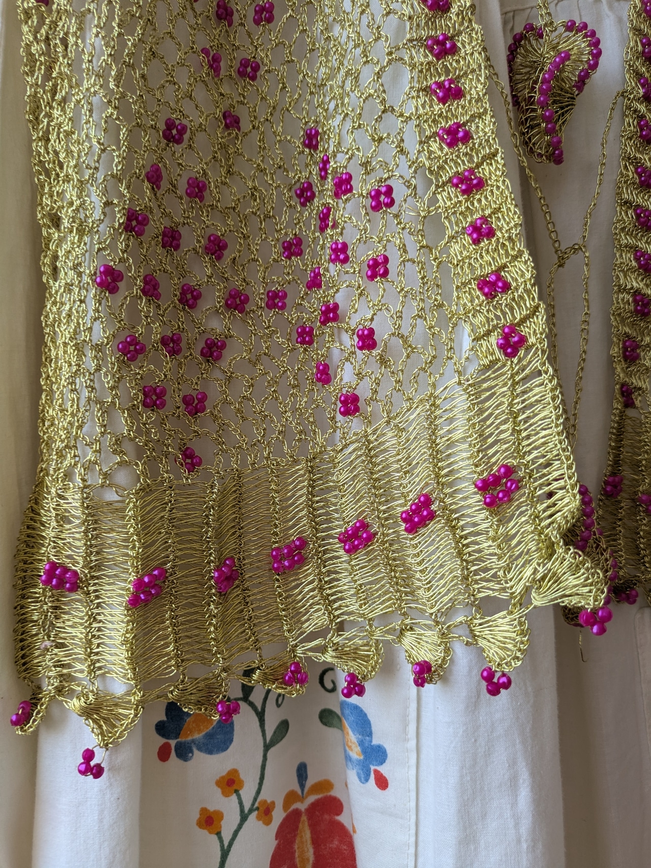 ゴールドの特殊な糸で編まれたメッシュビーズデザインがおしゃれなベストです。
