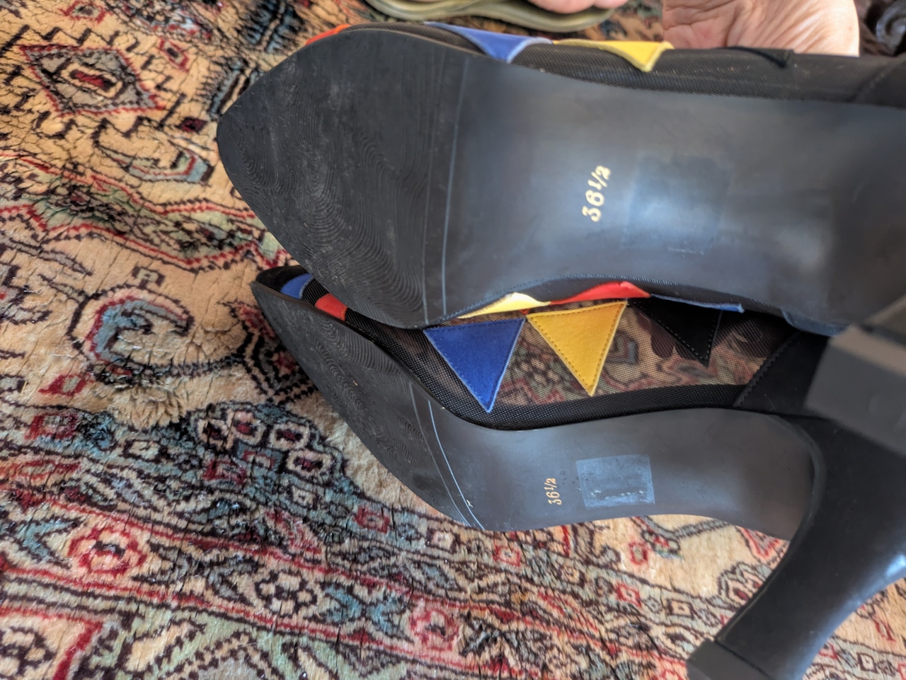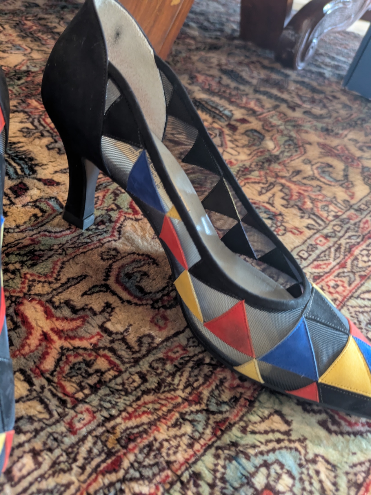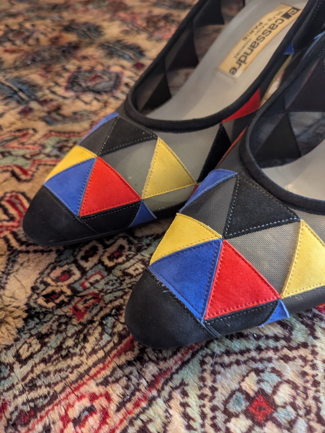 カラフルで個性的なデザインが魅力のイタリア製パンプスです。ぱっと目を引くカラフルな色合いと、メッシュ&レザーの組み合わせが新鮮!