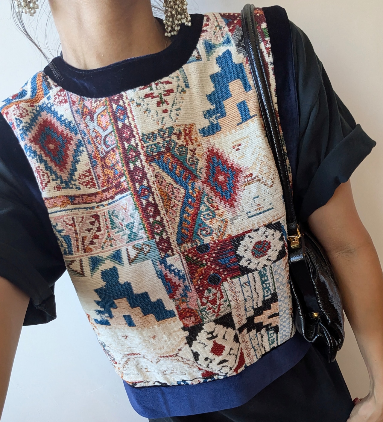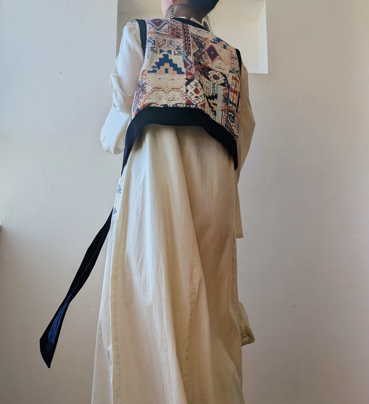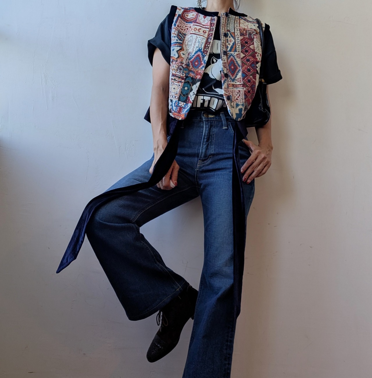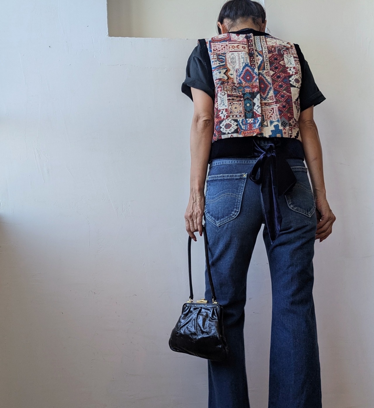 美しいゴブラン織りとウエストのベルベットリボンが魅力の秋冬にぴったりなベストです。
