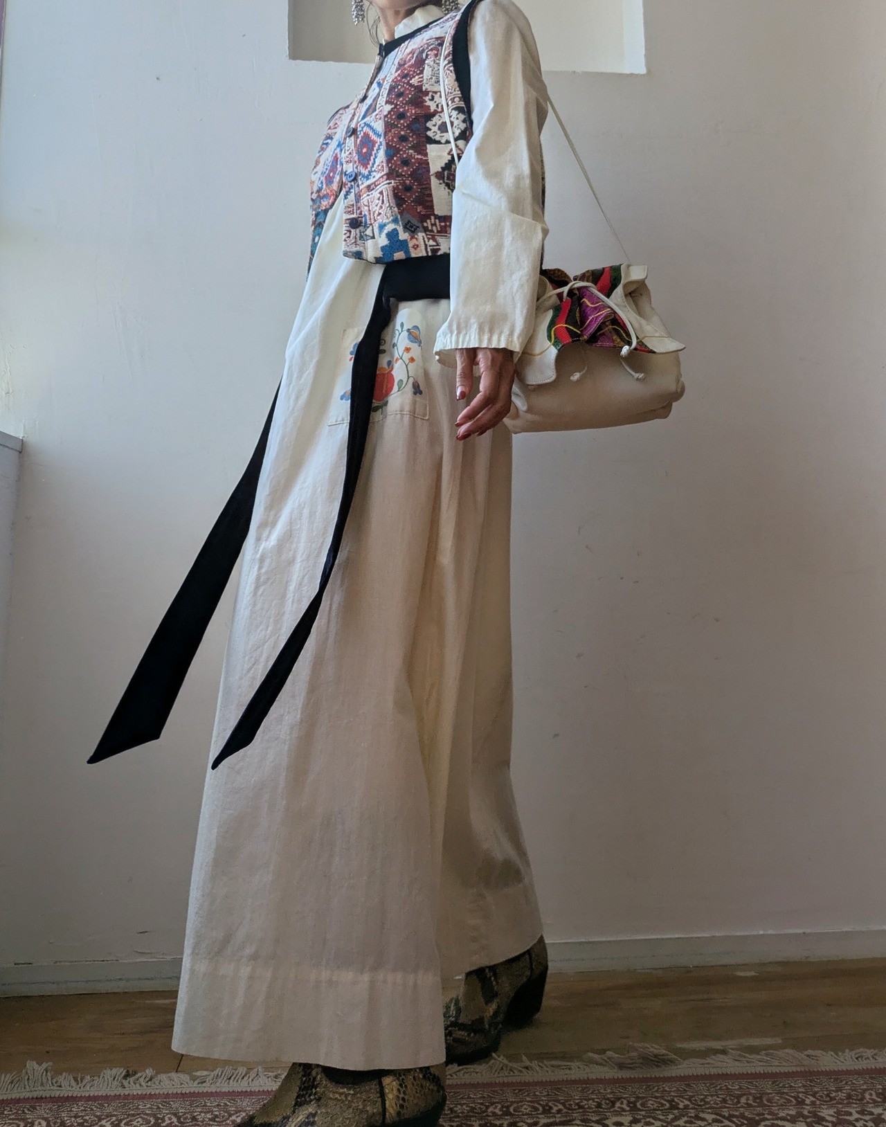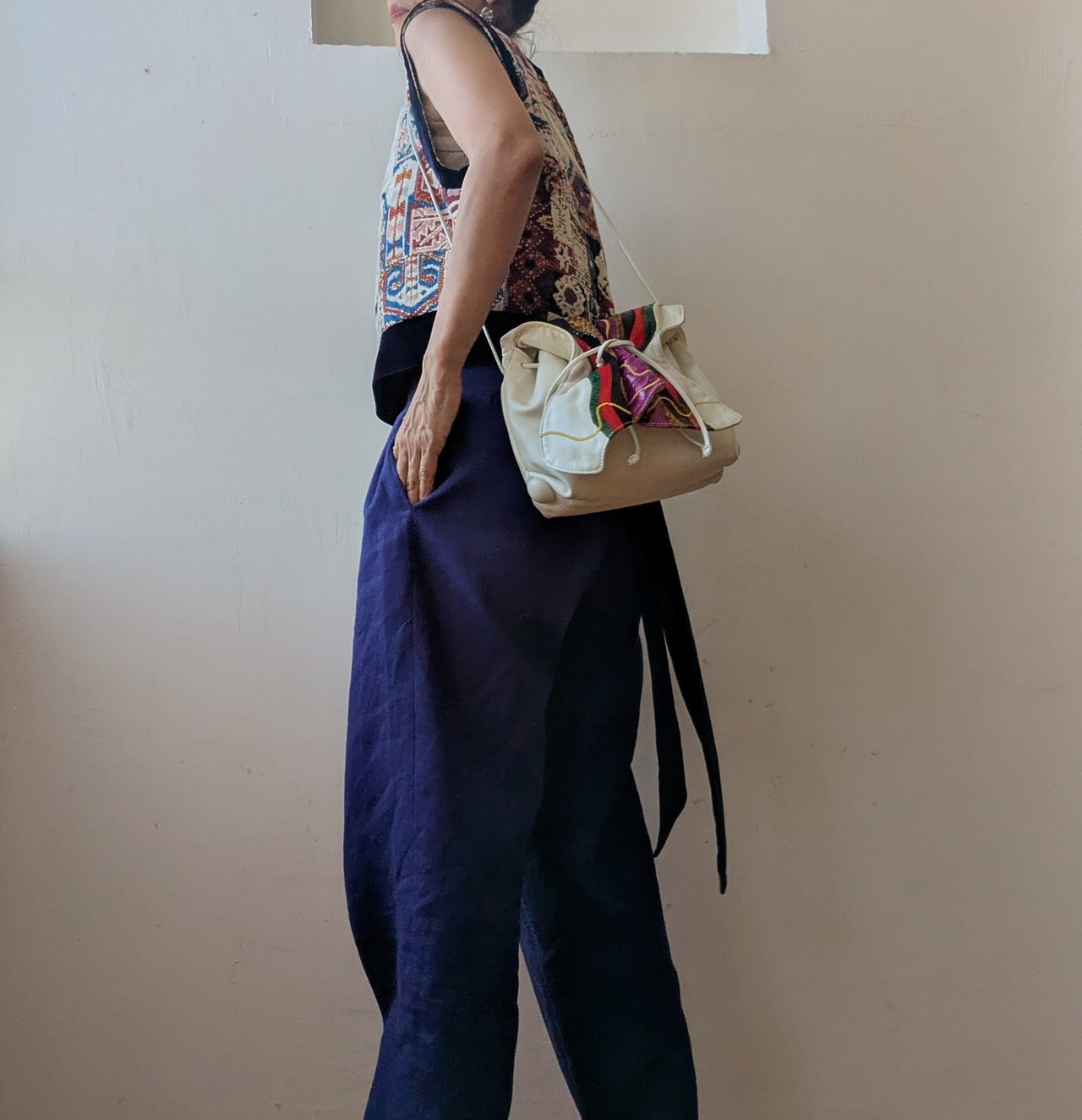 独特なテクスチャーと色使いが、シンプルなコーデにもアクセントを加えてくれます。