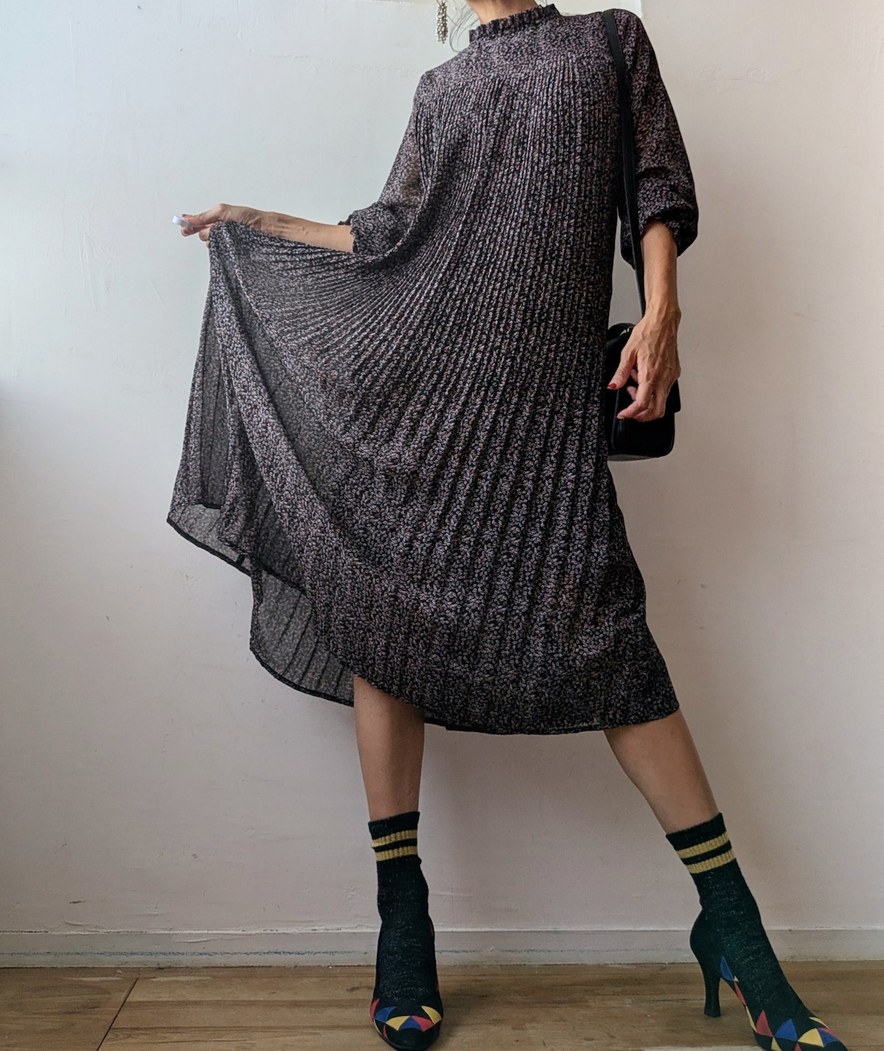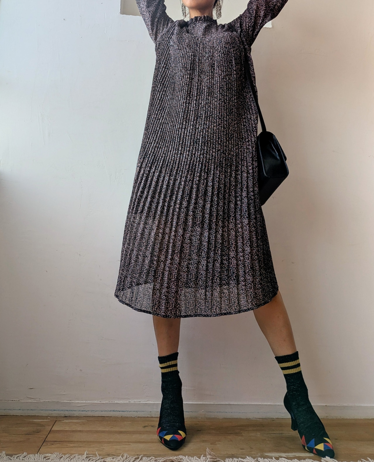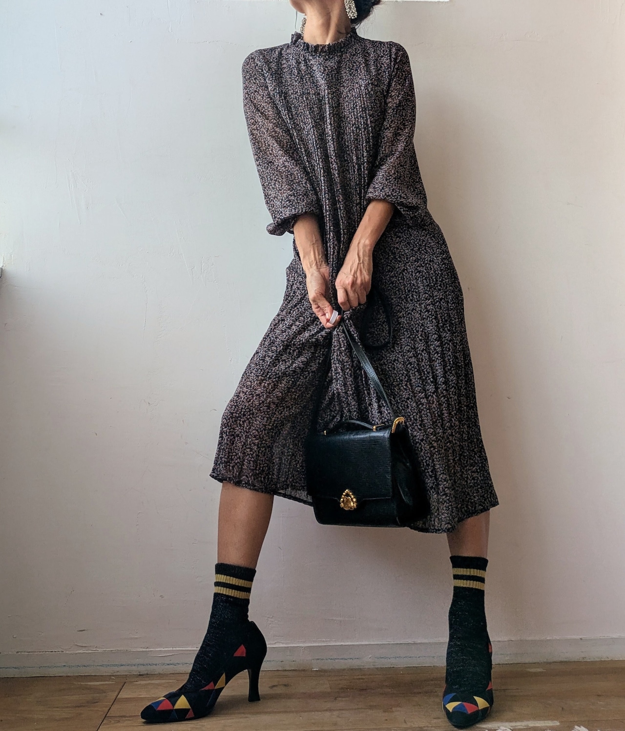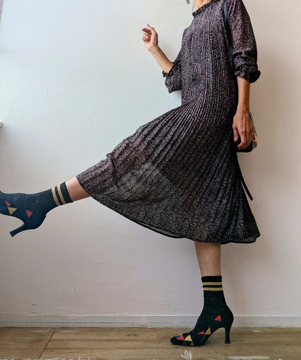 前身頃から裾にかけて、細かなプリーツデザインが優雅で上品な雰囲気。