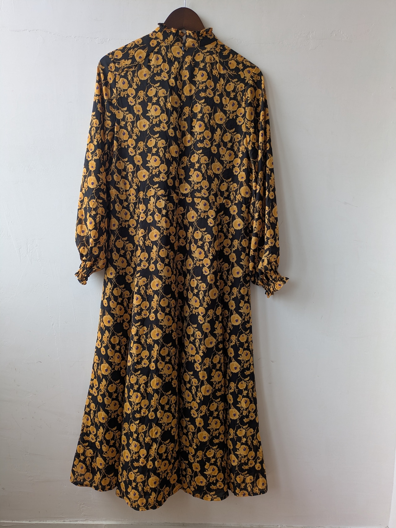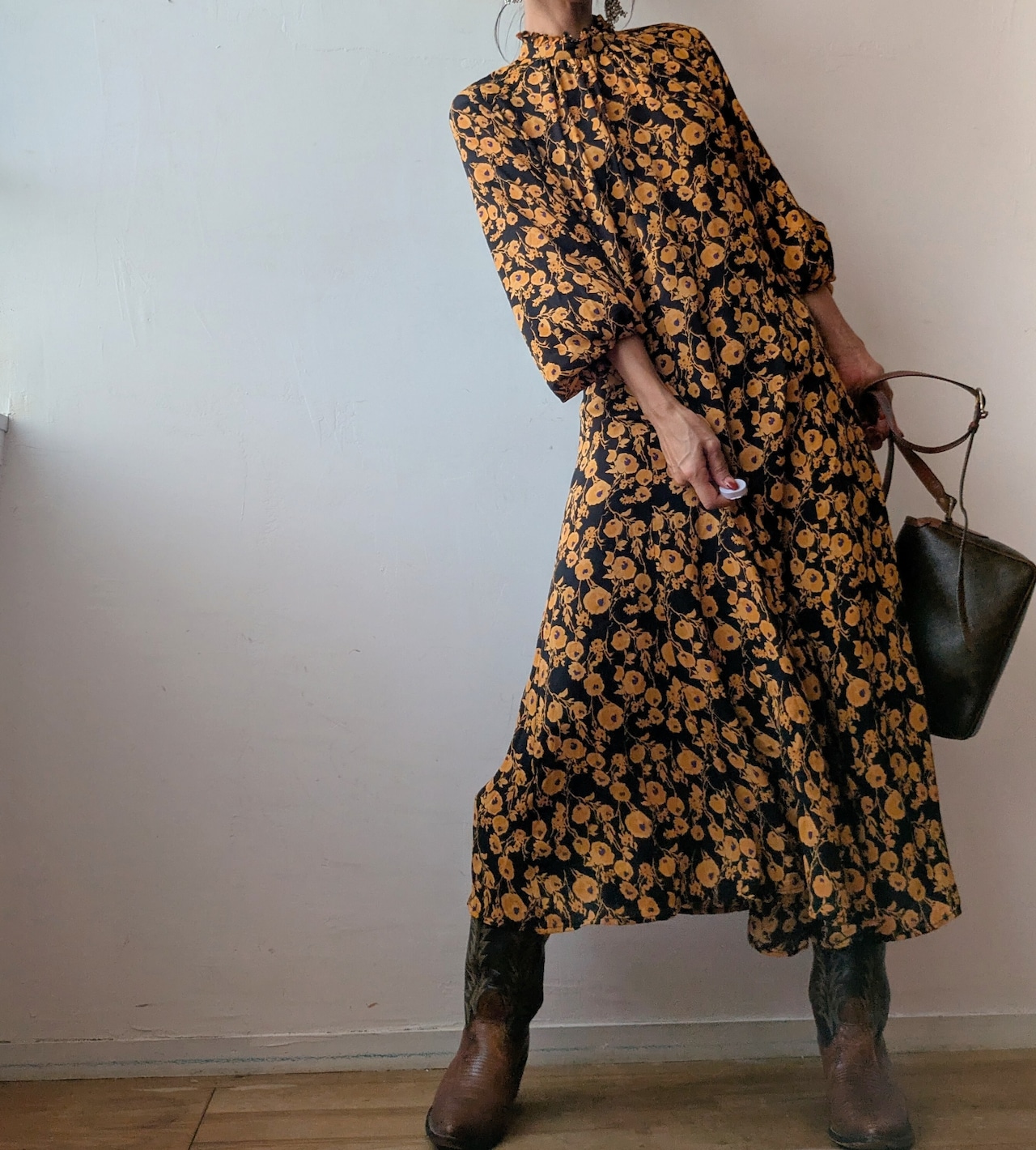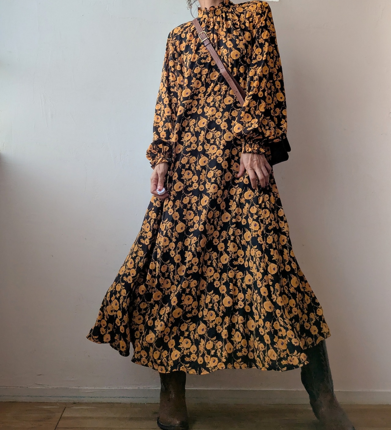 鮮やかな花柄が印象的なフレアロングドレスです。軽やかで柔らかな素材感は春夏はもちろん、秋口にもぴったりなアイテムです。ヒールやブーツを合わせて華やかに、またはニットやデニムジャケットをレイヤードすることでカジュアルなスタイルにもおすすめ。