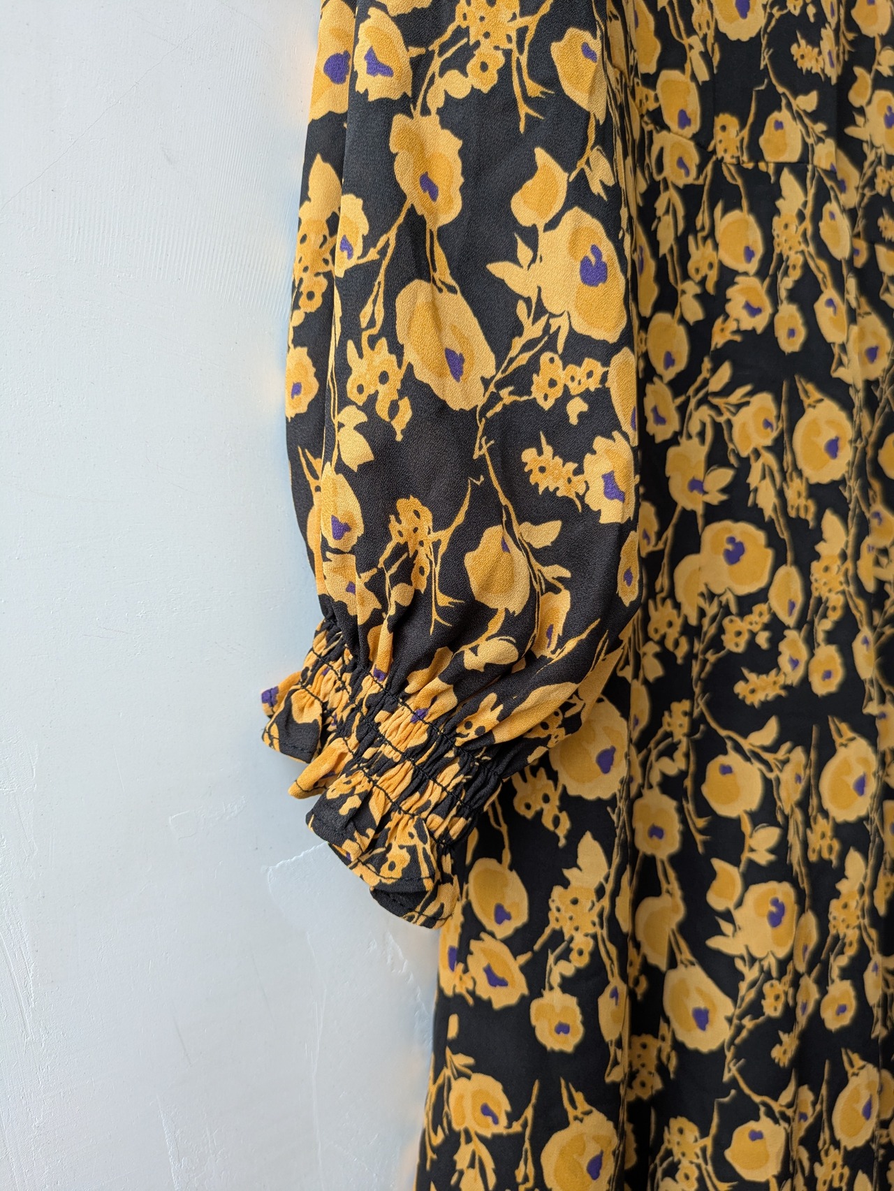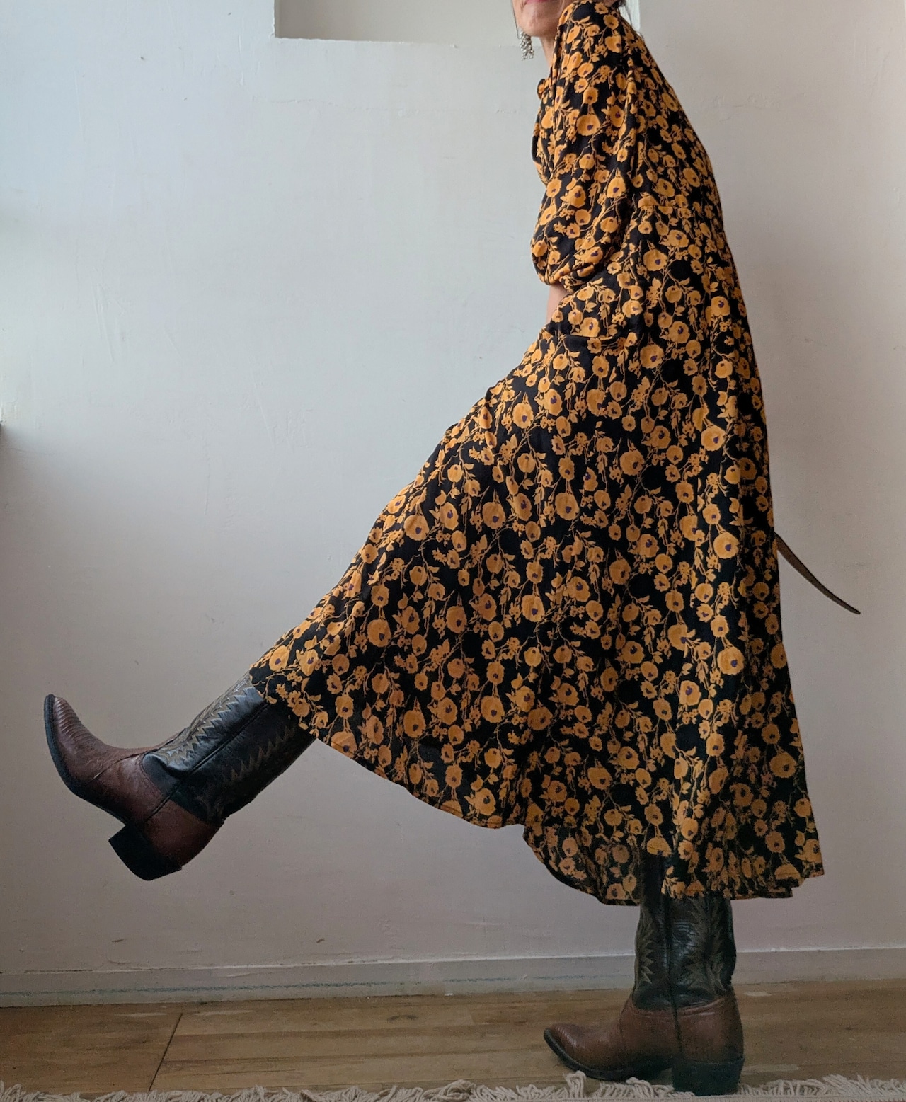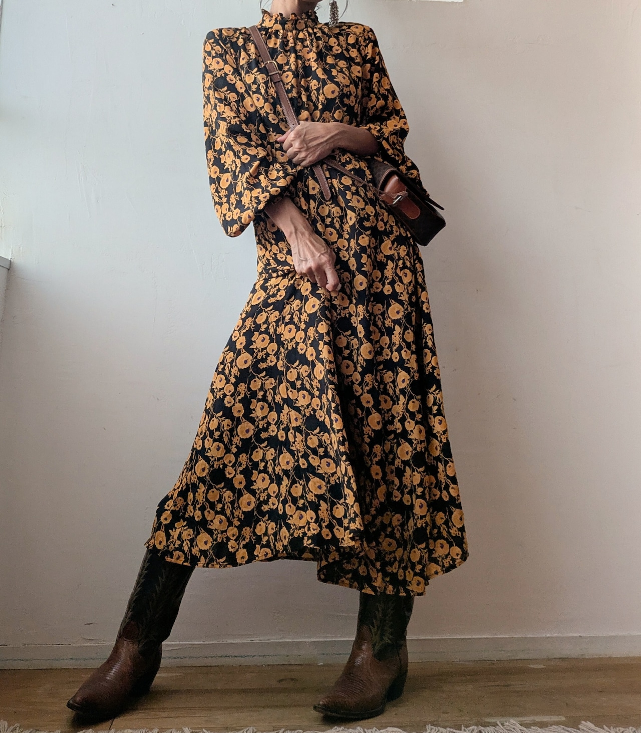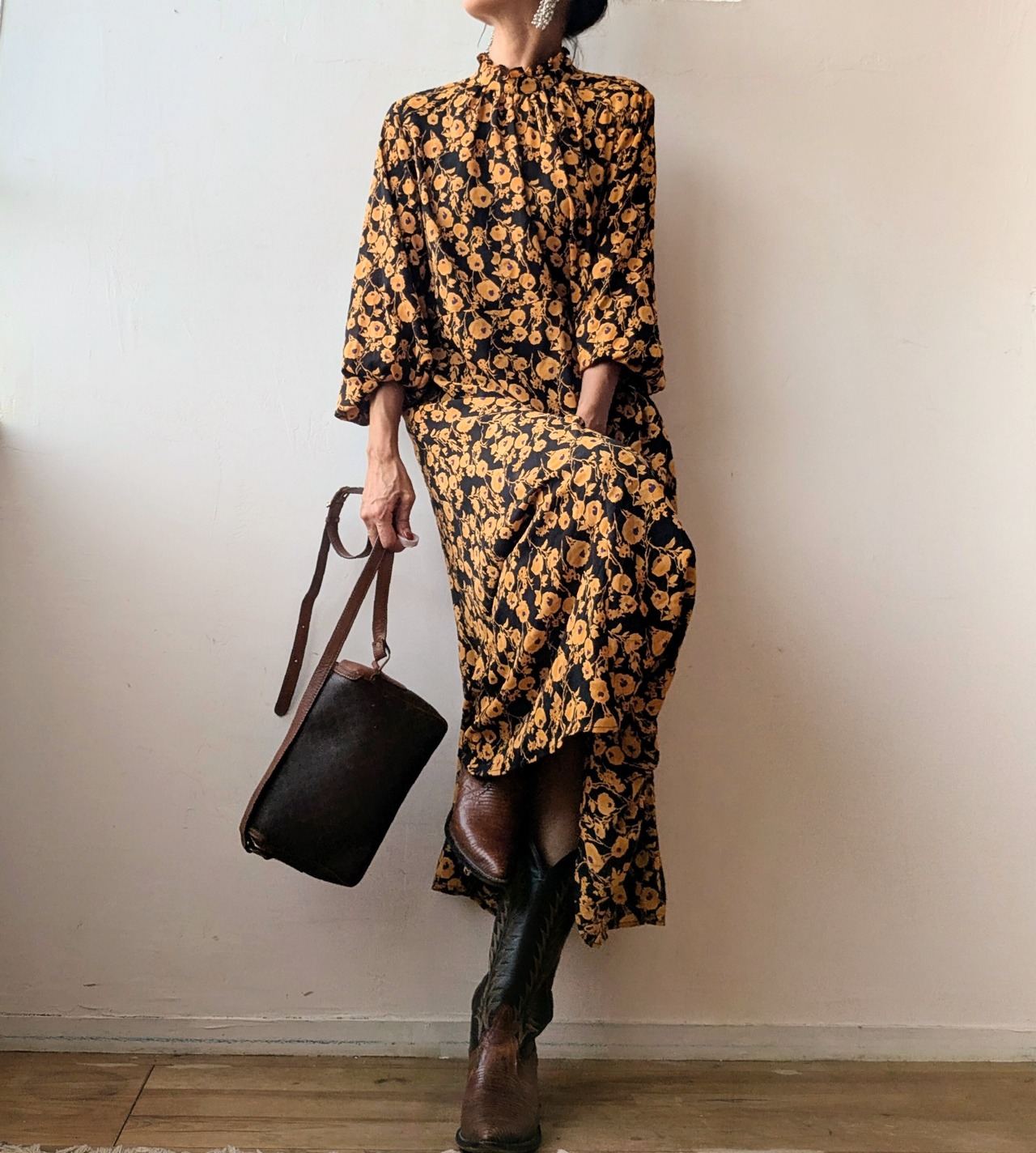 鮮やかな花柄が印象的なフレアロングドレスです。軽やかで柔らかな素材感は春夏はもちろん、秋口にもぴったりなアイテムです。ヒールやブーツを合わせて華やかに、またはニットやデニムジャケットをレイヤードすることでカジュアルなスタイルにもおすすめ。