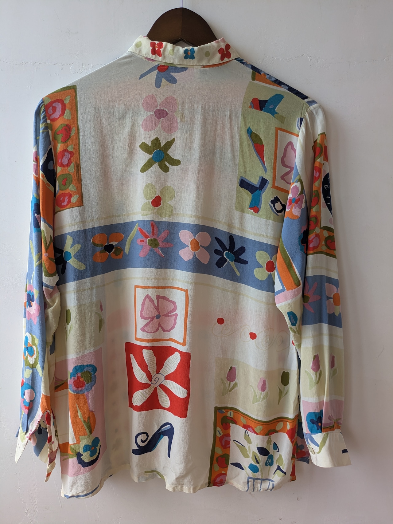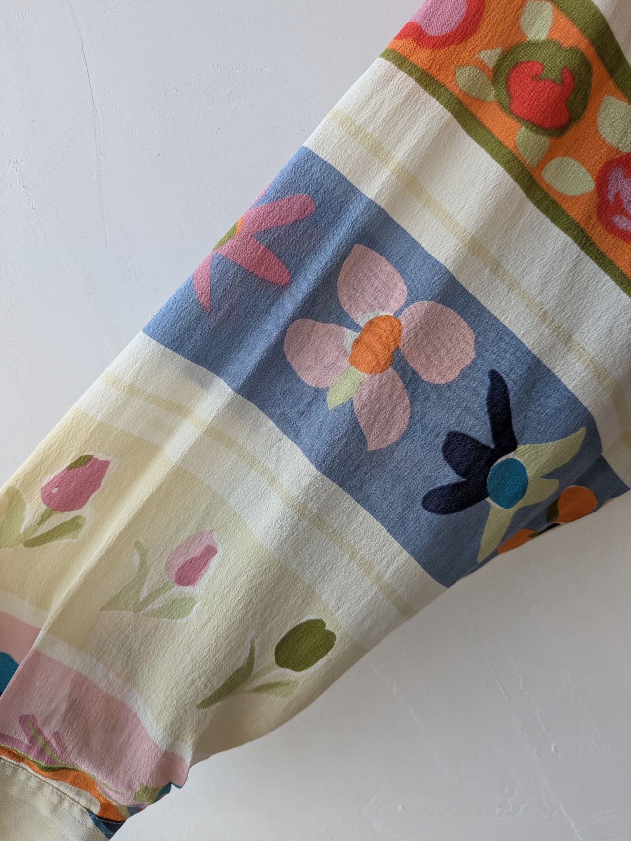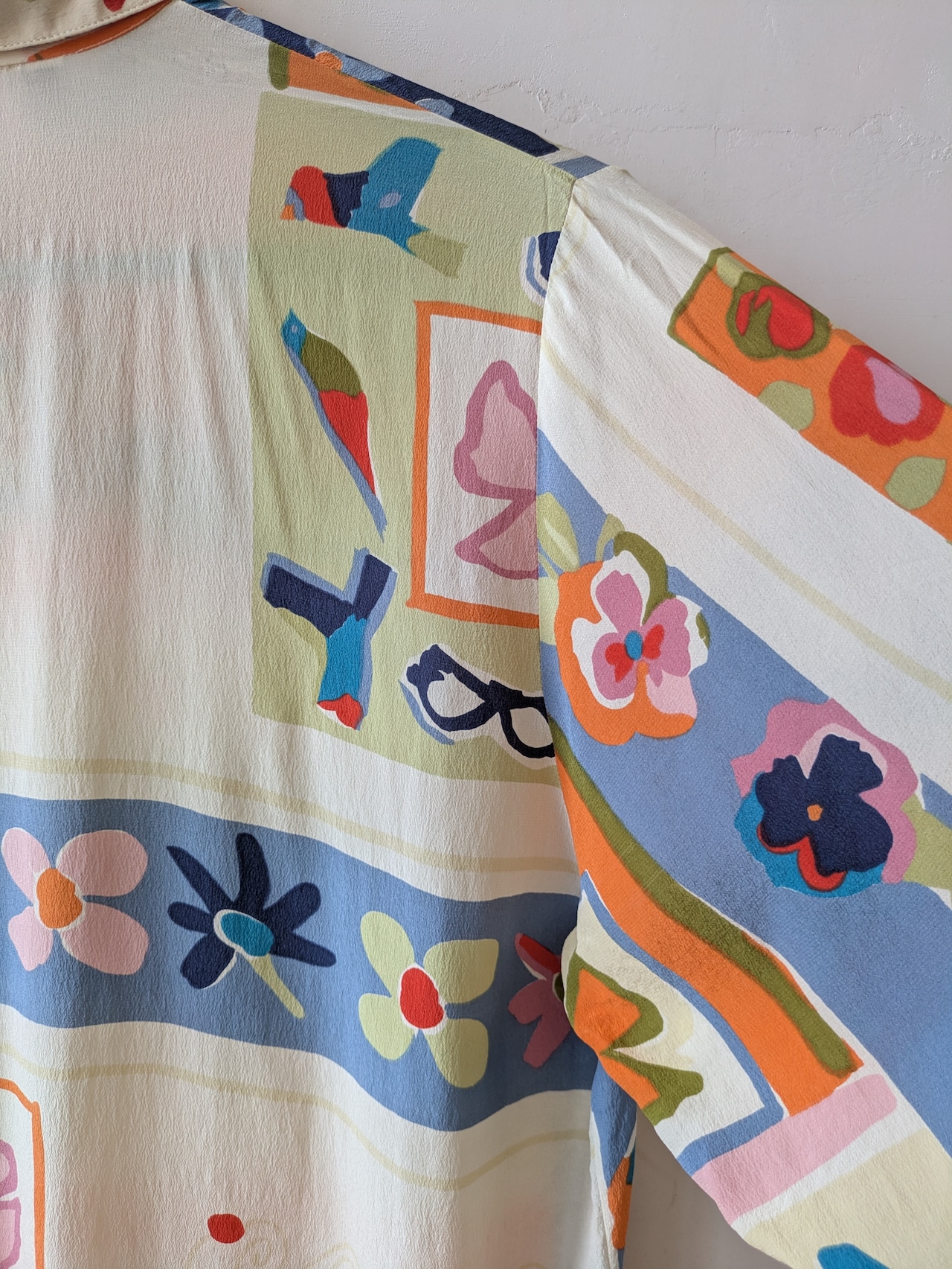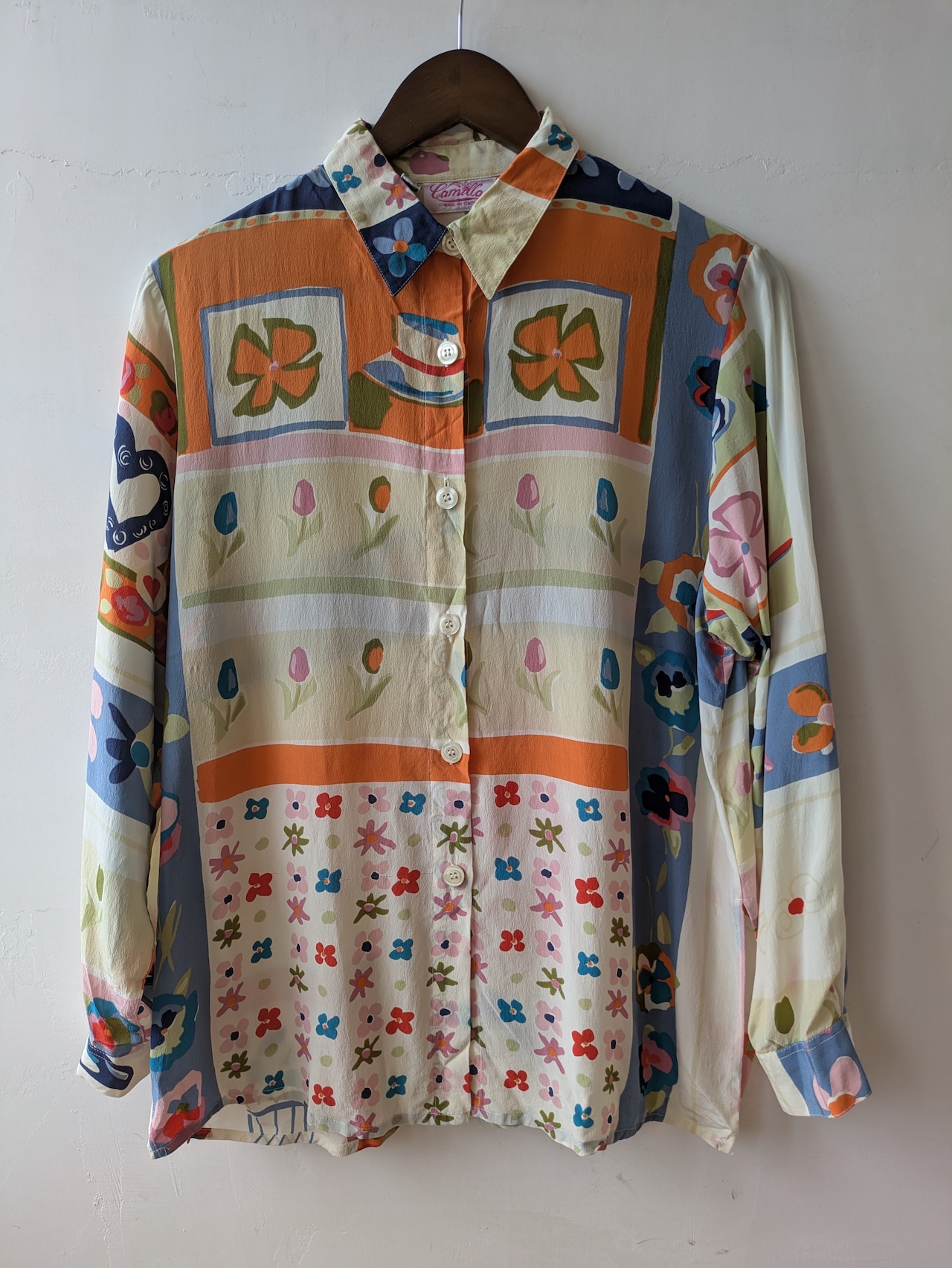 ヴィンテージならではオンリーワンの魅力あふれるカラフルなパターンが魅力のシルク100%シャツです。