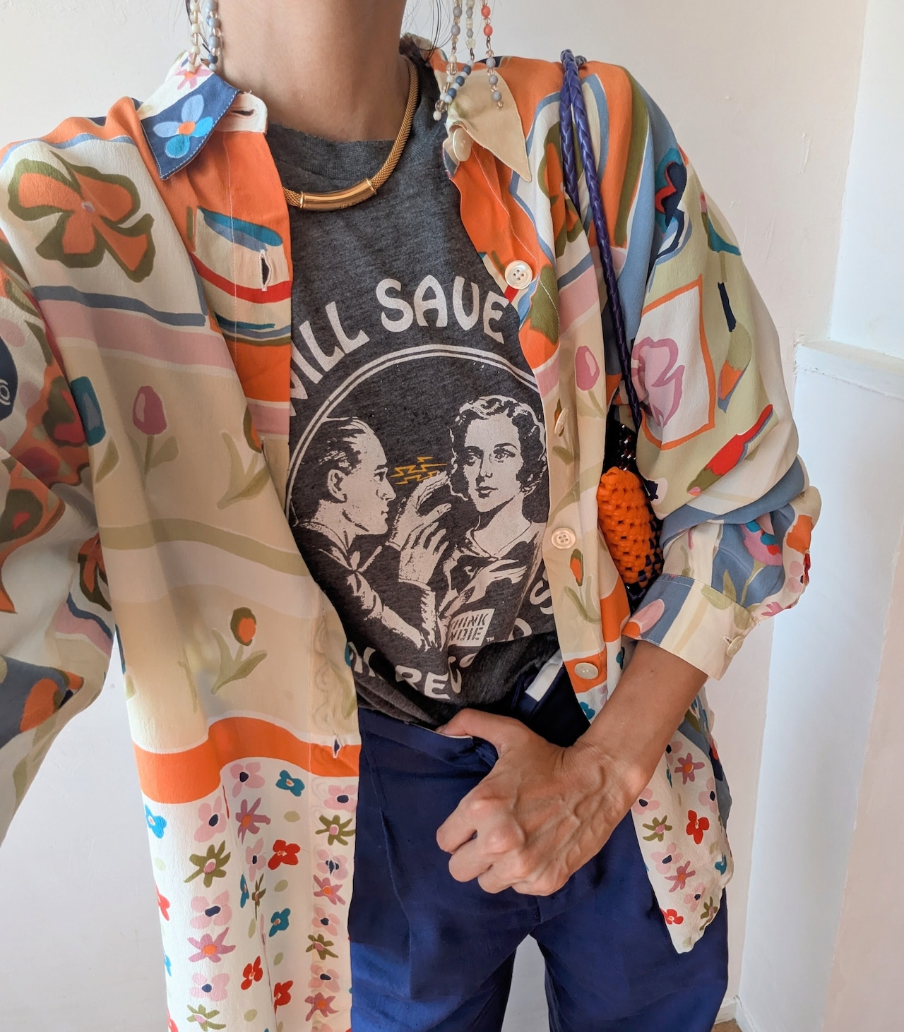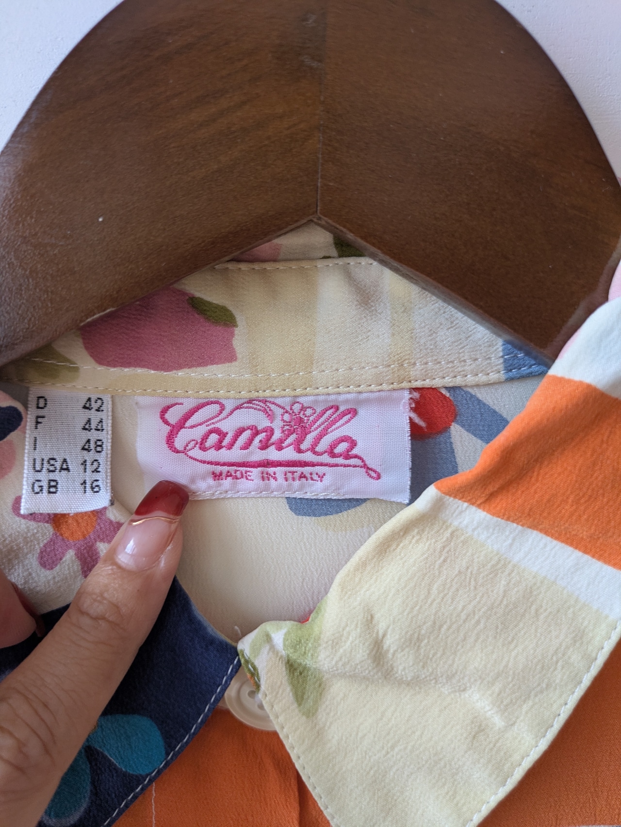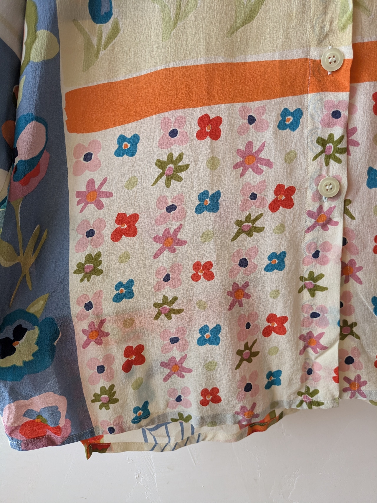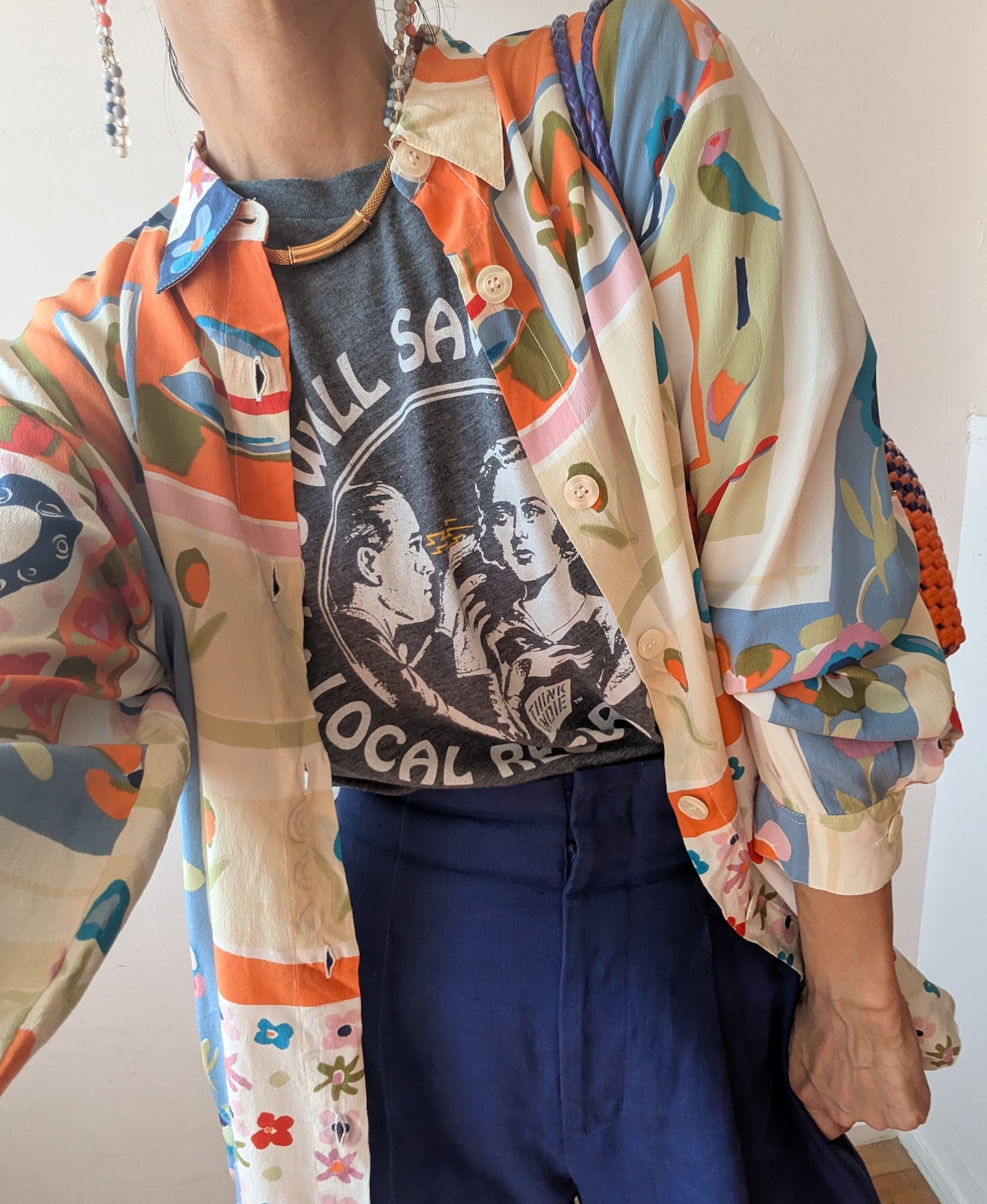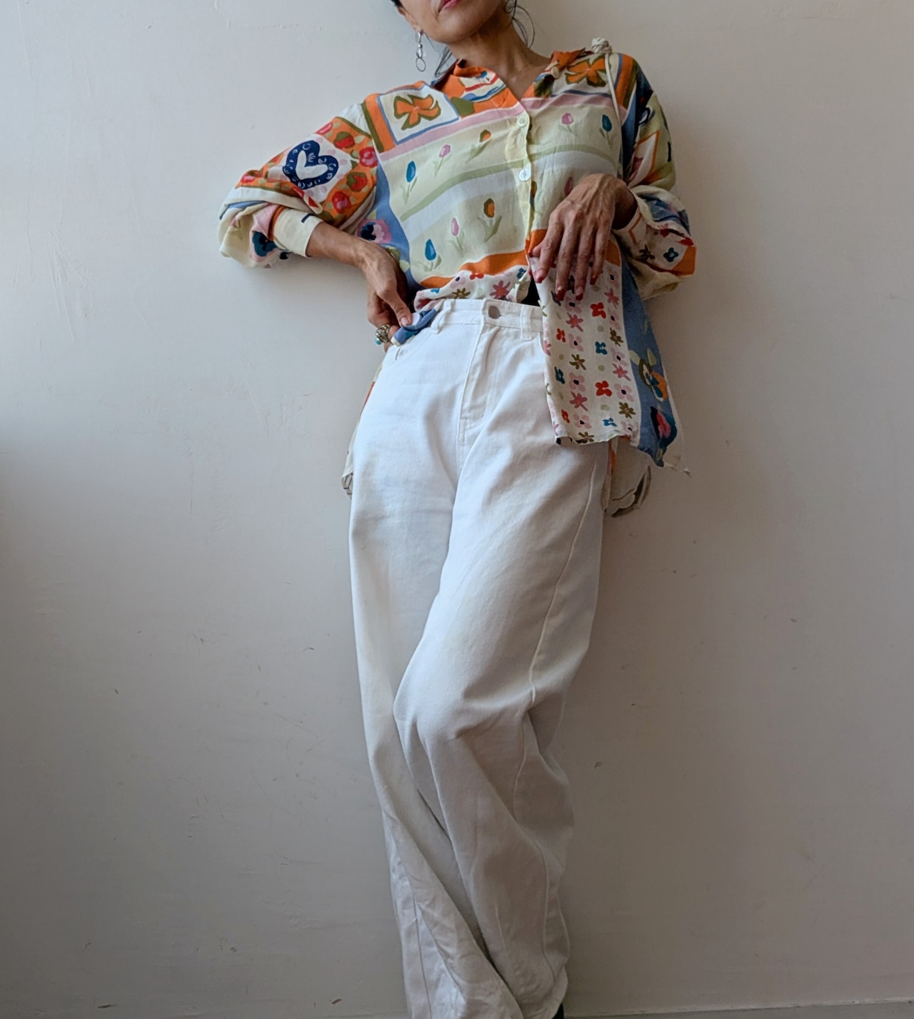 ヴィンテージならではオンリーワンの魅力あふれるカラフルなパターンが魅力のシルク100%シャツです。