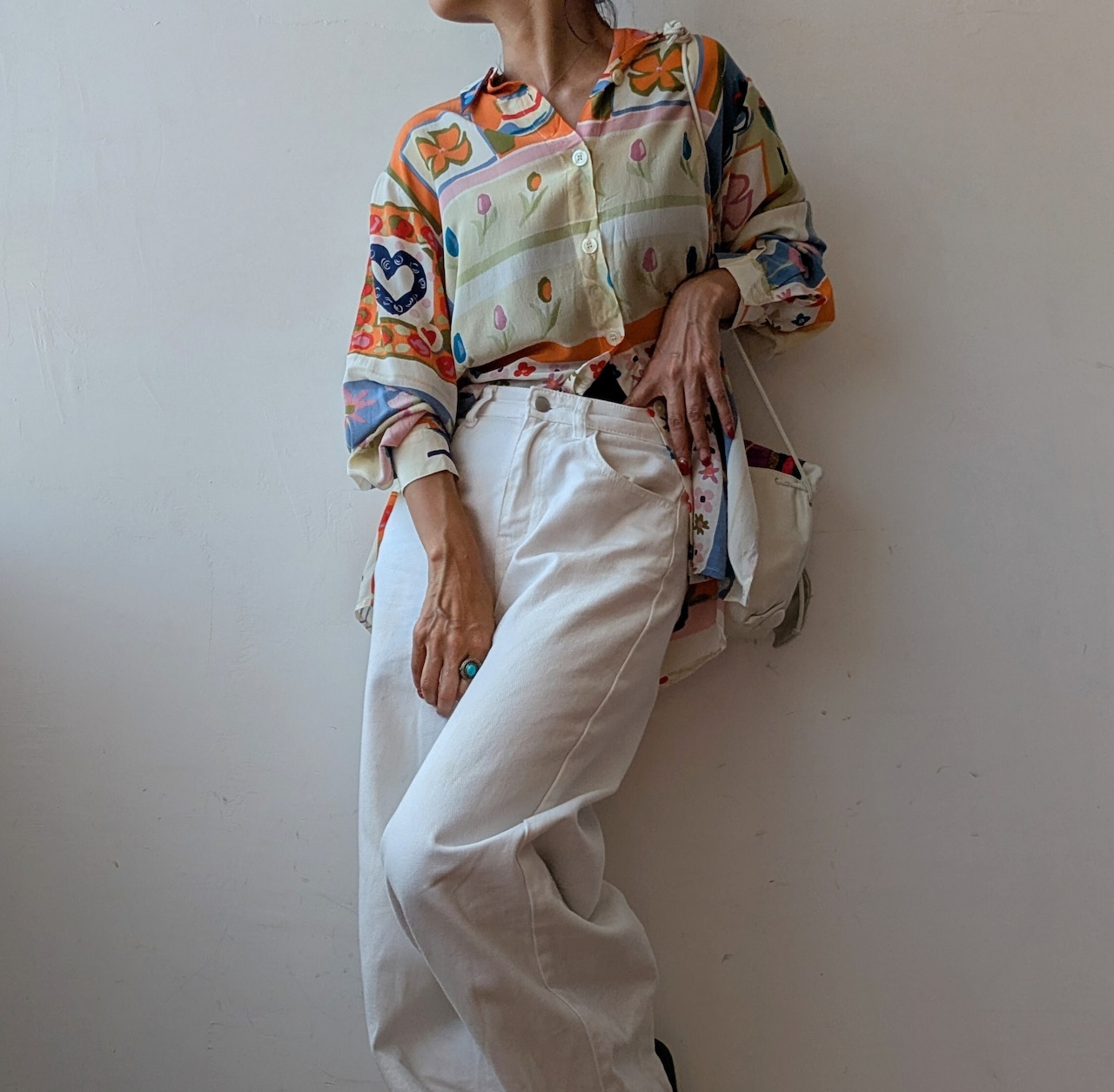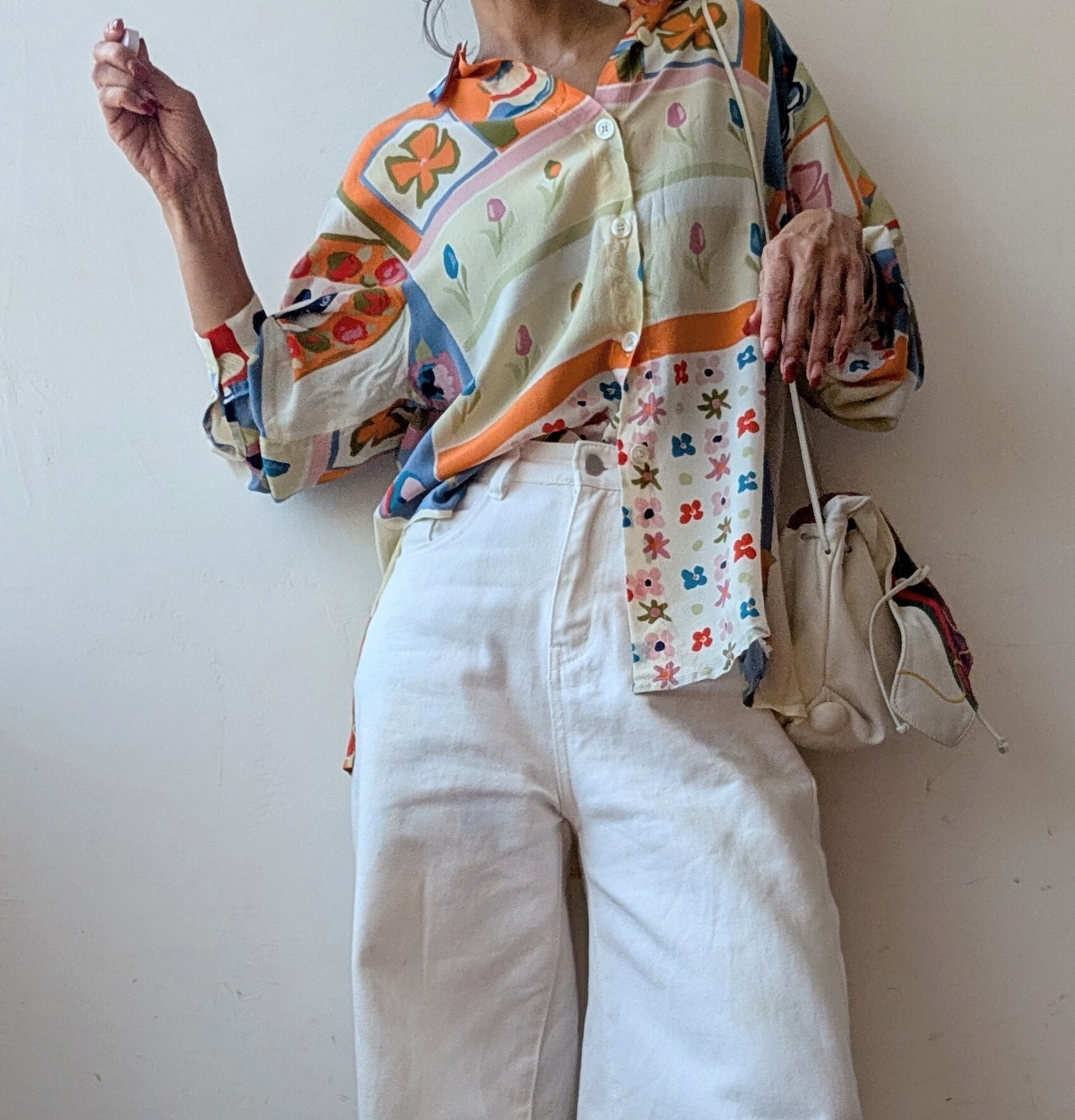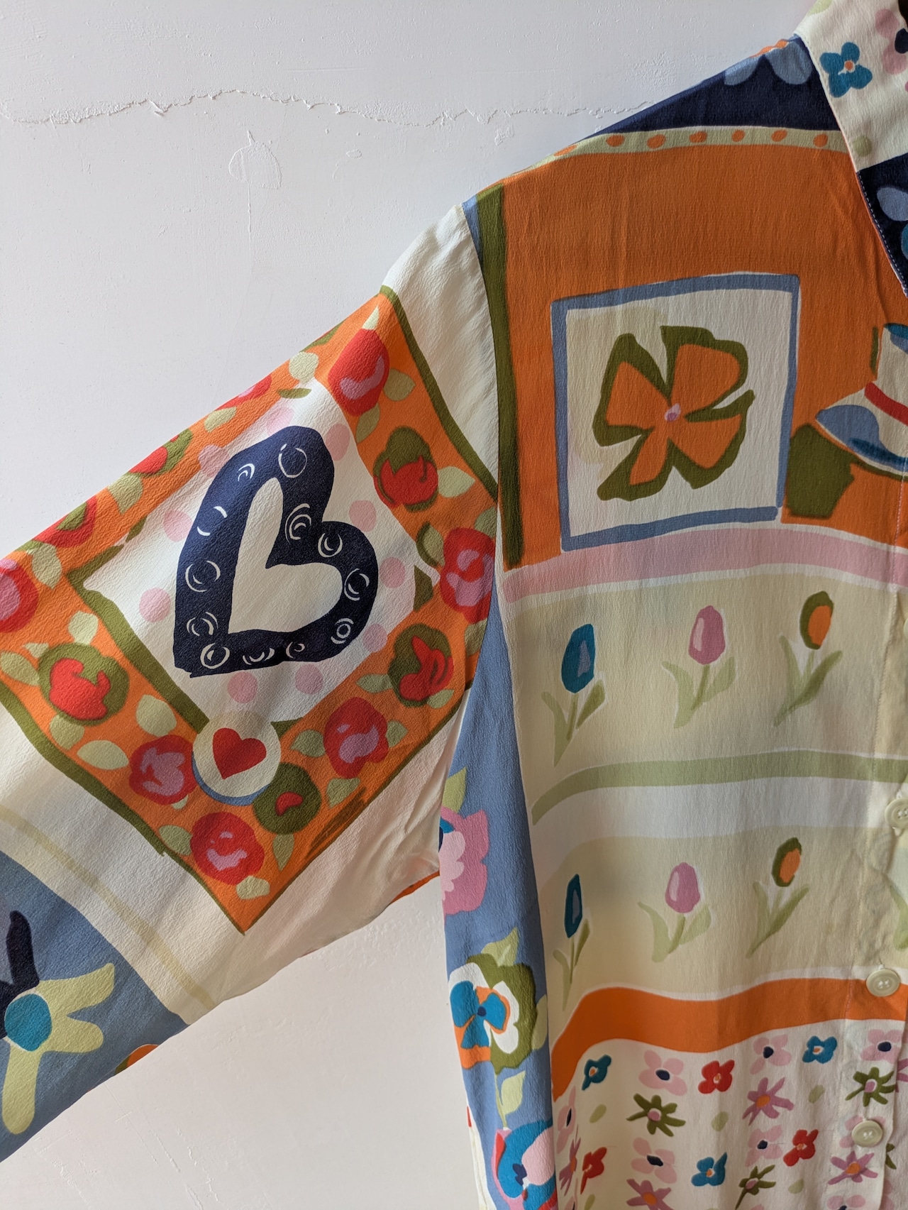 ふんわりと軽やかで肌触りのいいシルクの素材感と、ハートや、植物や花などがモチーフになったカラフルな明るい色使いも、上品さの中にもかわいいが詰まった大人の女性にぴったりな遊び心のあるシャツ。