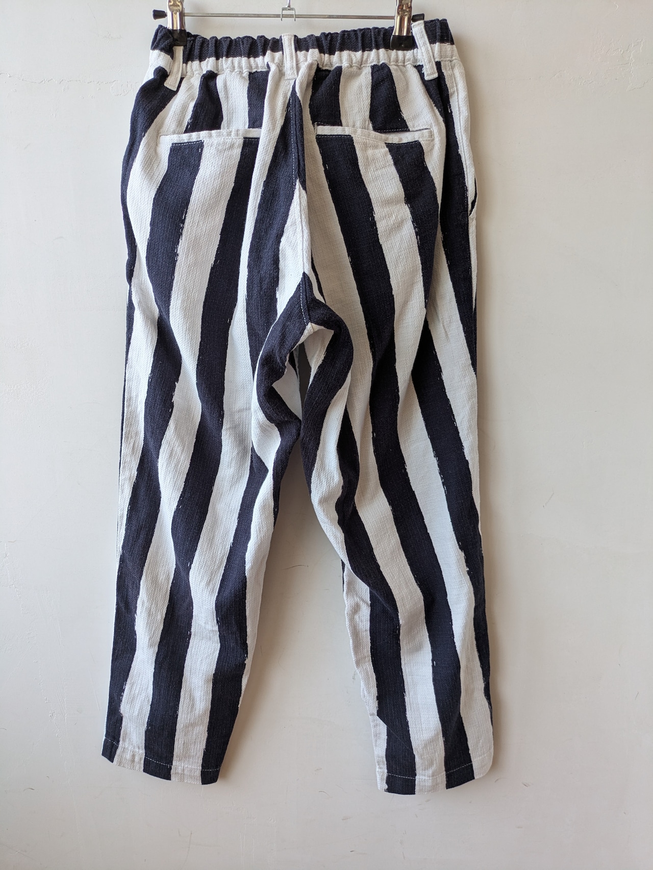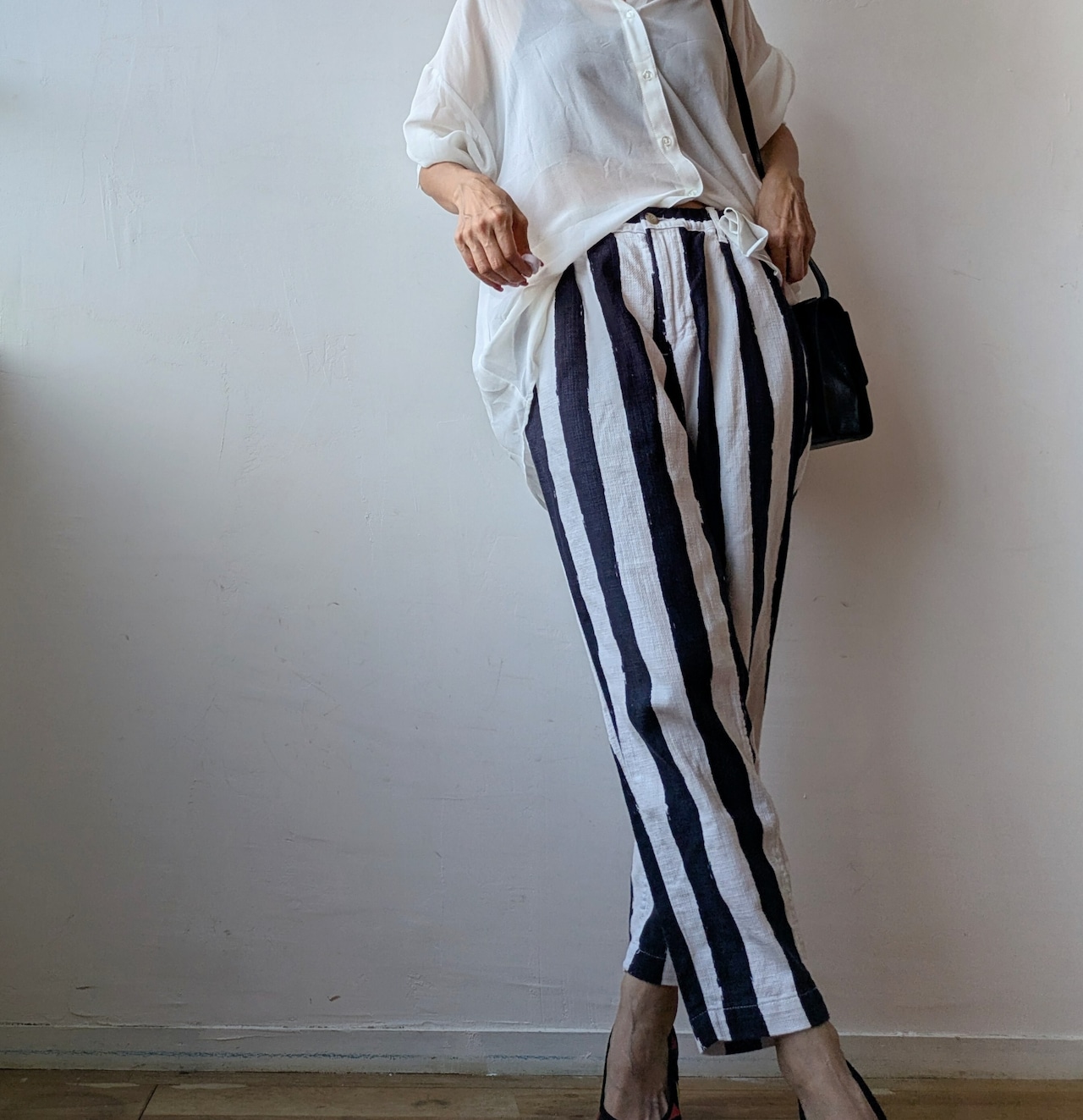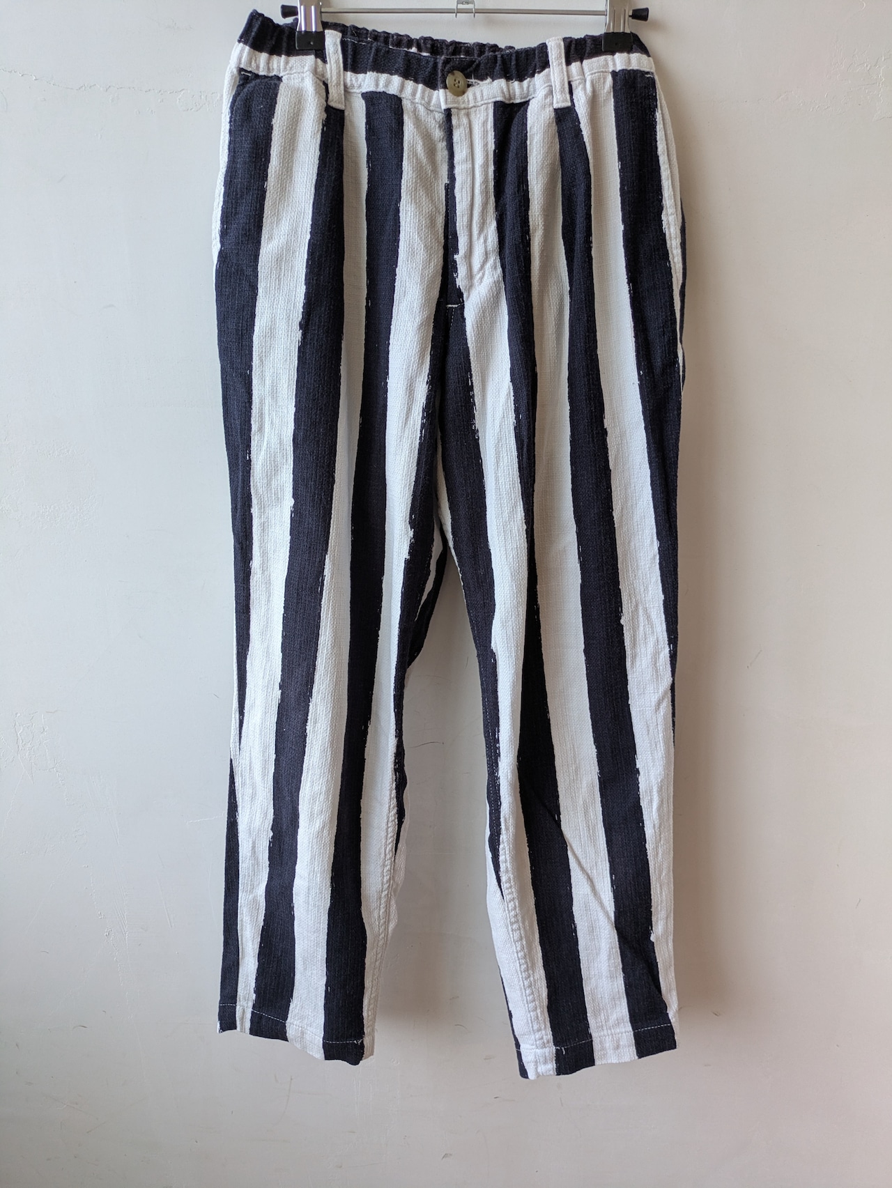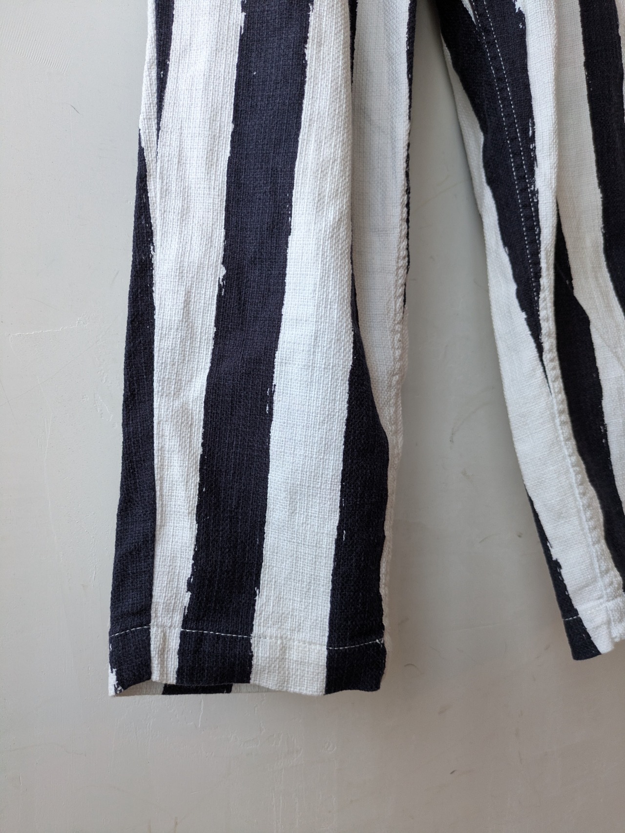 コットン素材の柔らかな肌触りと、筆描きのようなゆる感とラフなストライプデザインが魅力のコットンパンツです。