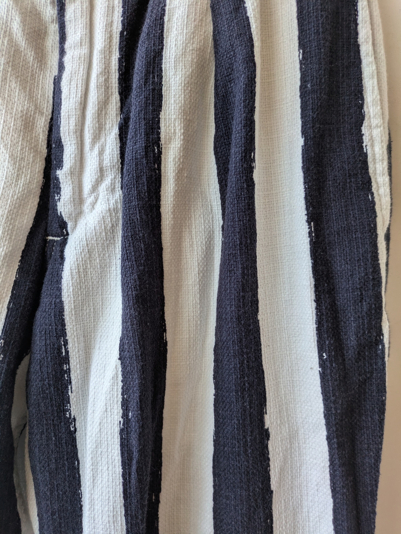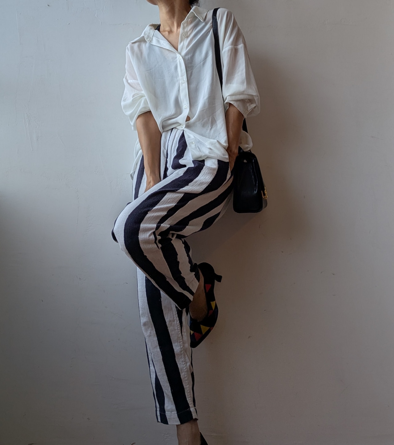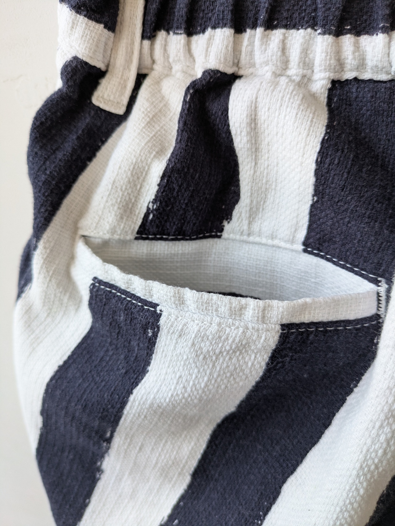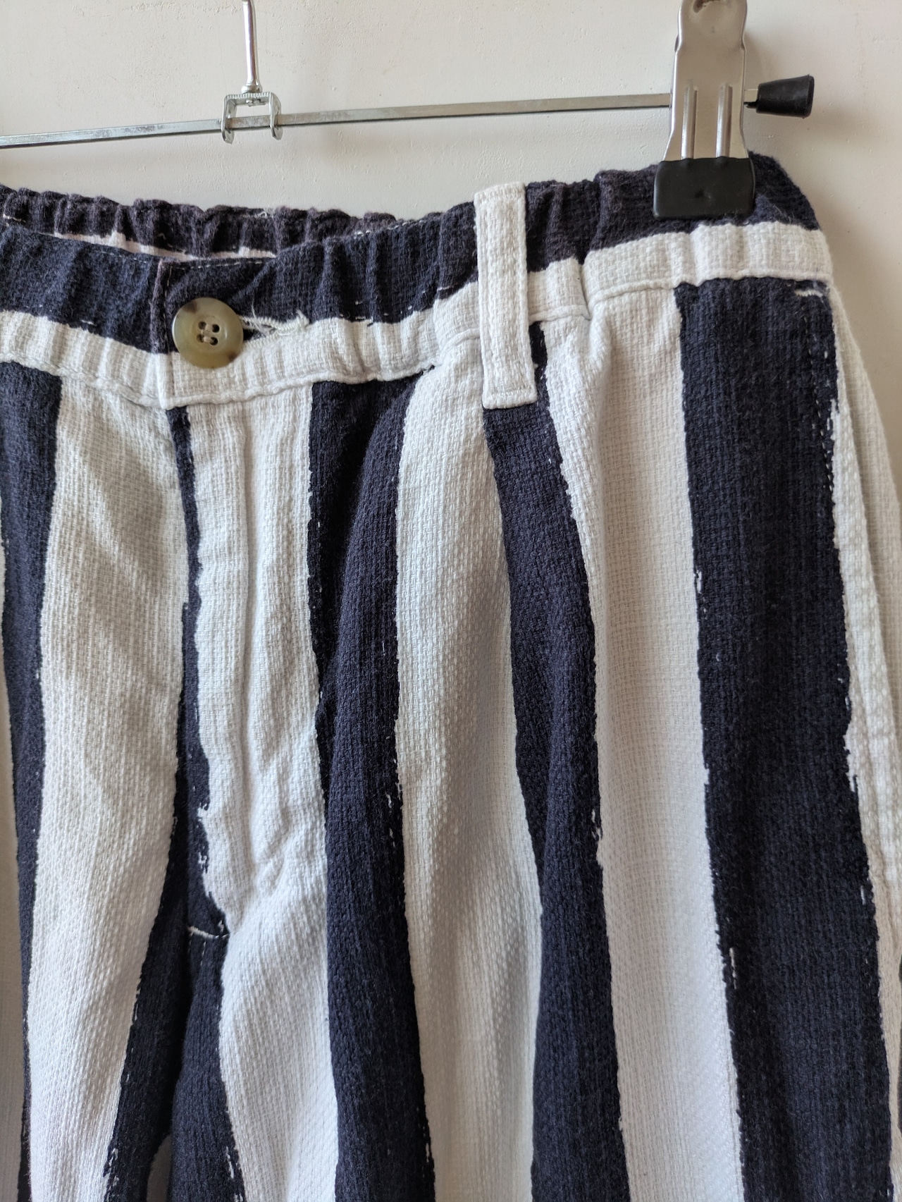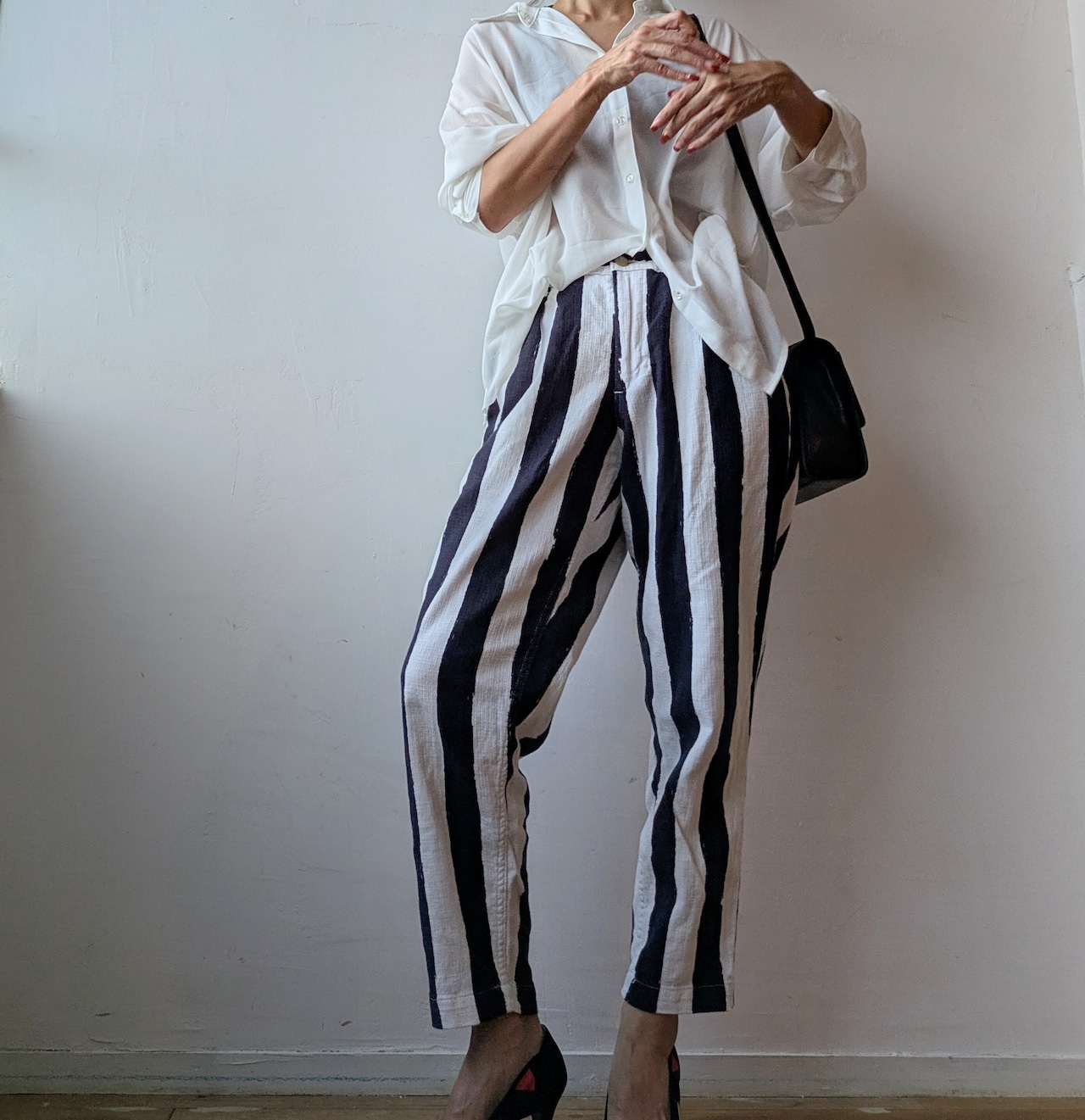 コットン素材の柔らかな肌触りと、筆描きのようなゆる感とラフなストライプデザインが魅力のコットンパンツです。