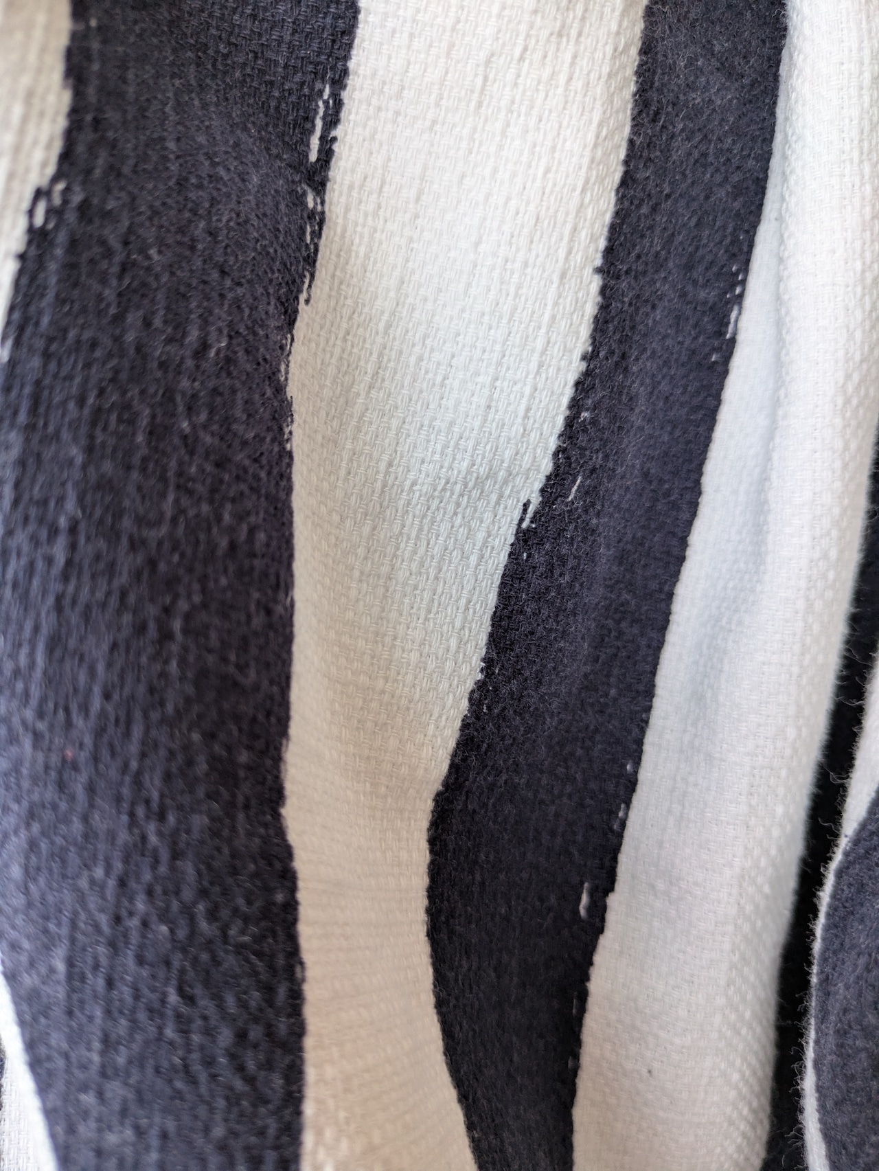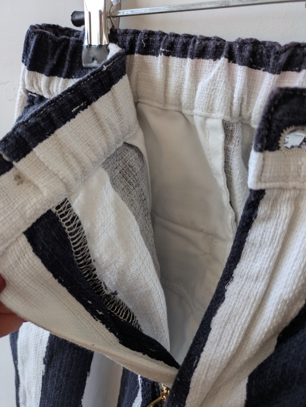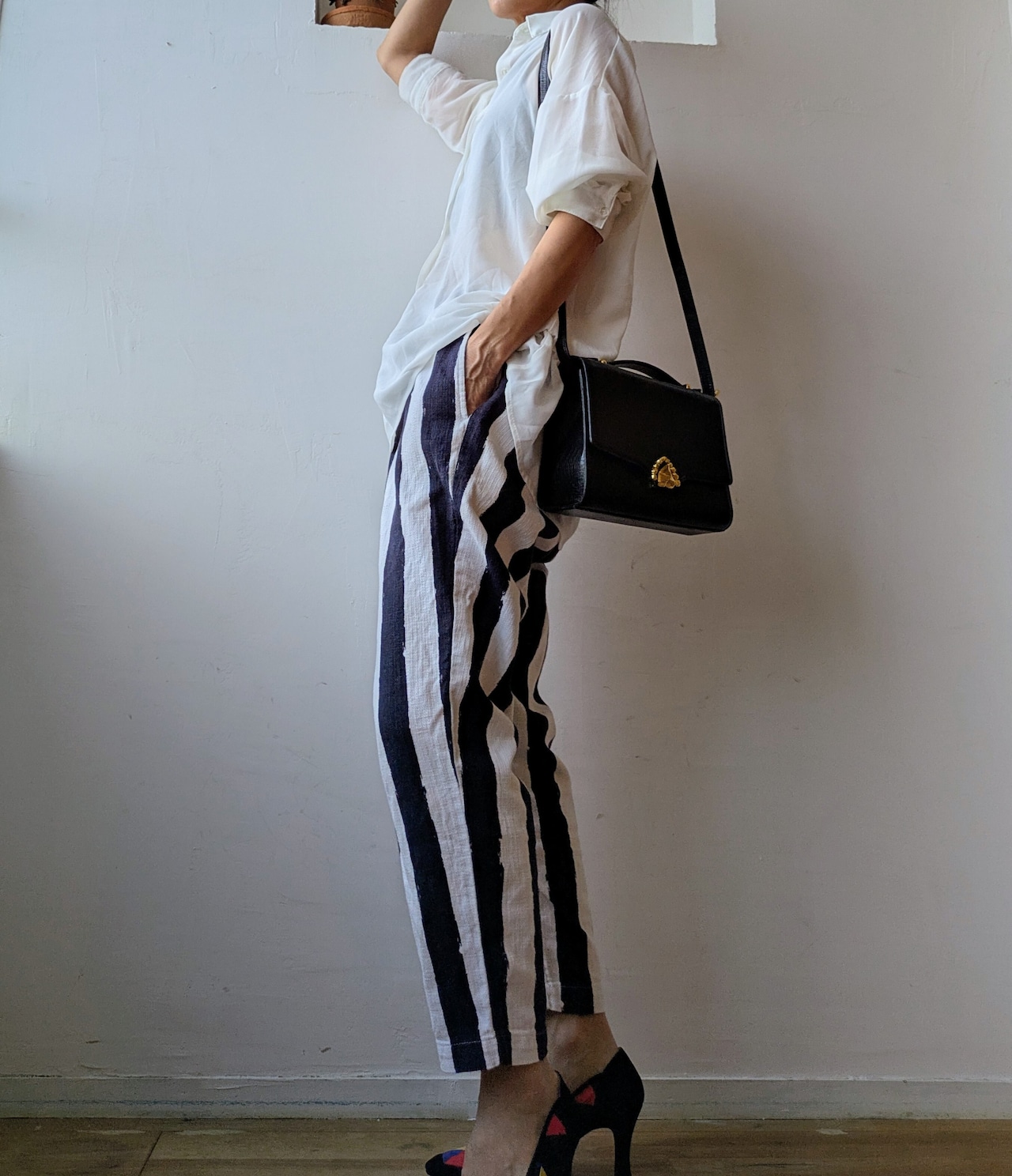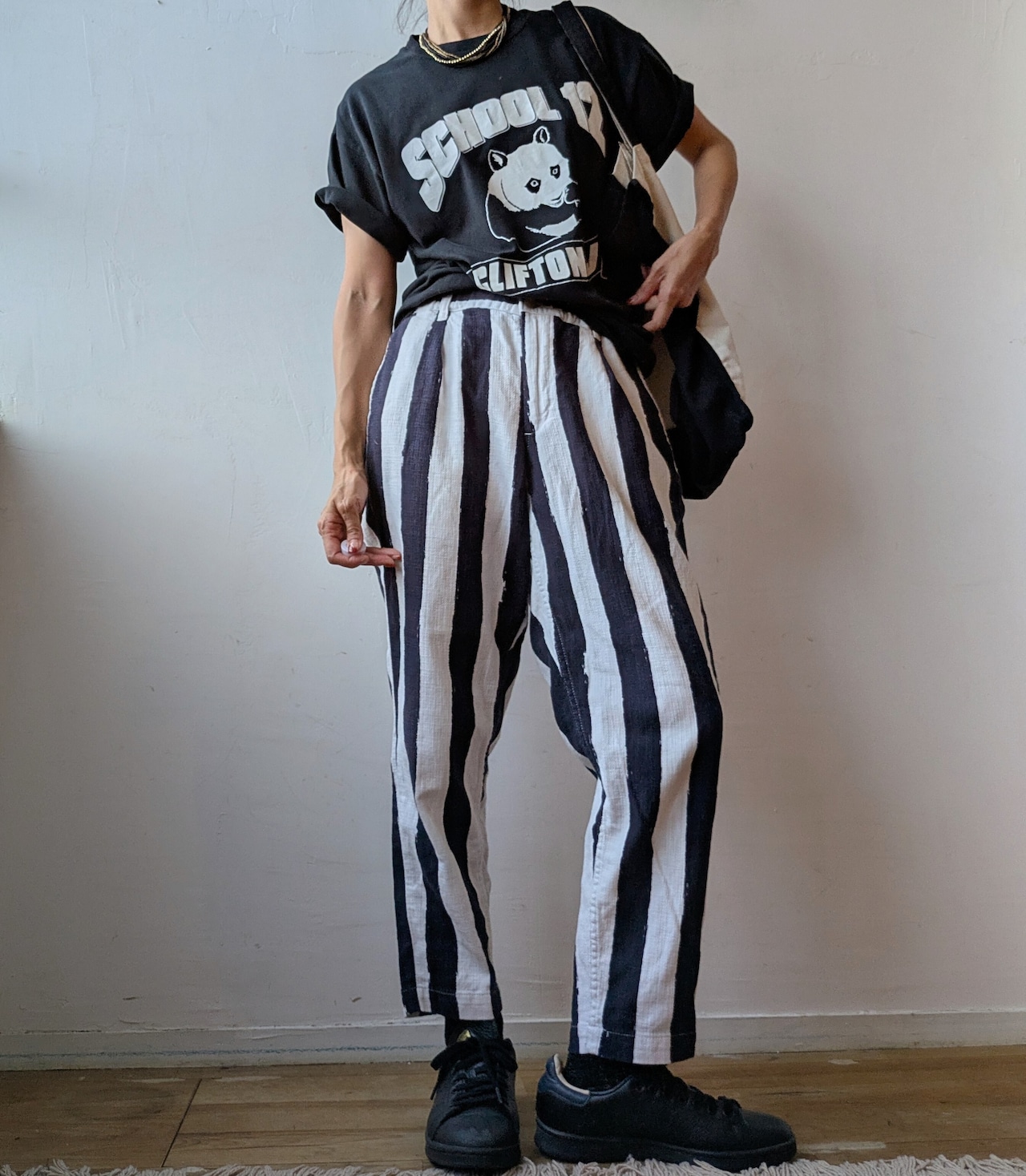 コットン素材の柔らかな肌触りと、筆描きのようなゆる感とラフなストライプデザインが魅力のコットンパンツです。