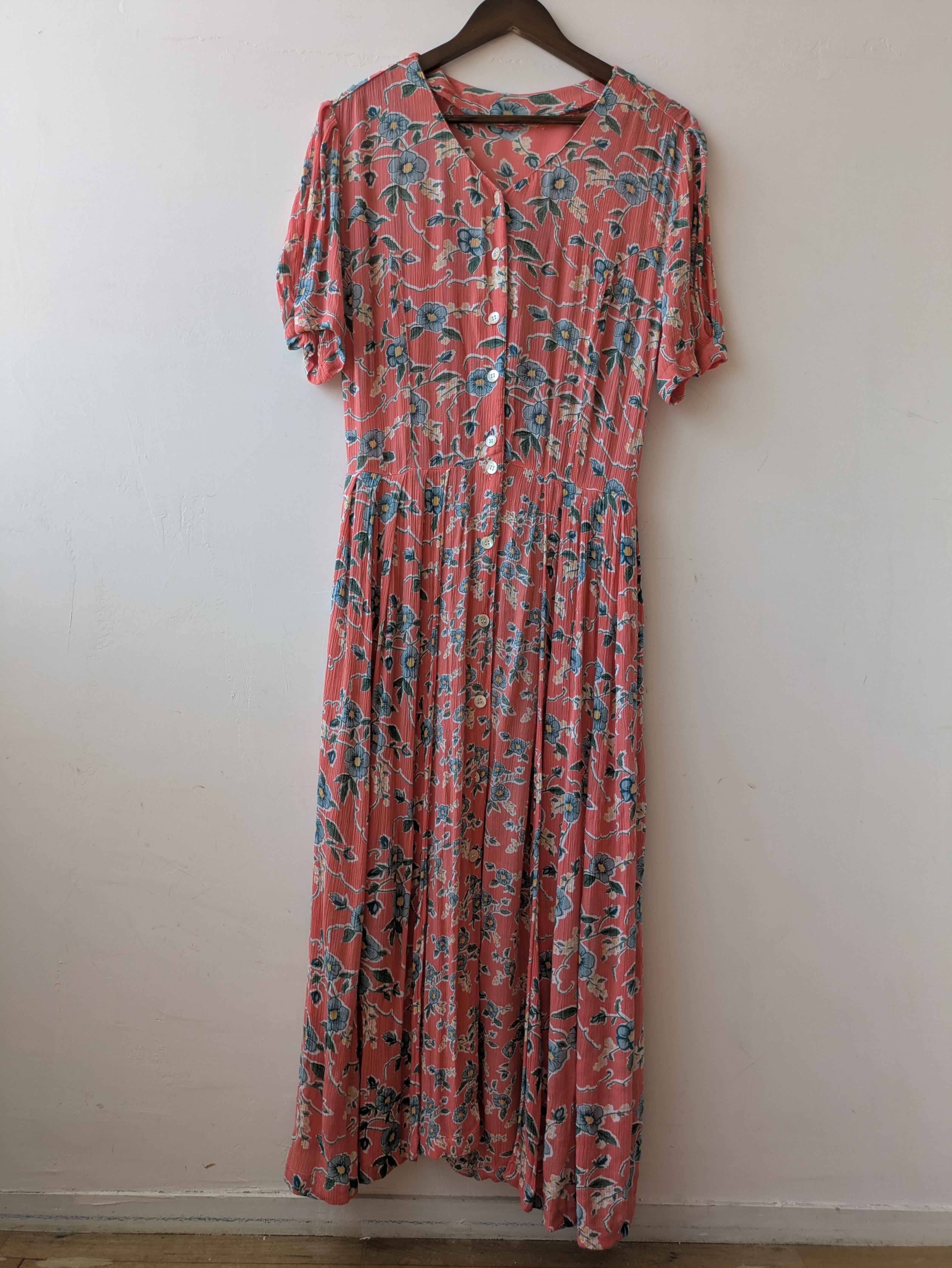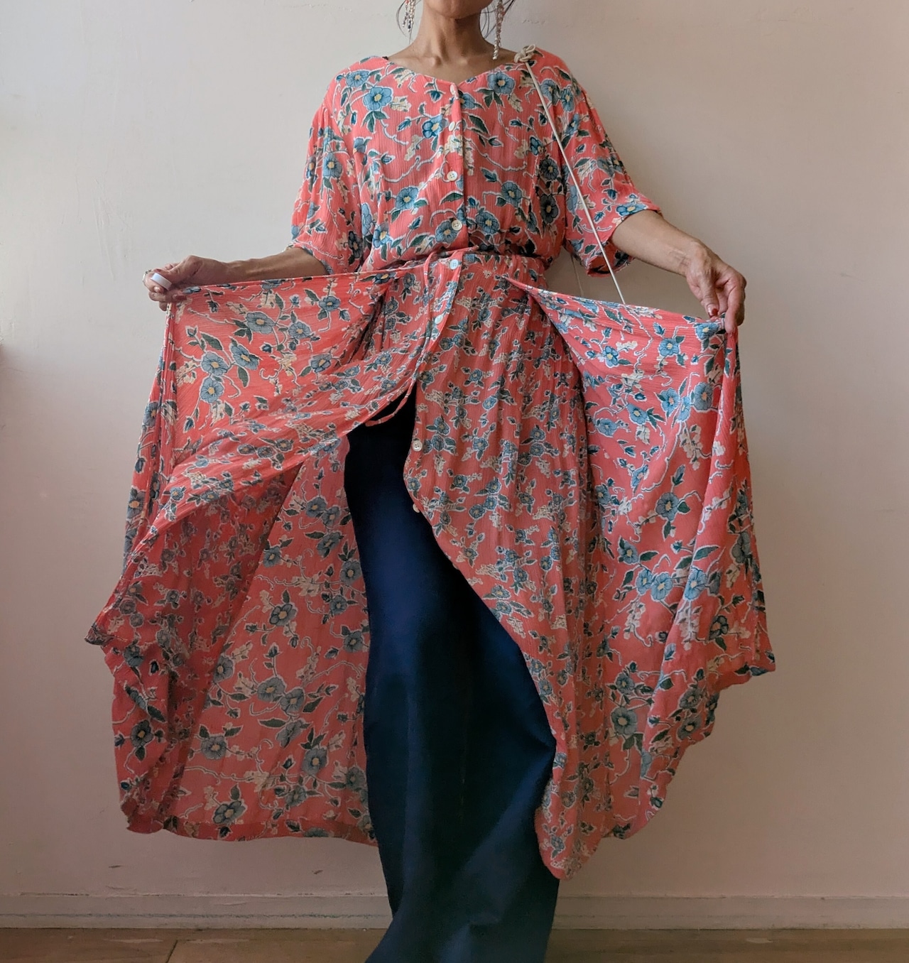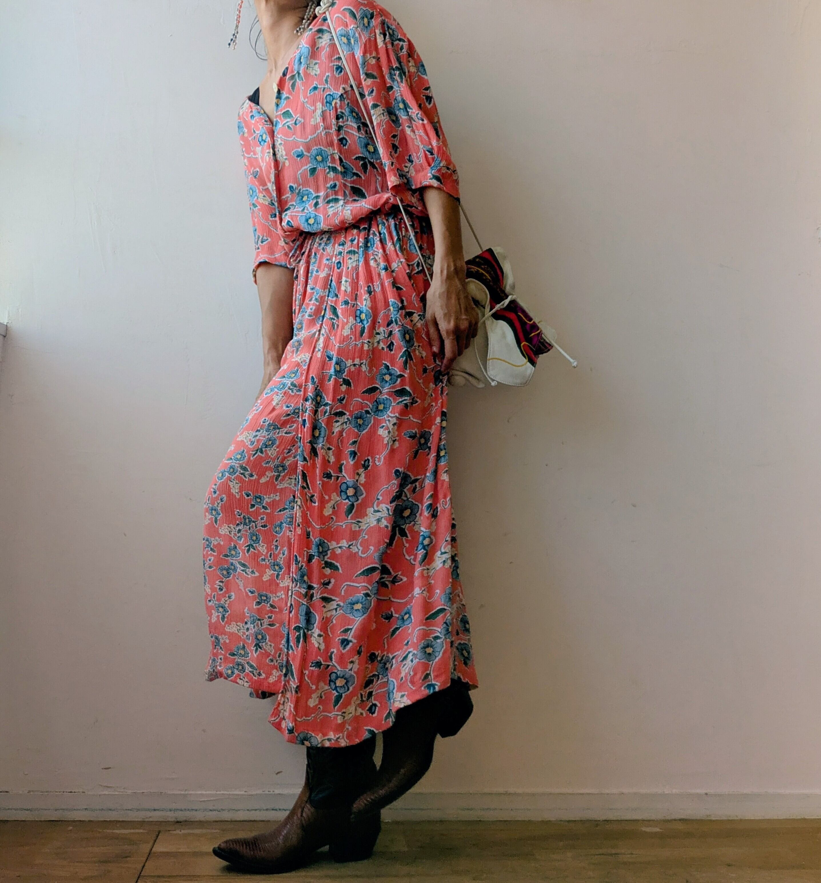華やかな色使いと花柄、ふんだんにあしらわれたドレープが魅力のワンピース。