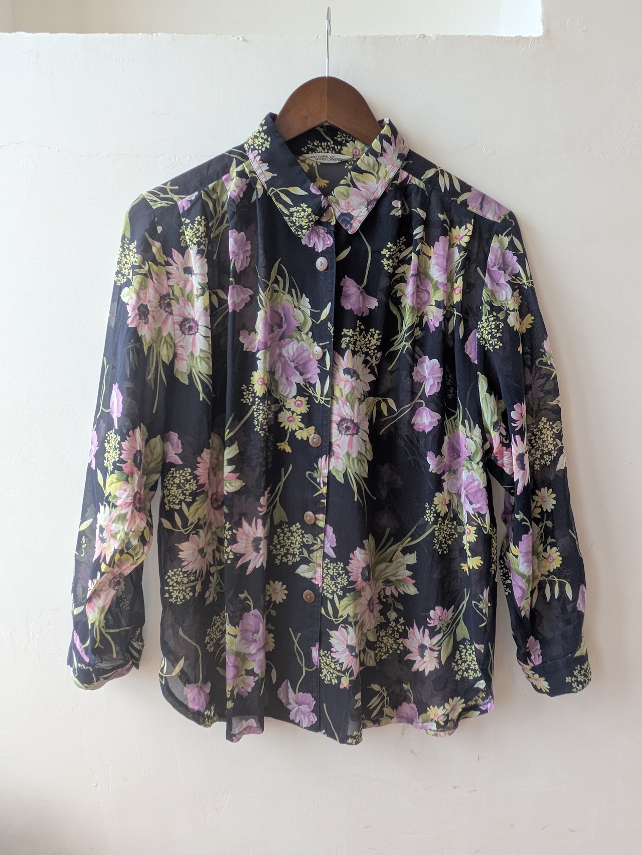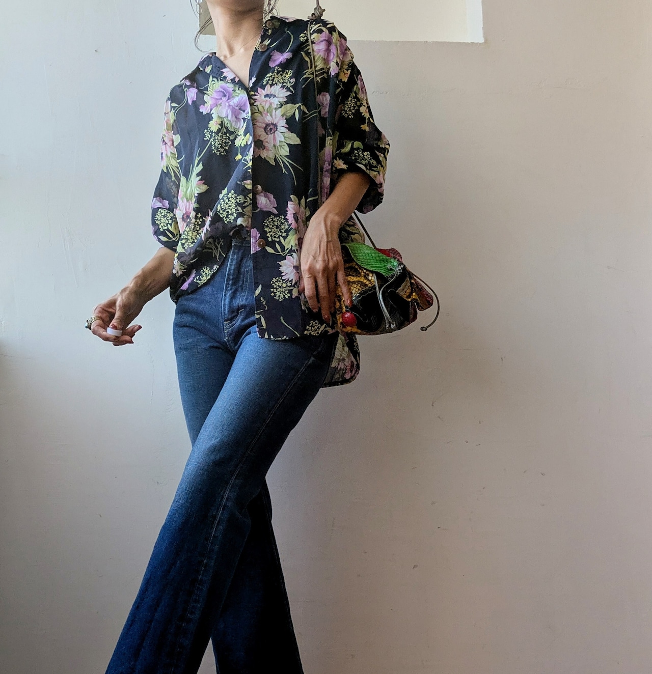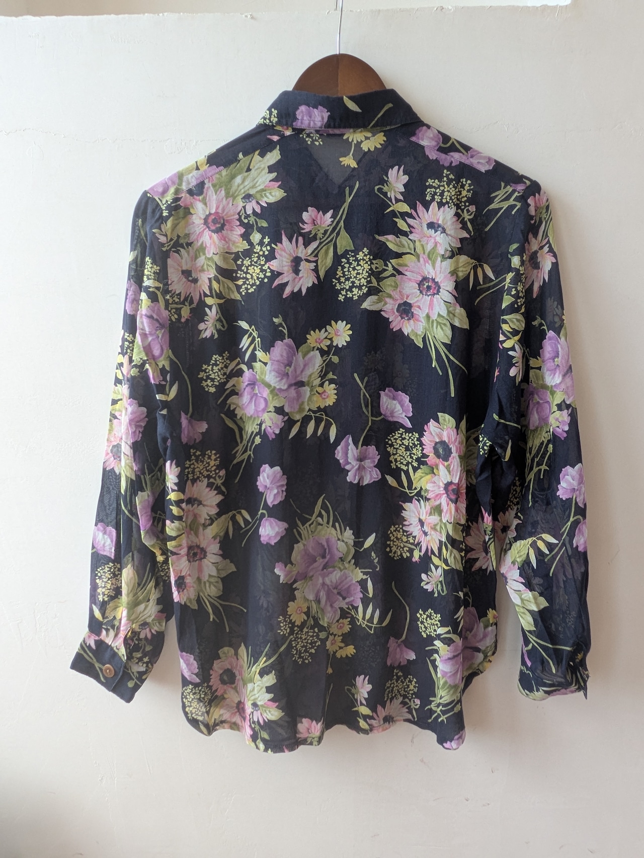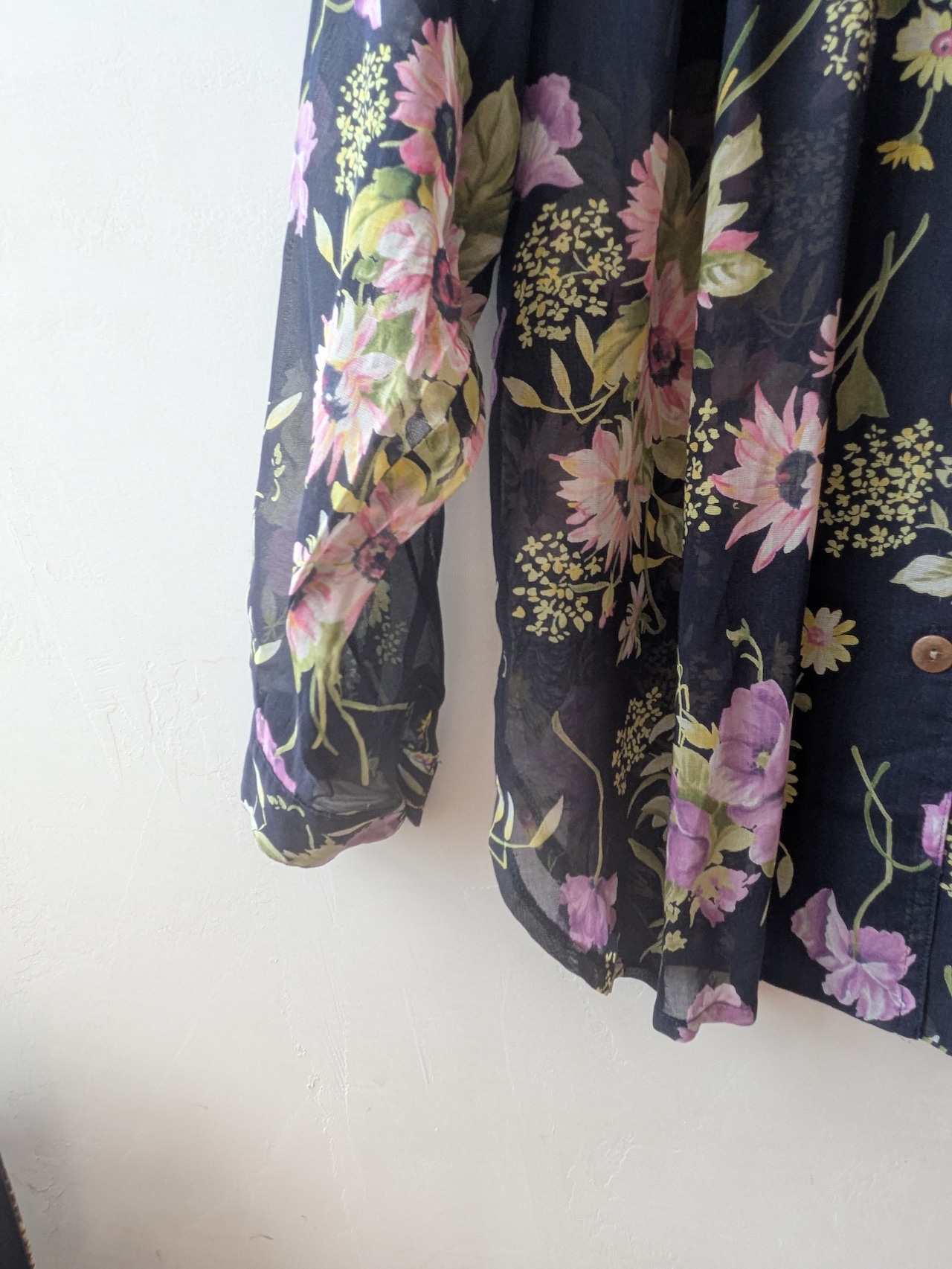 繊細で美しい花柄が魅力の透け感のあるヴィンテージシャツです。軽やかな素材感とゆったりとしたシルエットが、リラックスした着心地で、女性らしさを引き立ててくれます。