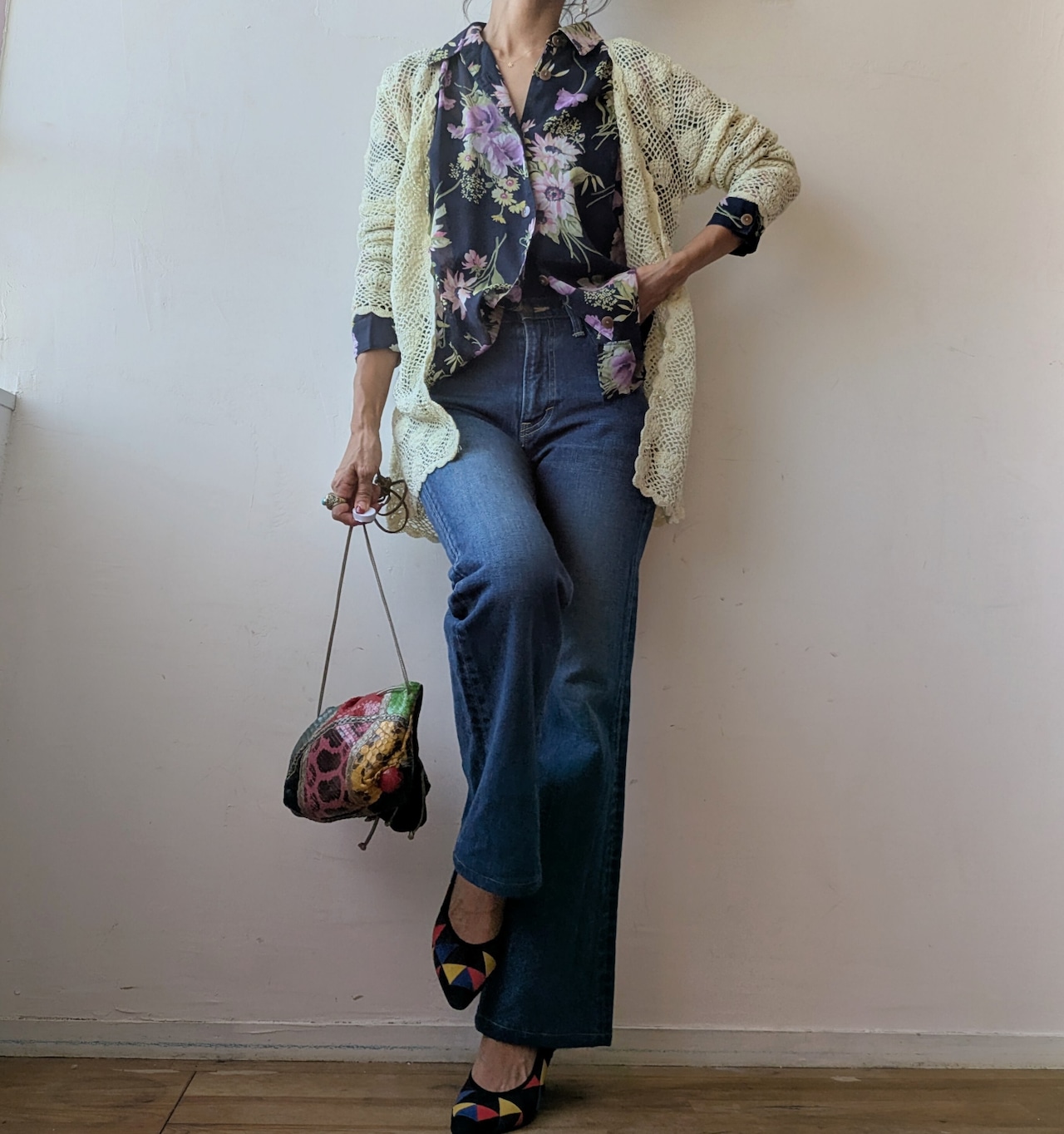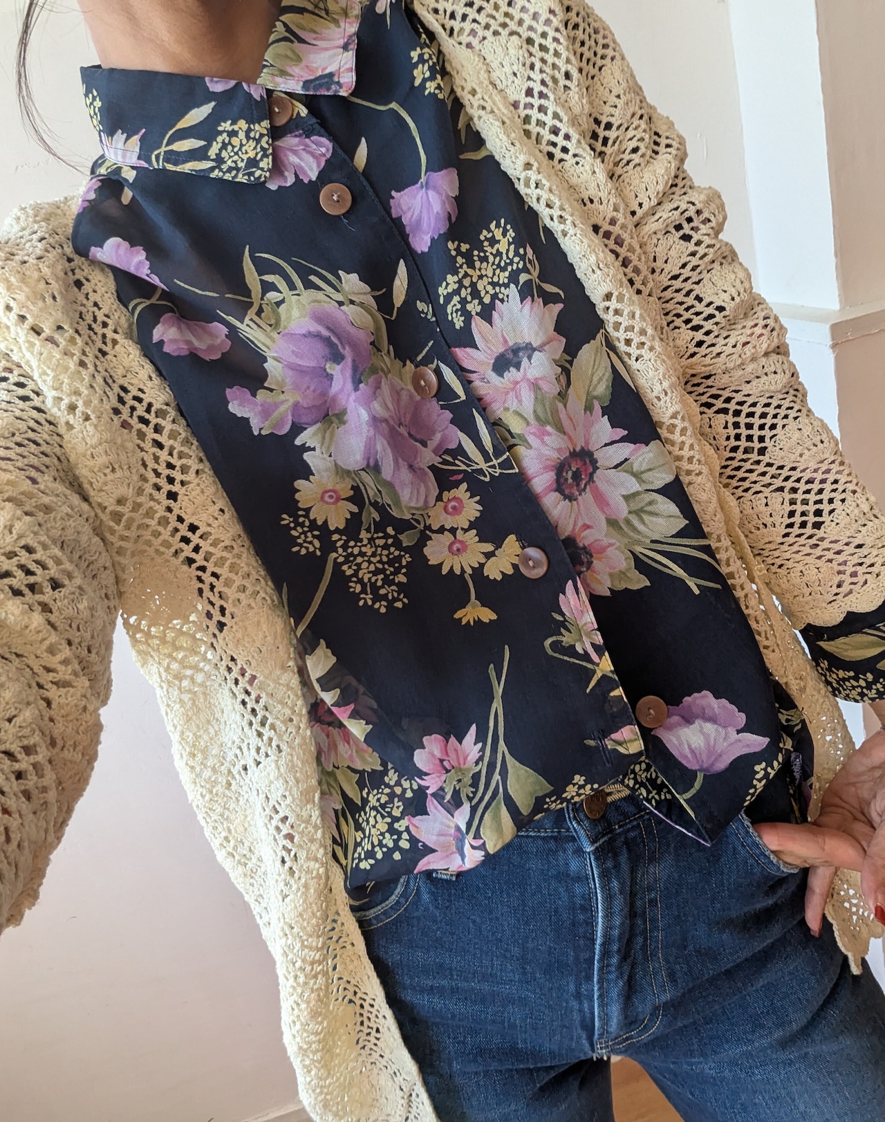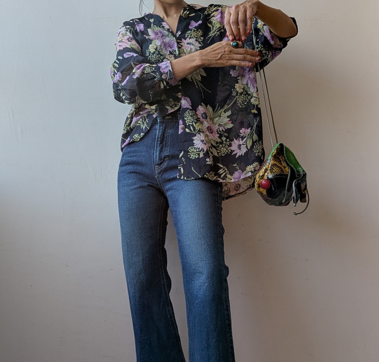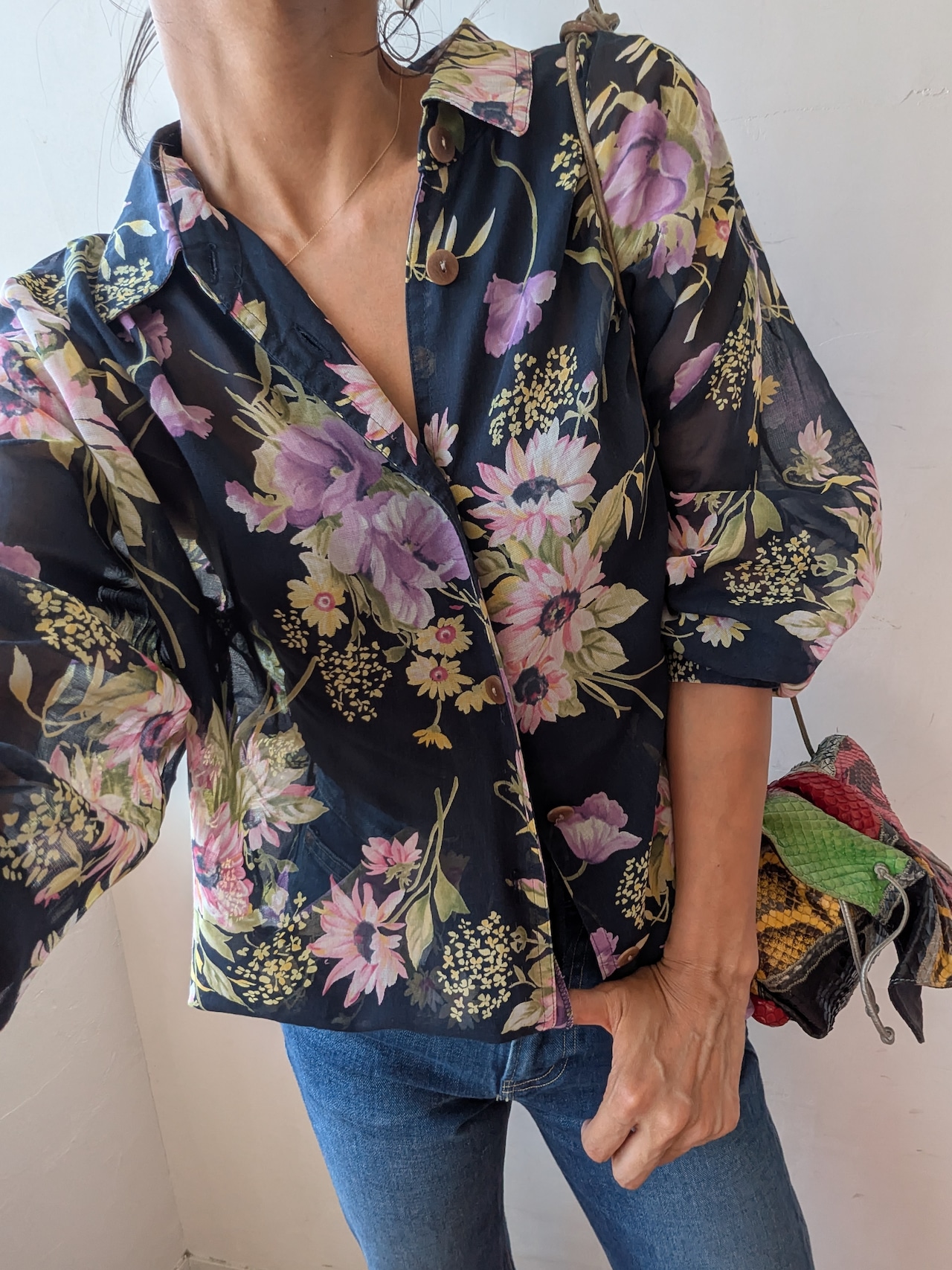 繊細で美しい花柄が魅力の透け感のあるヴィンテージシャツです。軽やかな素材感とゆったりとしたシルエットが、リラックスした着心地で、女性らしさを引き立ててくれます。