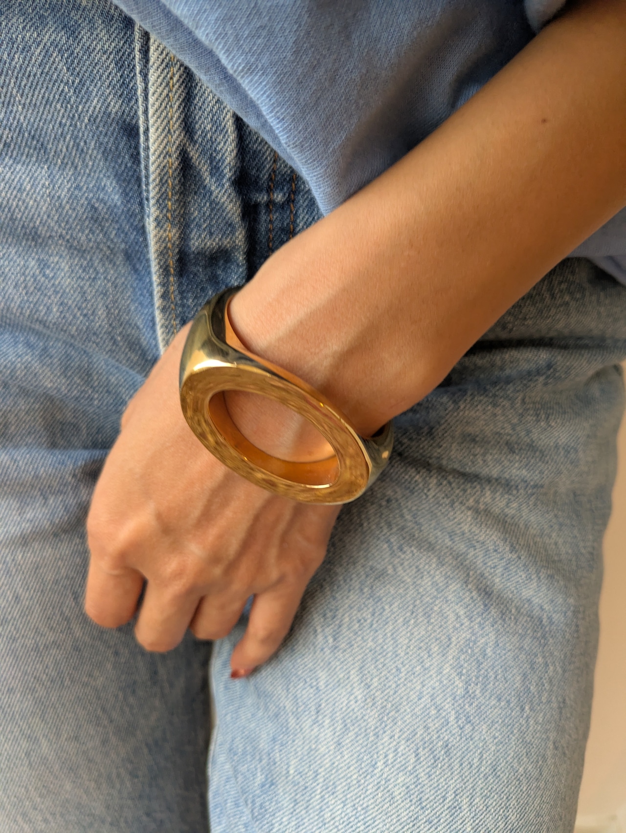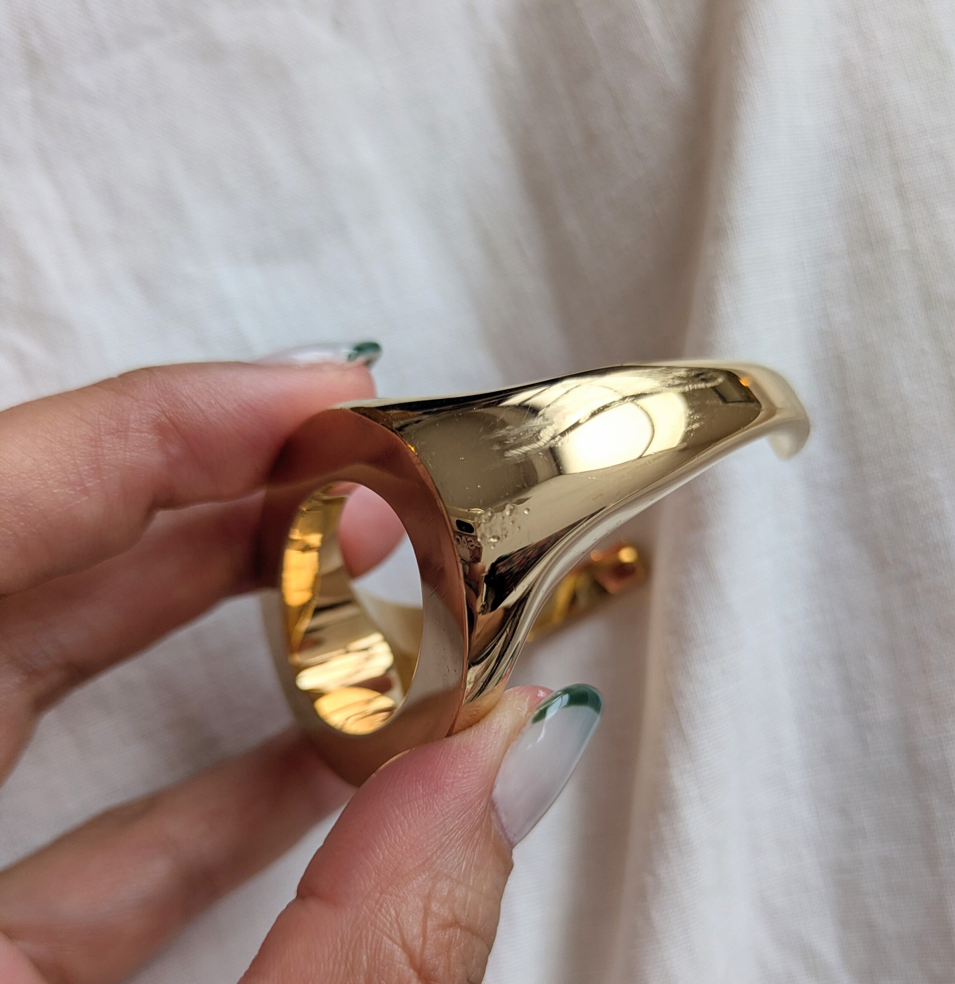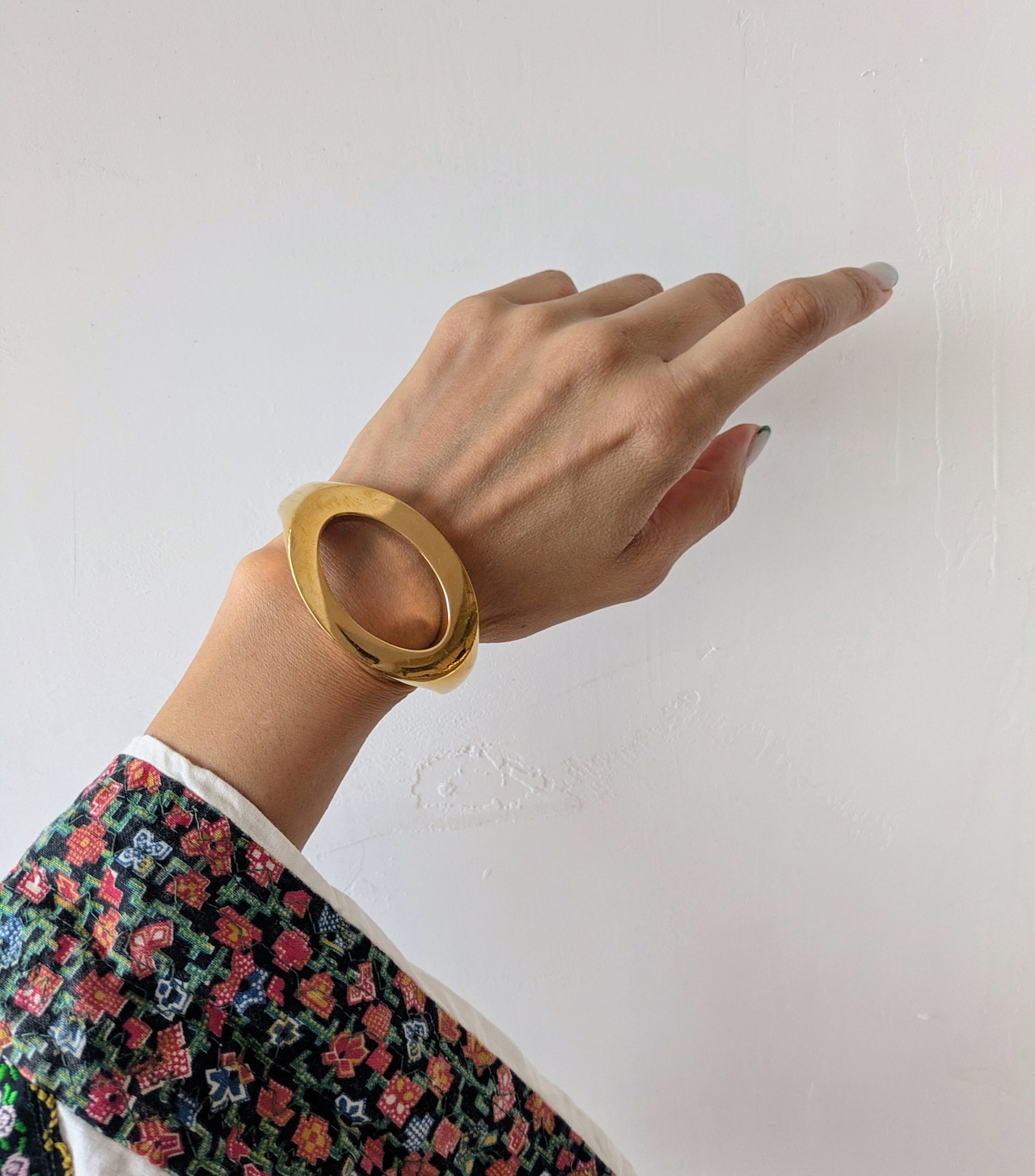 シンプルでありながらも重量感とインパクトのあるゴールドのバングルは、どんなスタイルにもエレガントなアクセントを加えてくれます。日常使いはもちろん、特別なイベントやお出かけにも最適です。