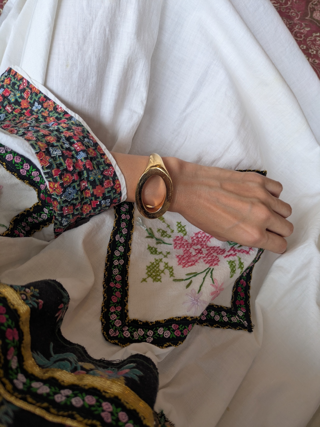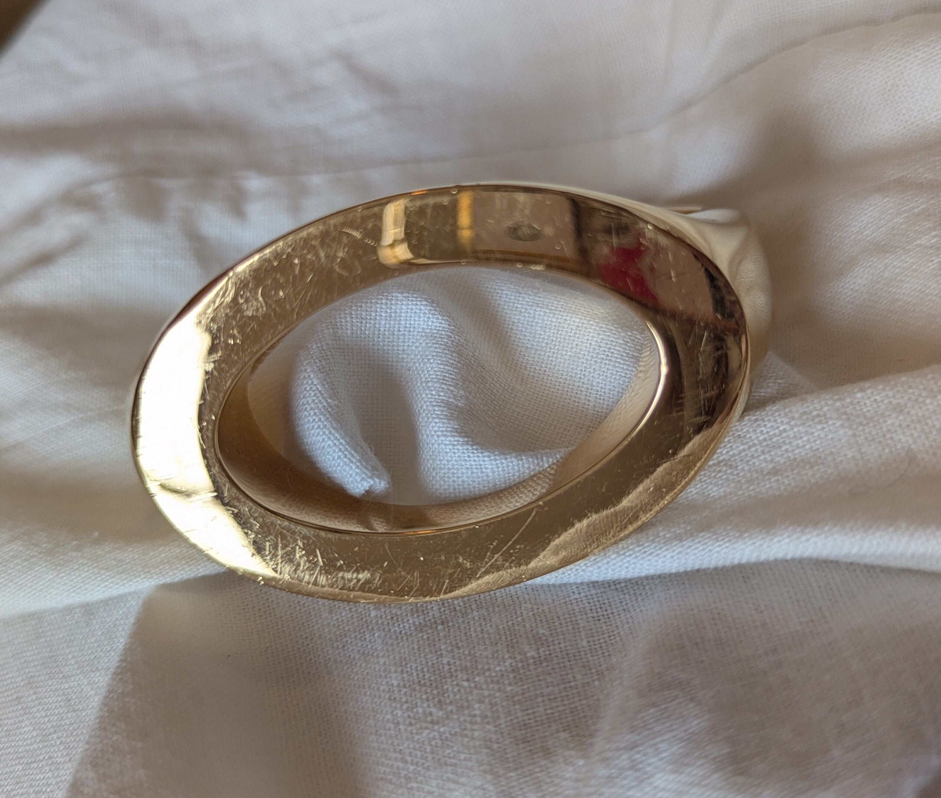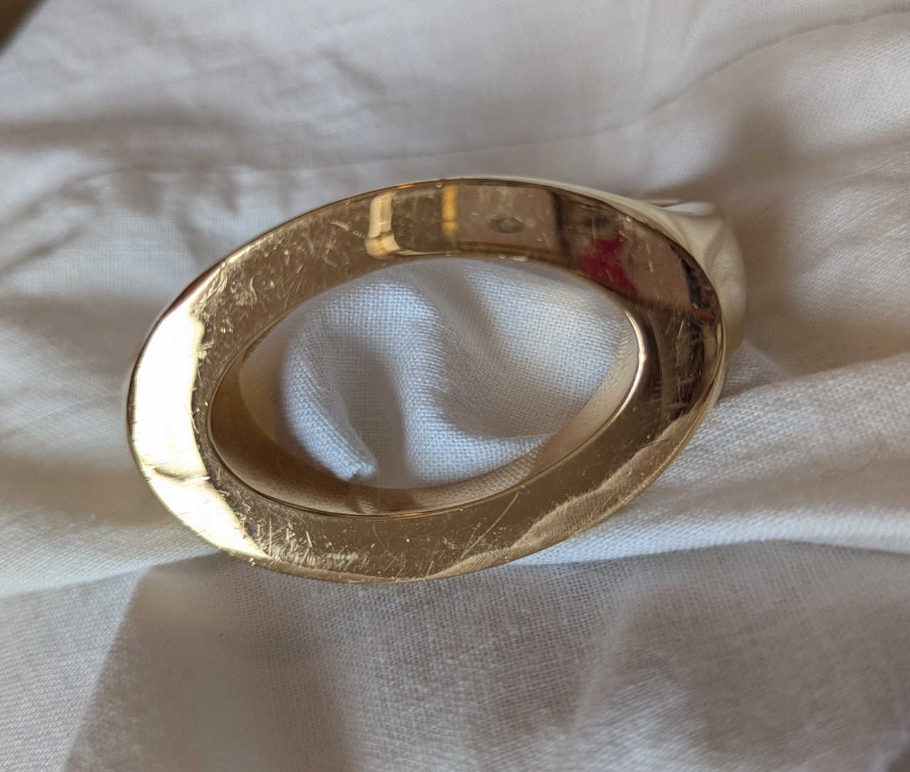 シンプルでありながらも重量感とインパクトのあるゴールドのバングルは、どんなスタイルにもエレガントなアクセントを加えてくれます。日常使いはもちろん、特別なイベントやお出かけにも最適です。