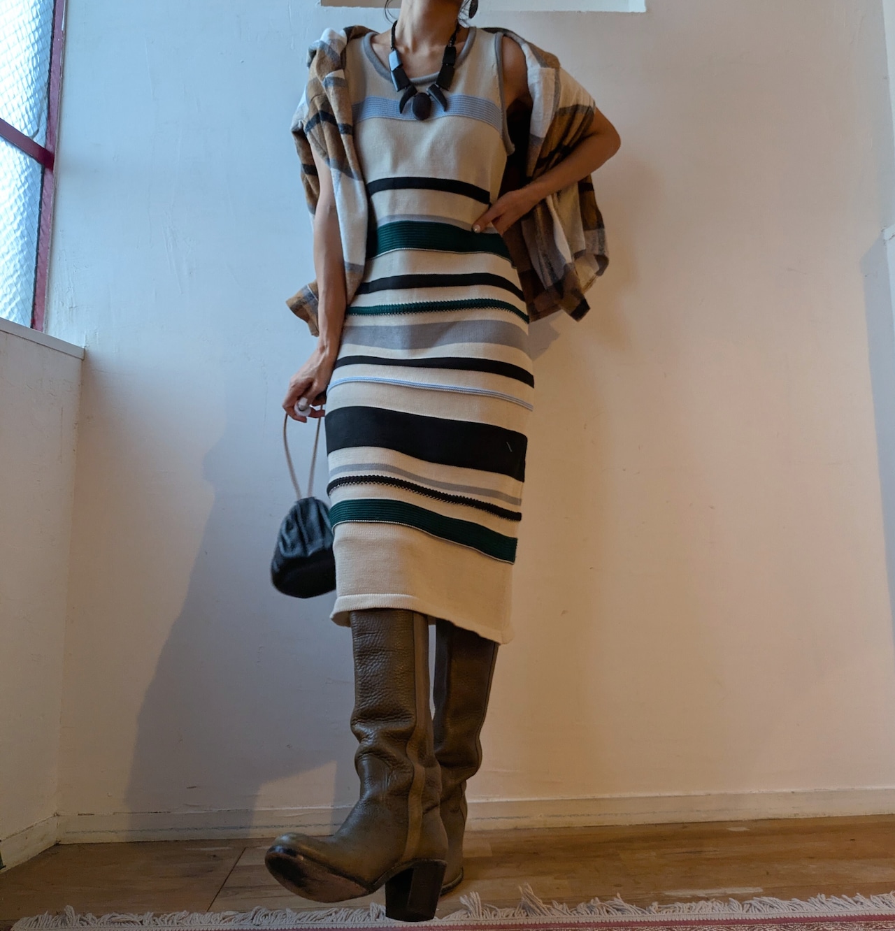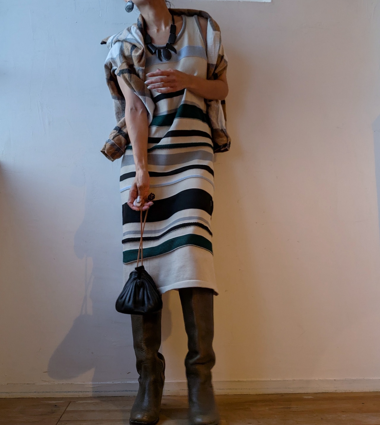 今の季節にシャツや、カーディガンと併せるのにぴったりで、カジュアルながらもおしゃれな落ち着いた雰囲気です。