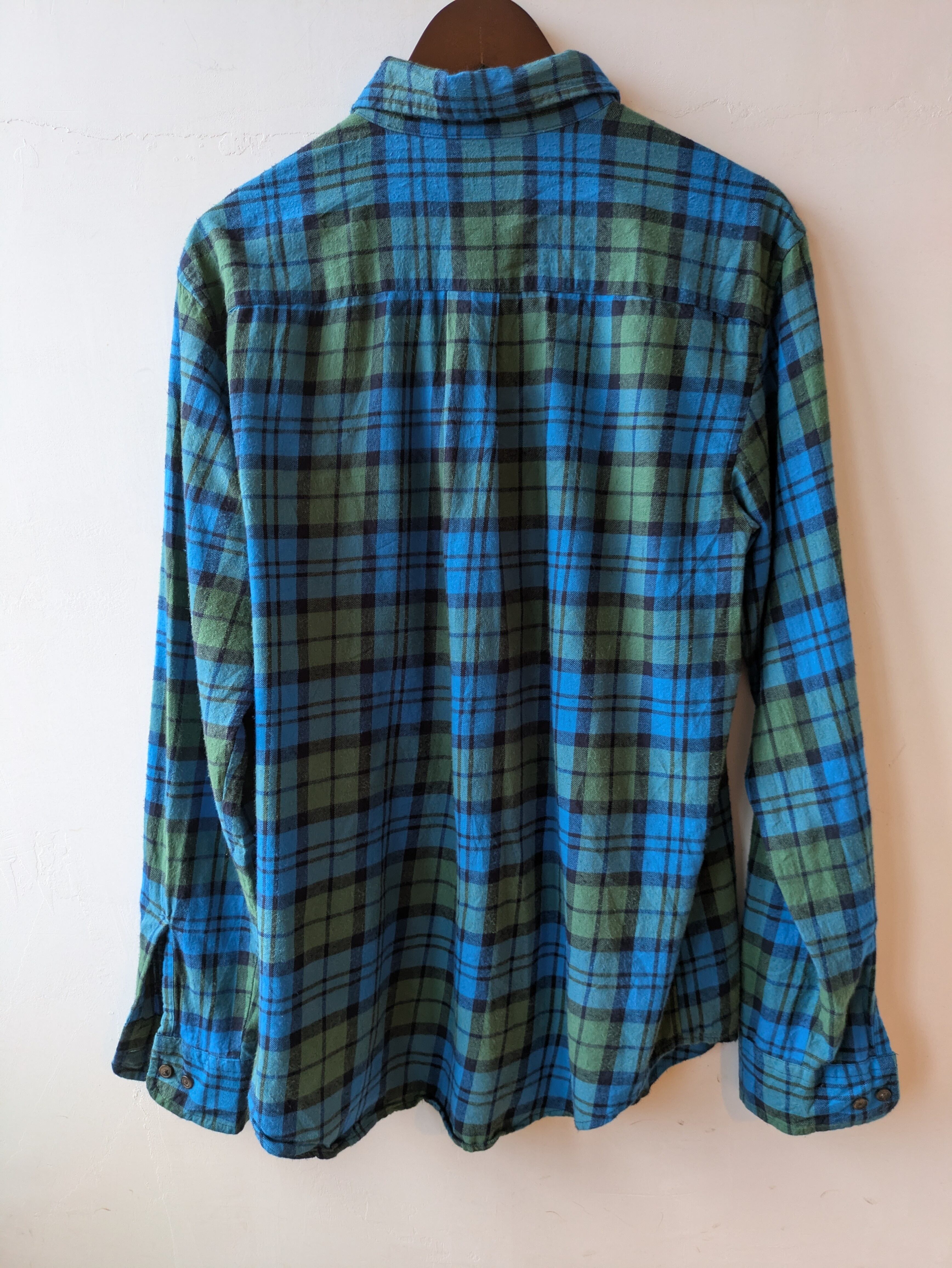 アメリカンヴィンテージの魅力が詰まったブルー系チェック柄フランネルシャツです。柔らかいフランネル生地は暖かく肌触りも良いので、肌寒い日の羽織りとしても着回しの効く1着。