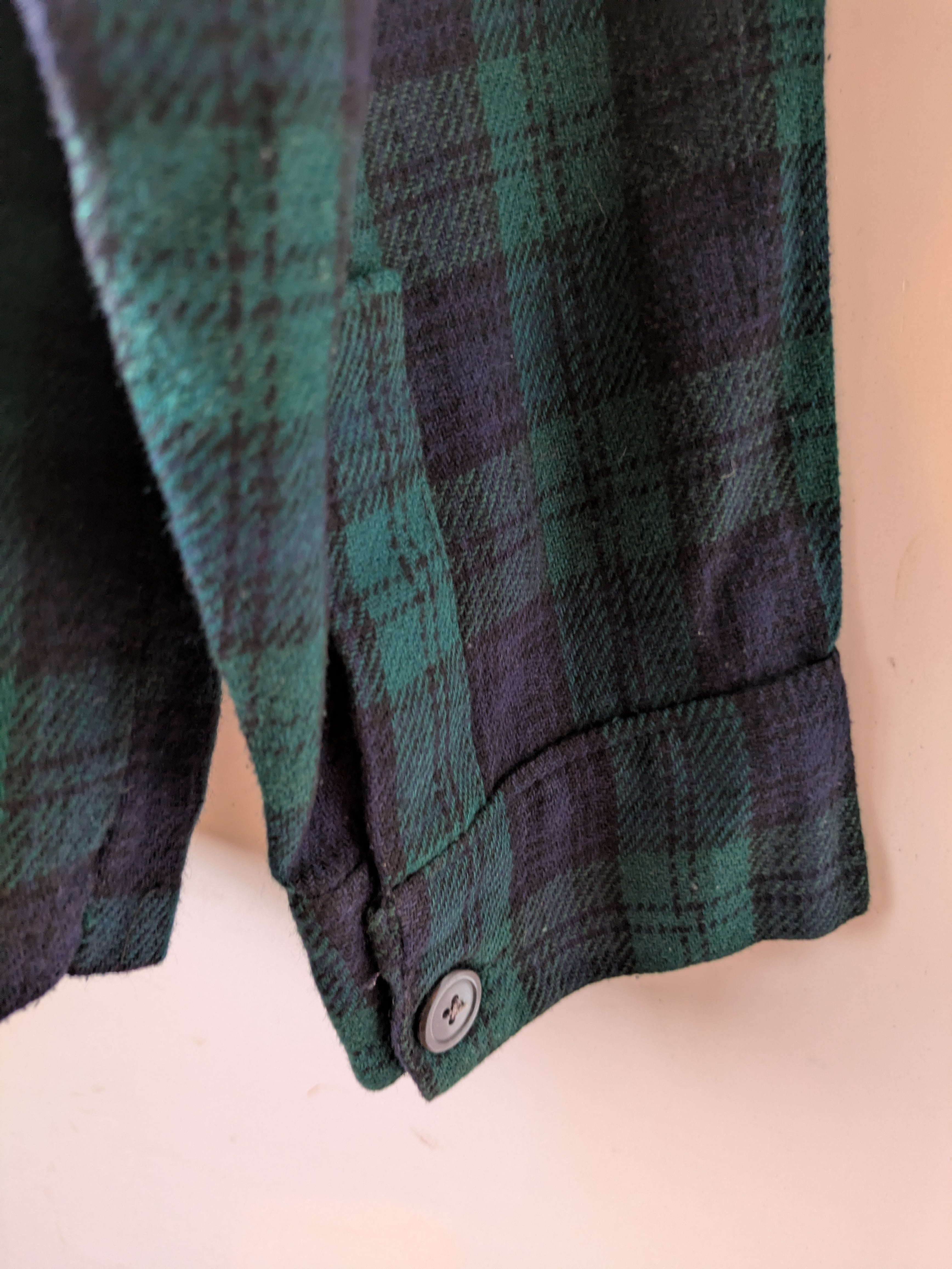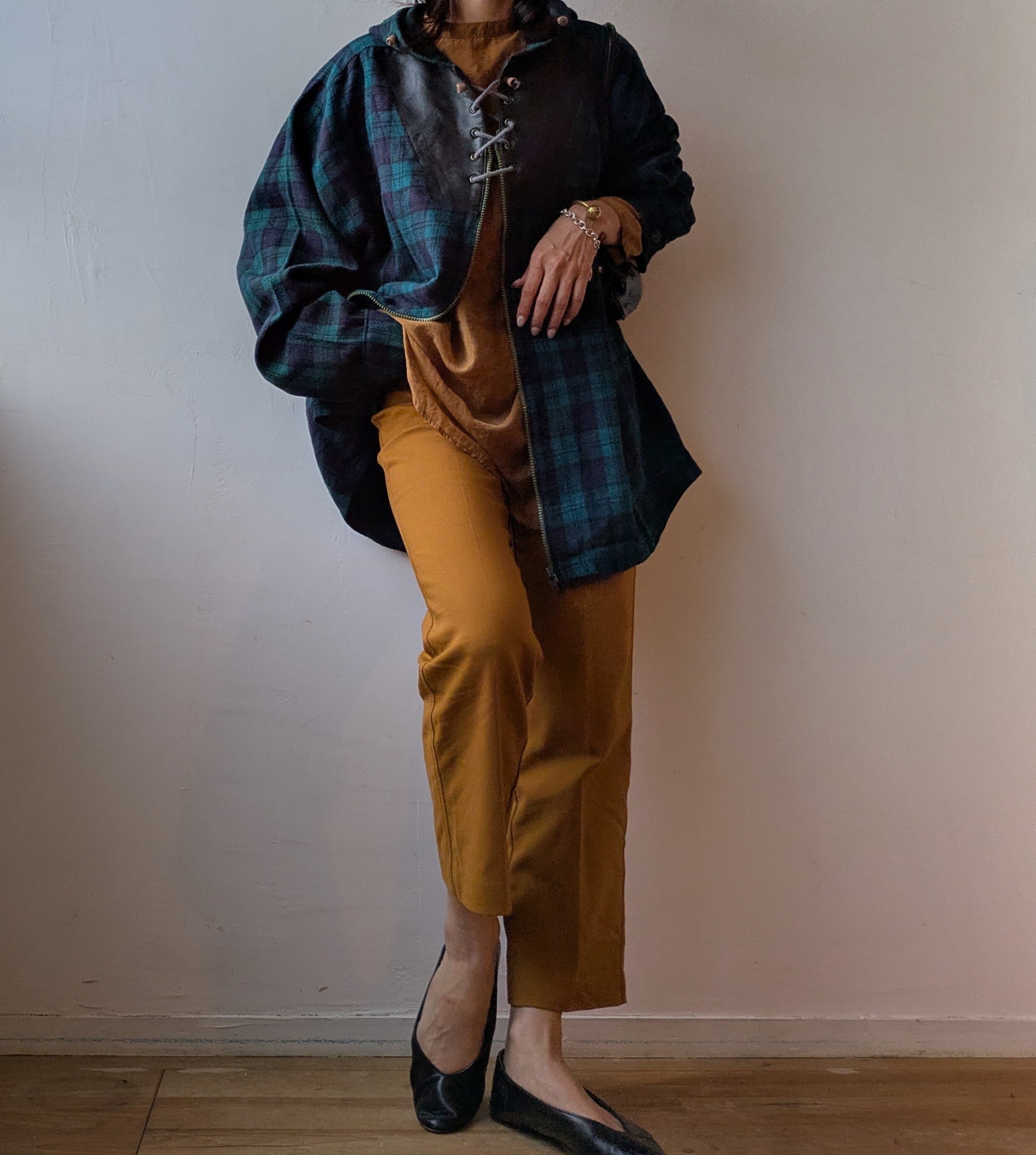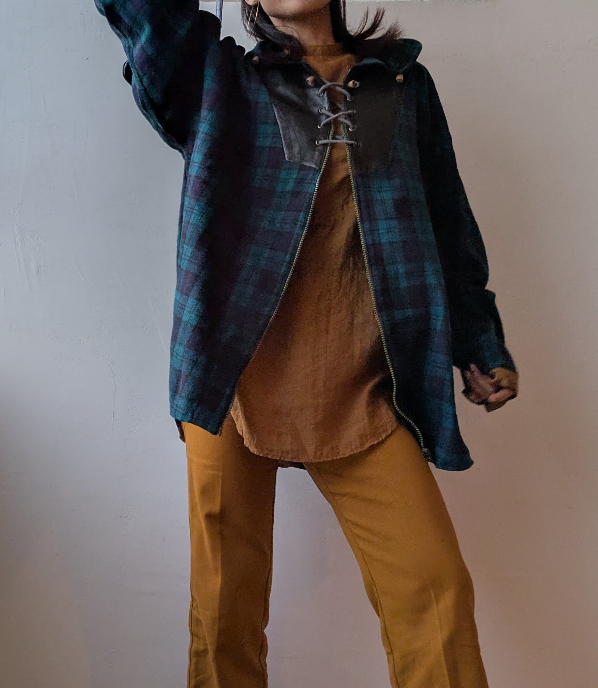 スタンダードなチェック柄に胸元のレースアップとレザーがかっこいい、