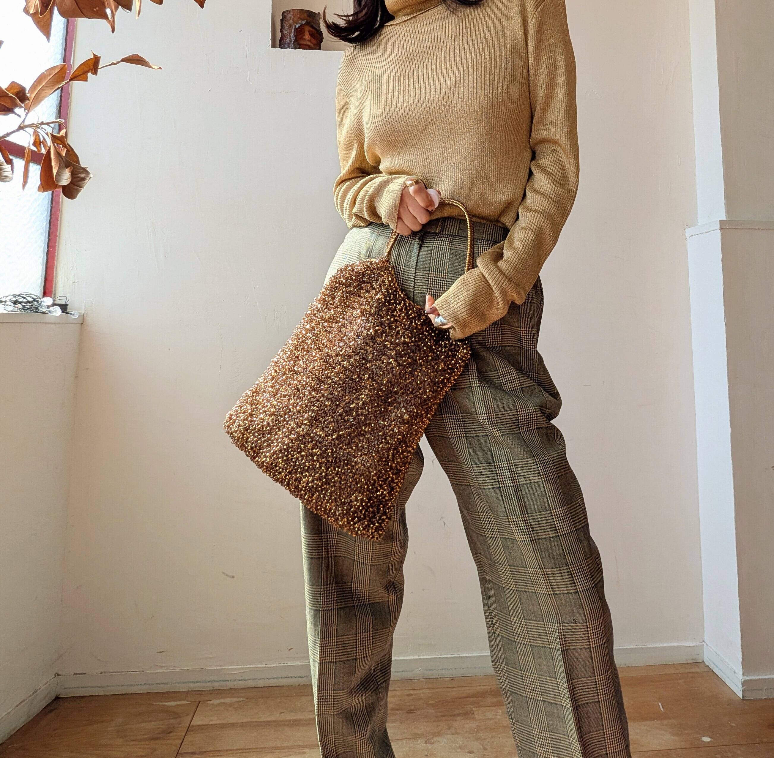 落ち着いたブロンズカラーが派手すぎず、コーデのポイントに。