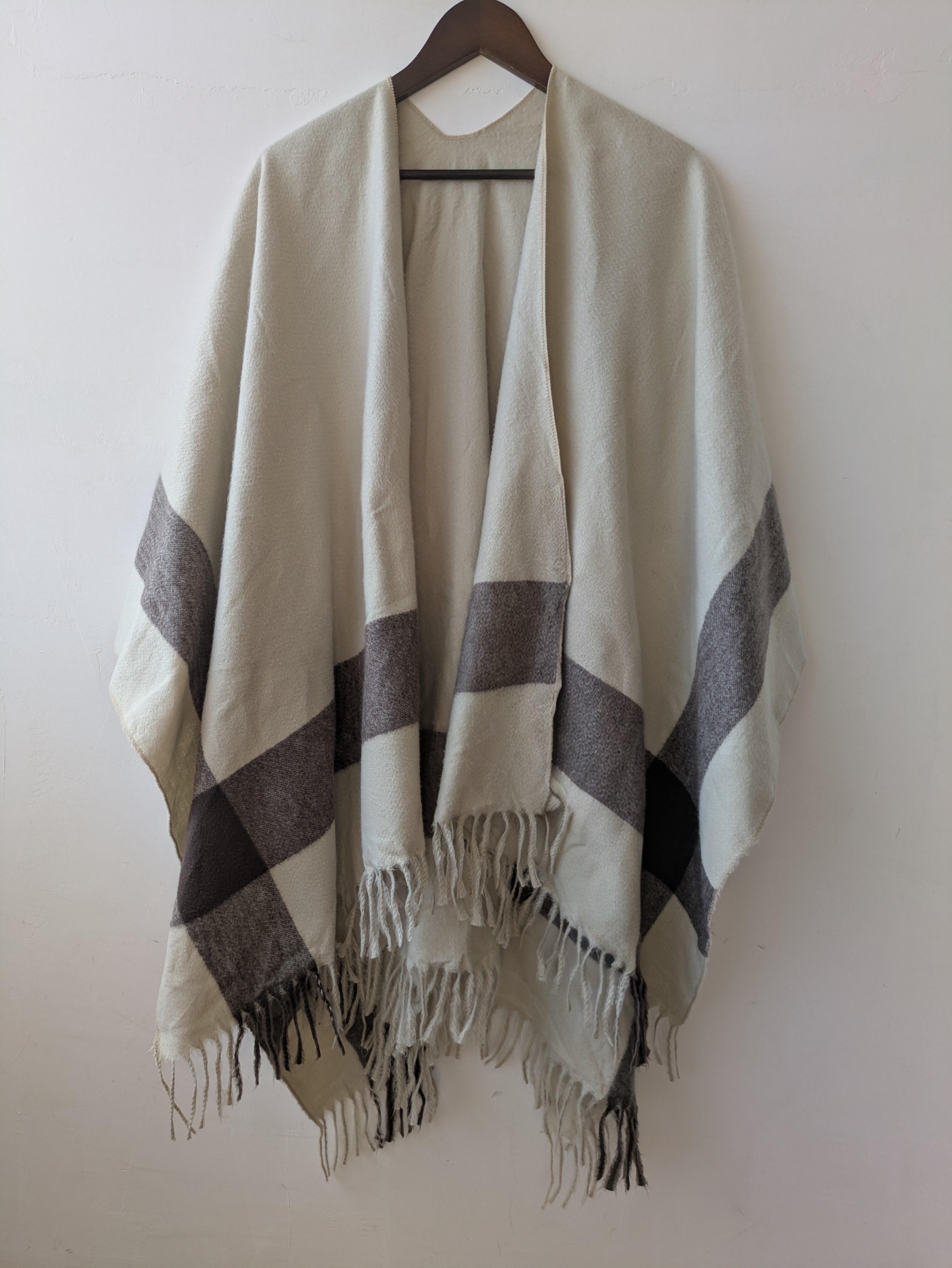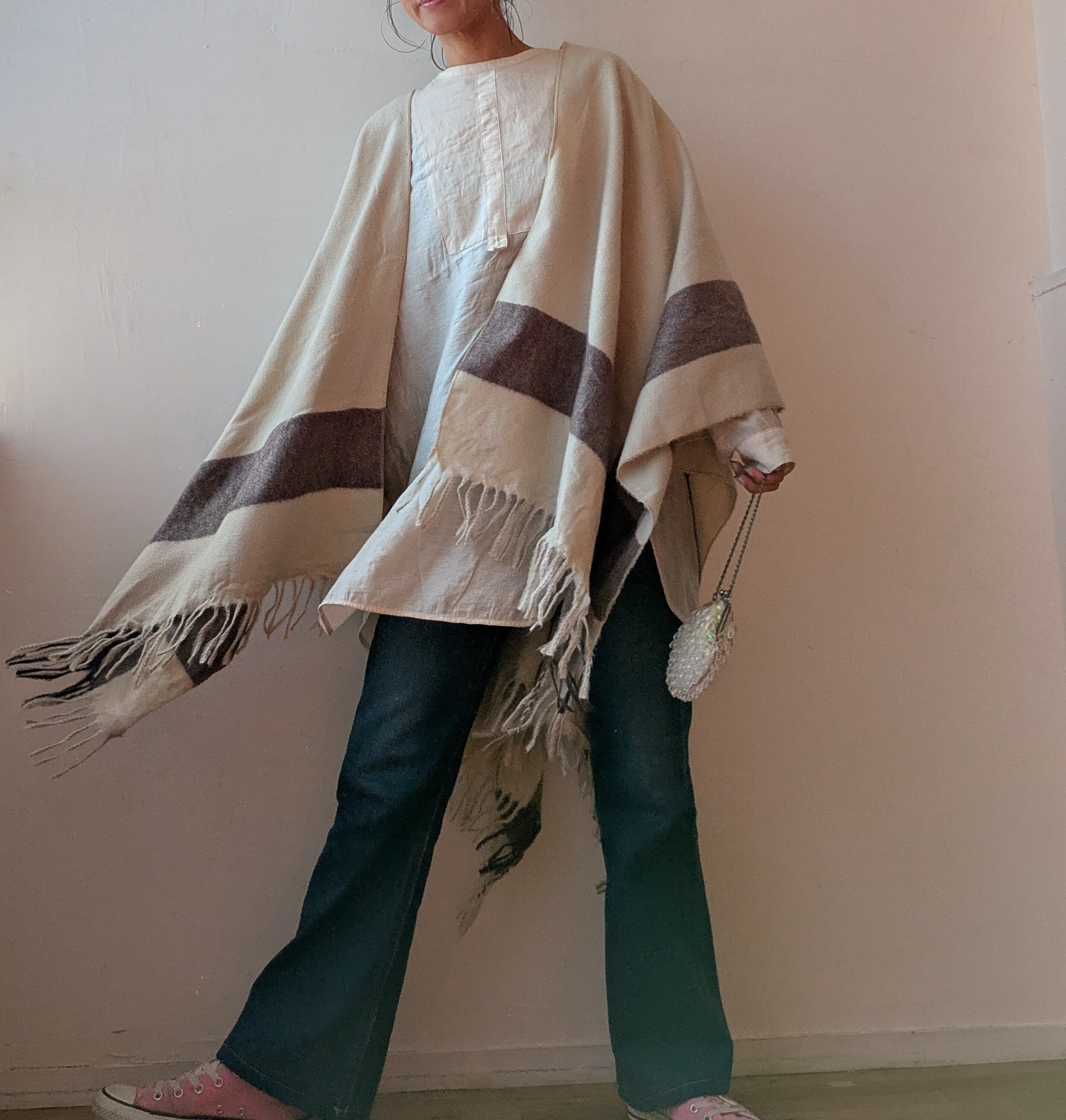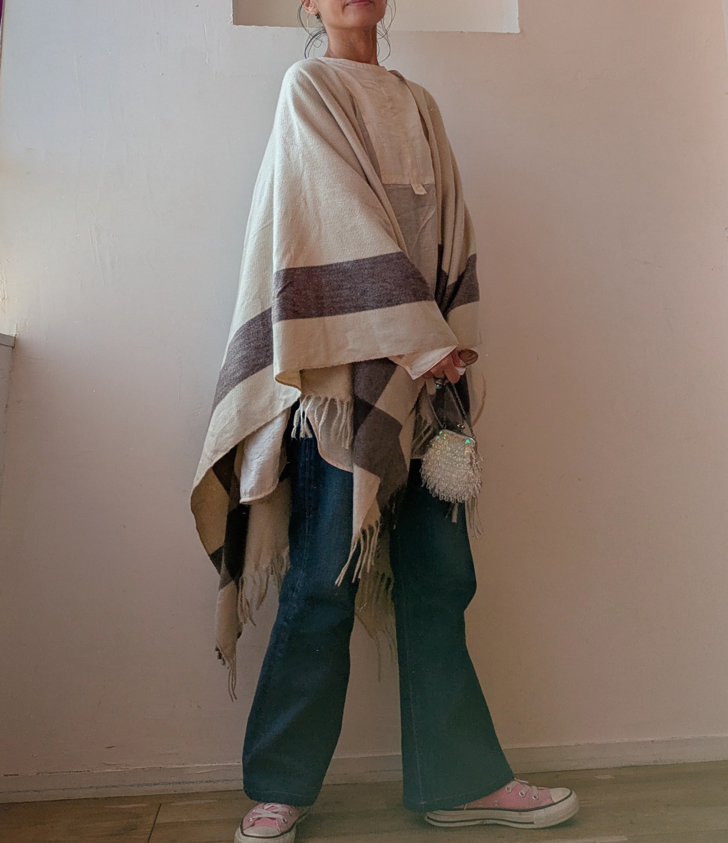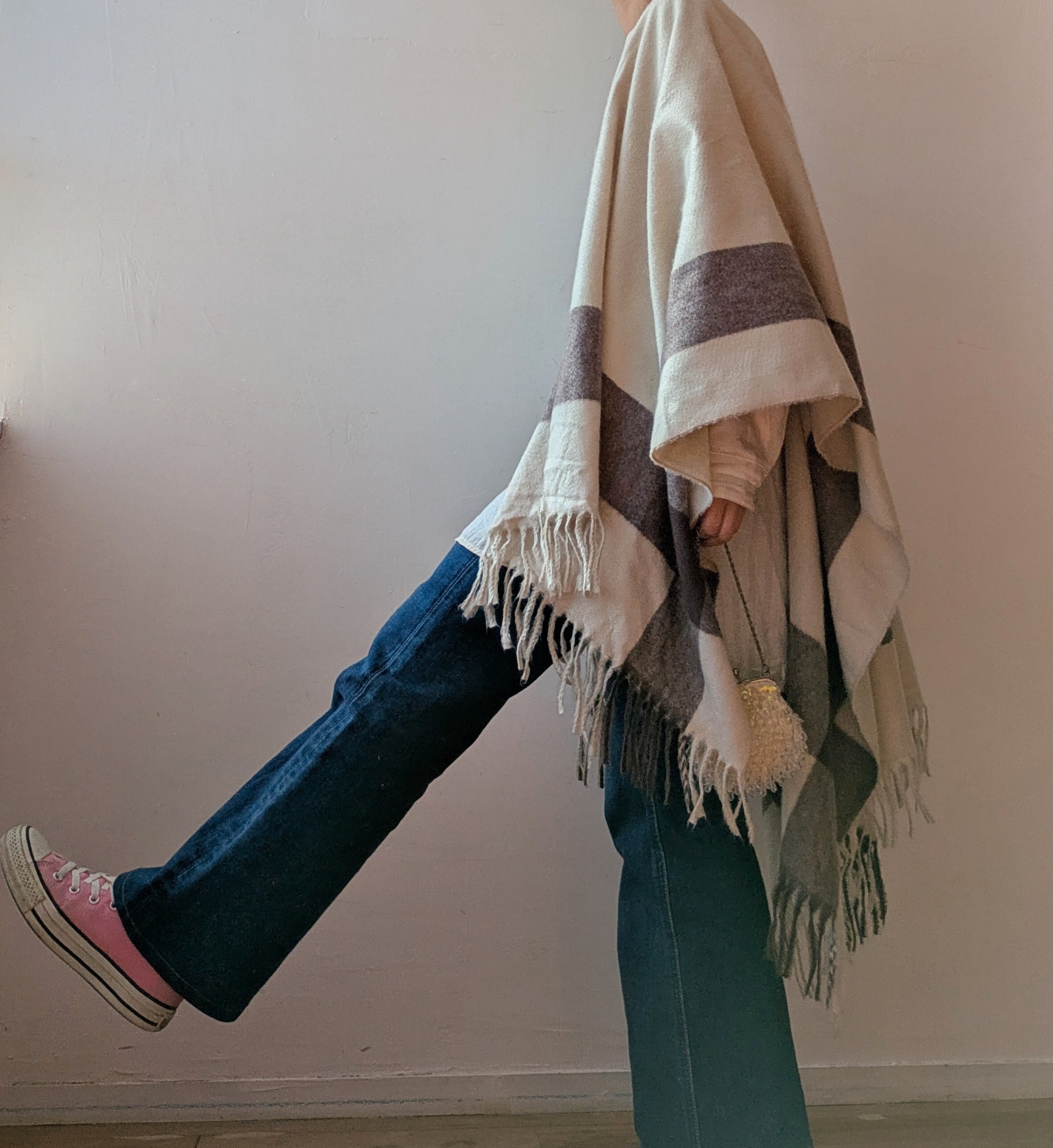 秋冬のコーディネートにぴったりな、上品なカシミヤタッチのビッグポンチョストールです。