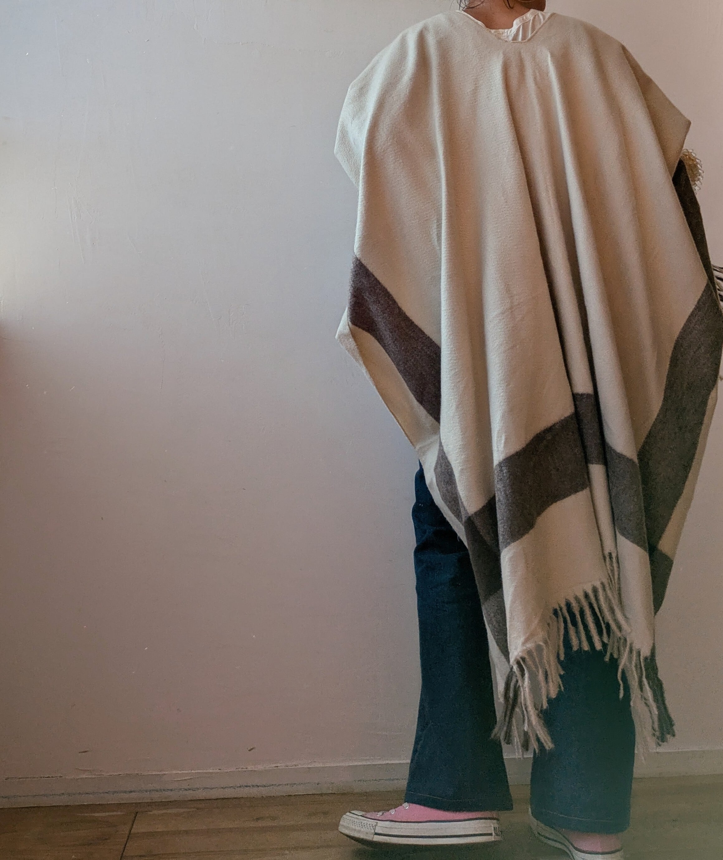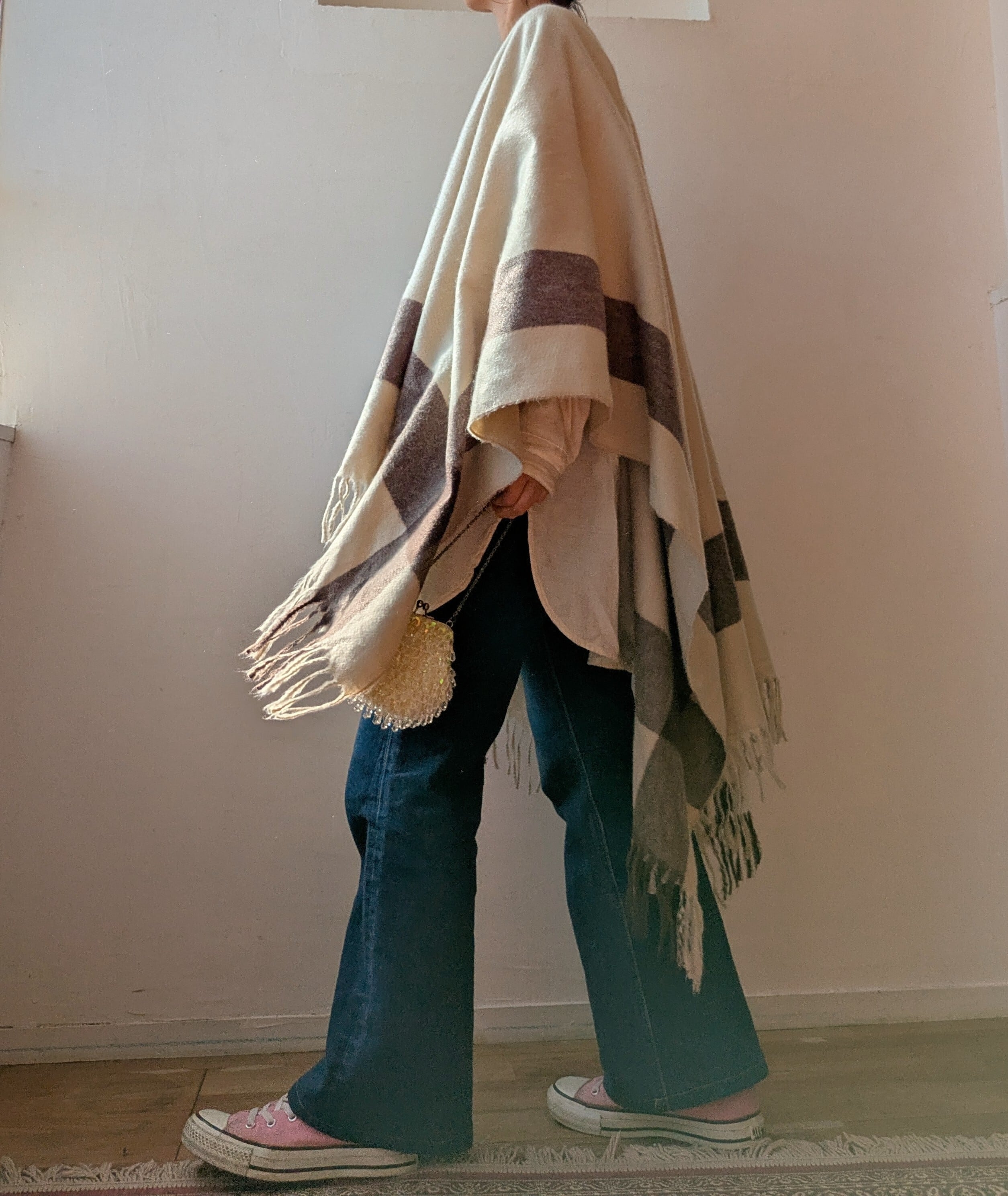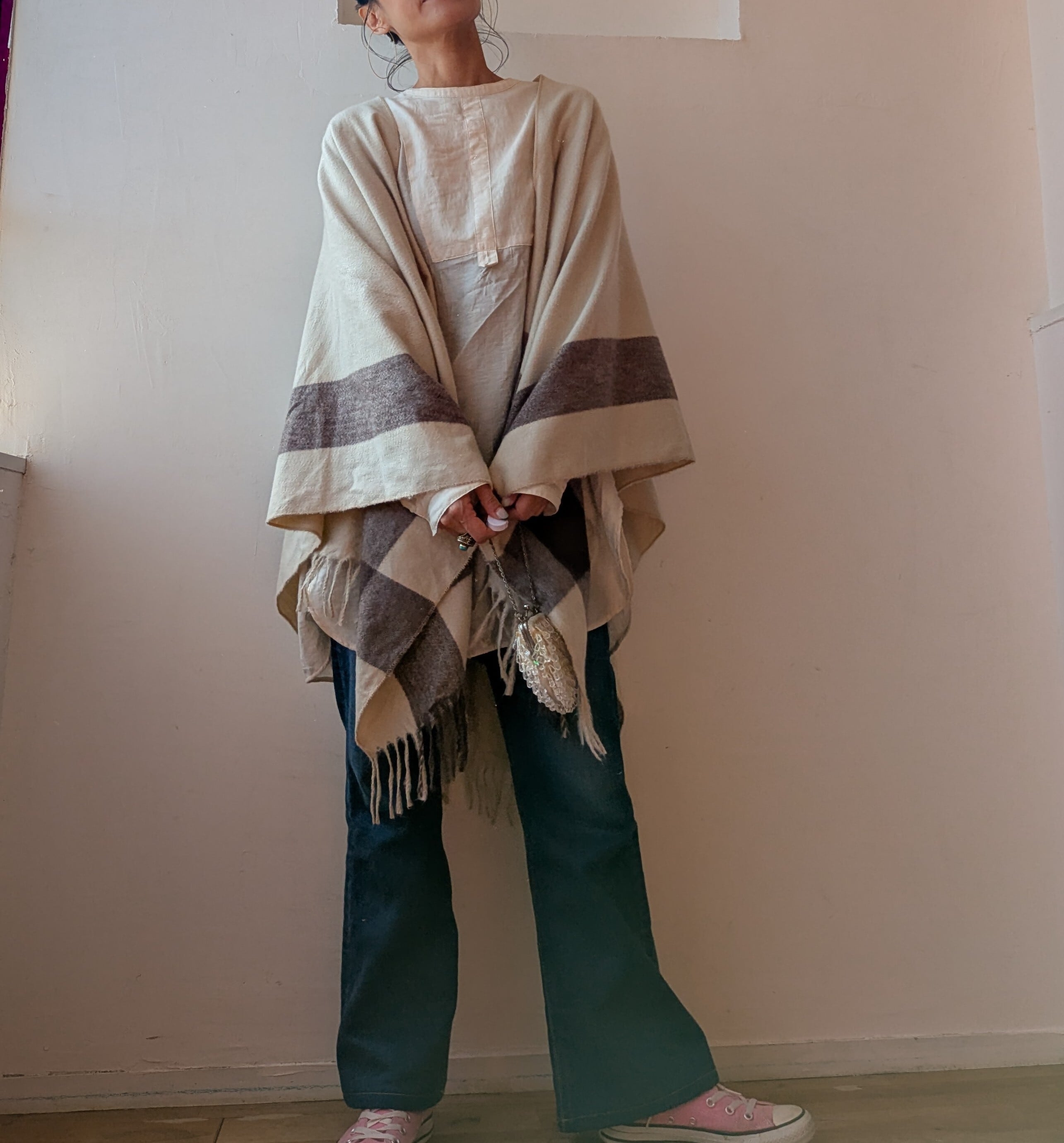 秋冬のコーディネートにぴったりな、上品なカシミヤタッチのビッグポンチョストールです。