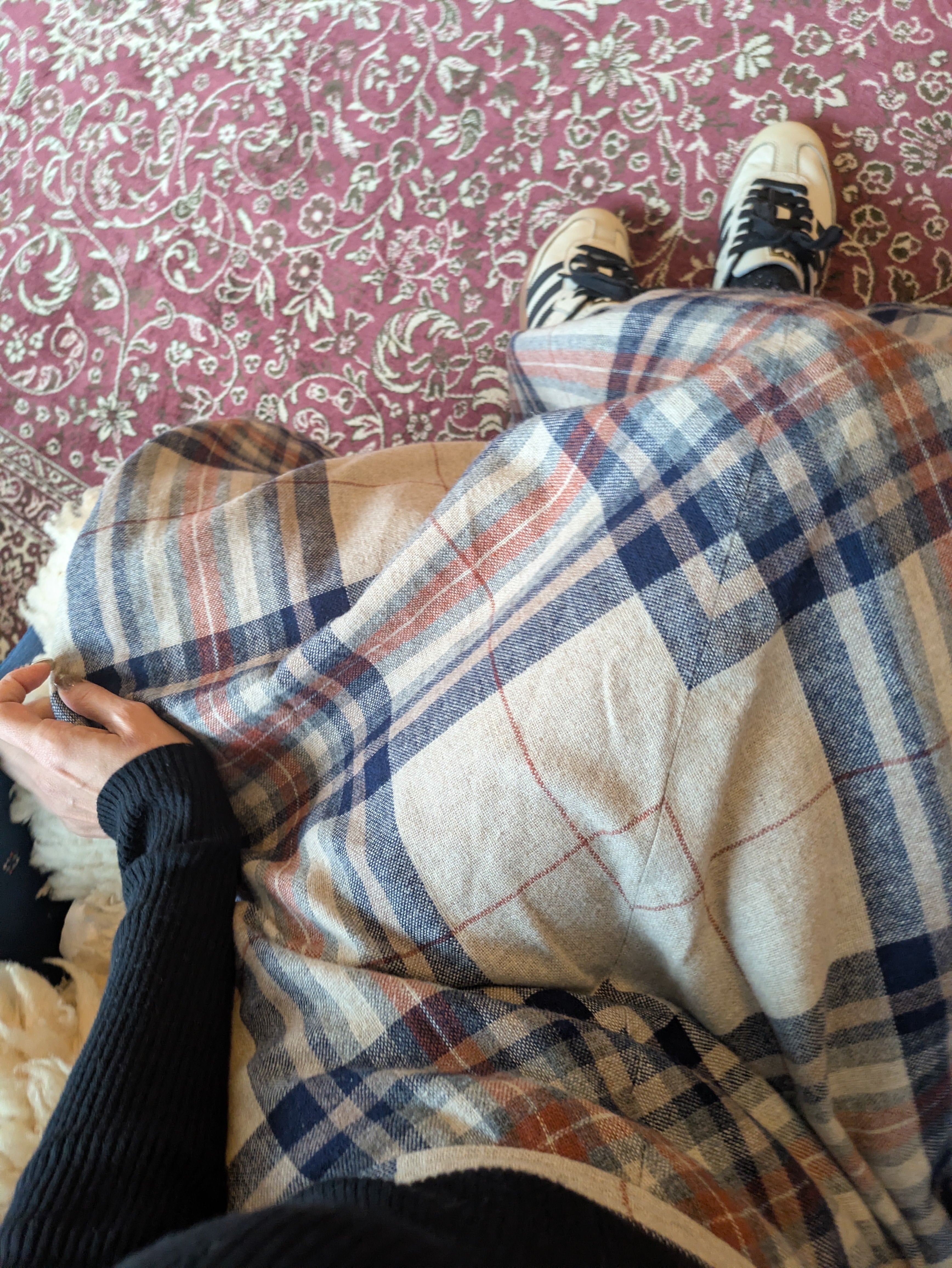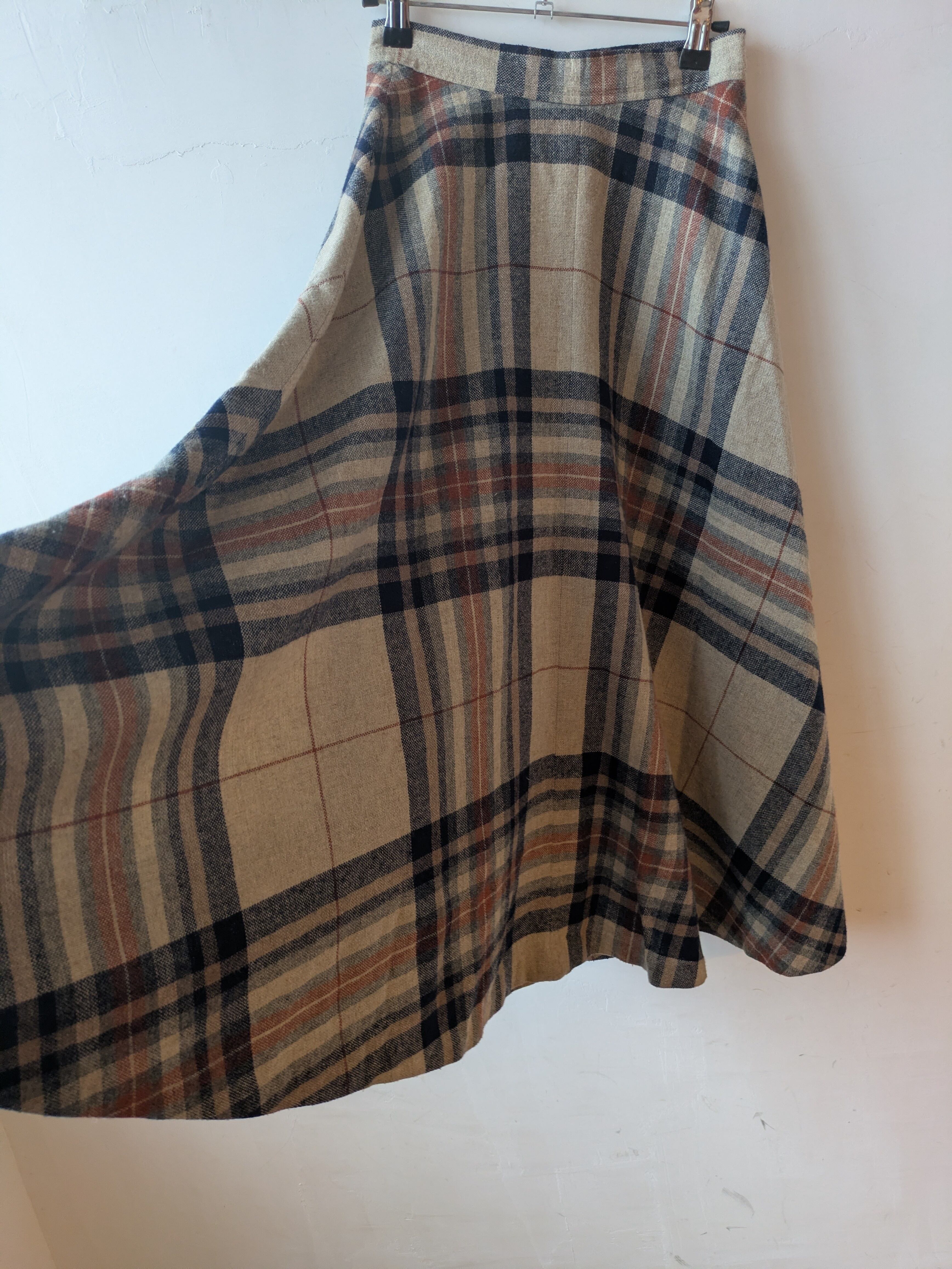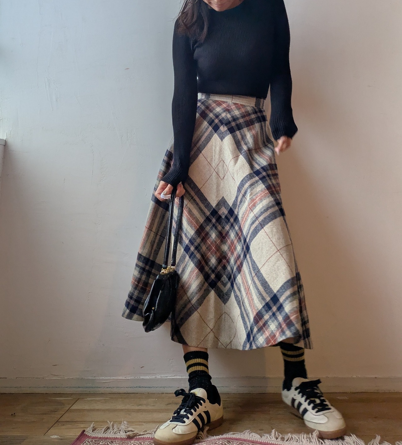 温かみのあるウール素材のチェック柄のミディ丈フレアスカートです。
