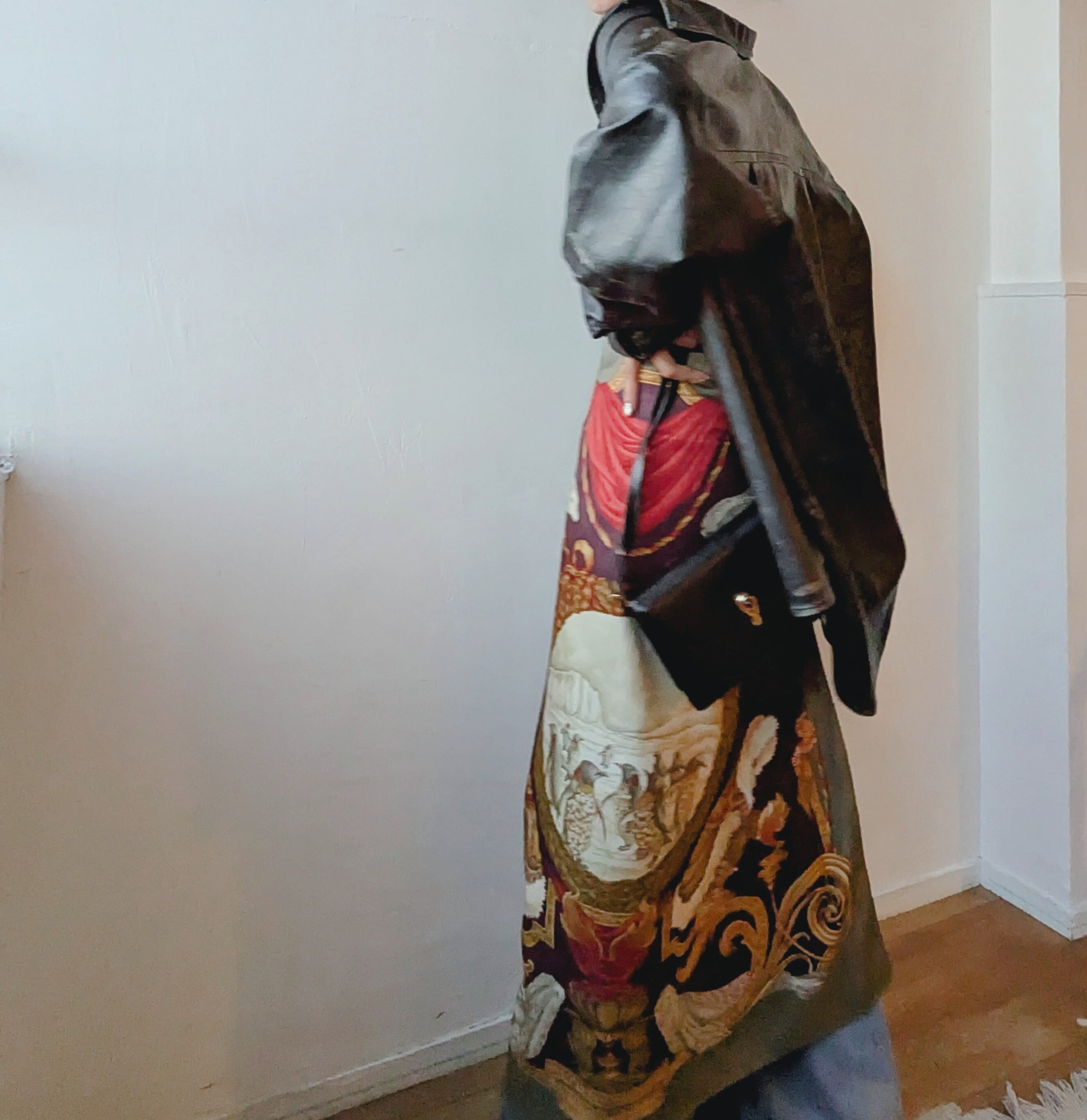 大判サイズなのでアレンジもしやすく、カジュアルにもキレイめにもモードにもどんなスタイルもランクアップさせてくれる1点物です。