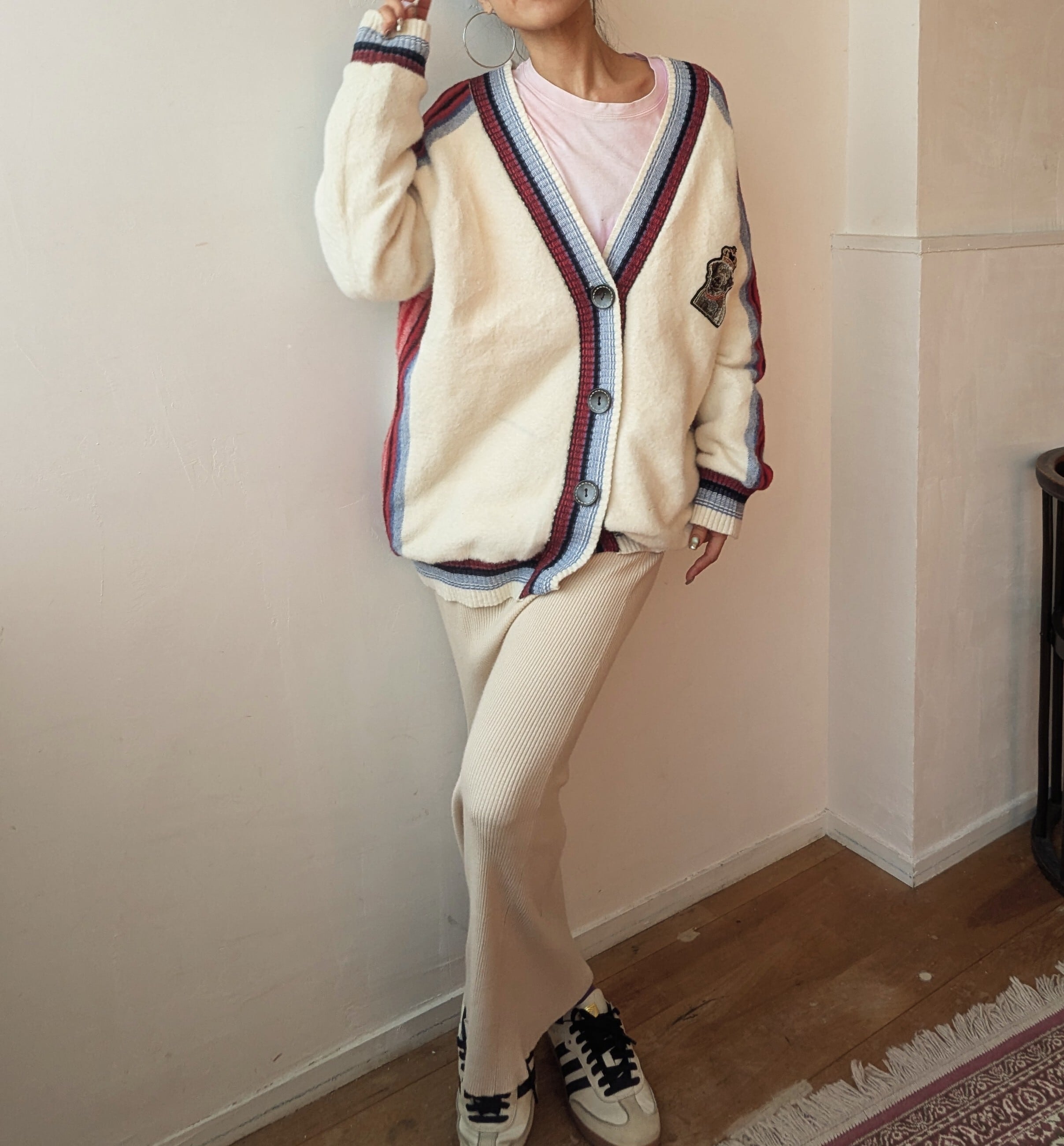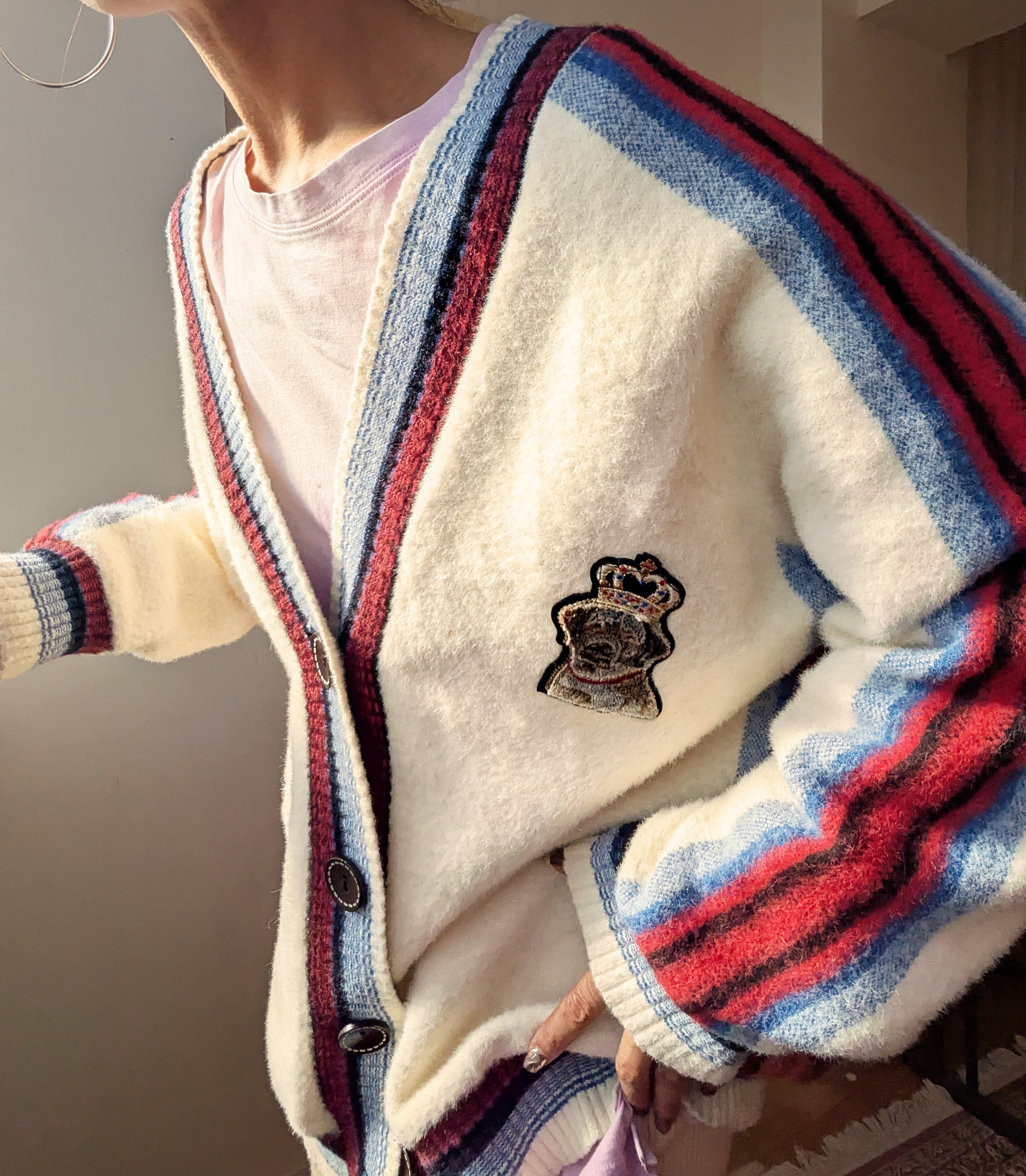 ふわふわでもちもちの、柔らかい肌触りが特徴の、胸元のキラキラに装飾されたワンコのキングワッペンが可愛すぎるカーディガンです。