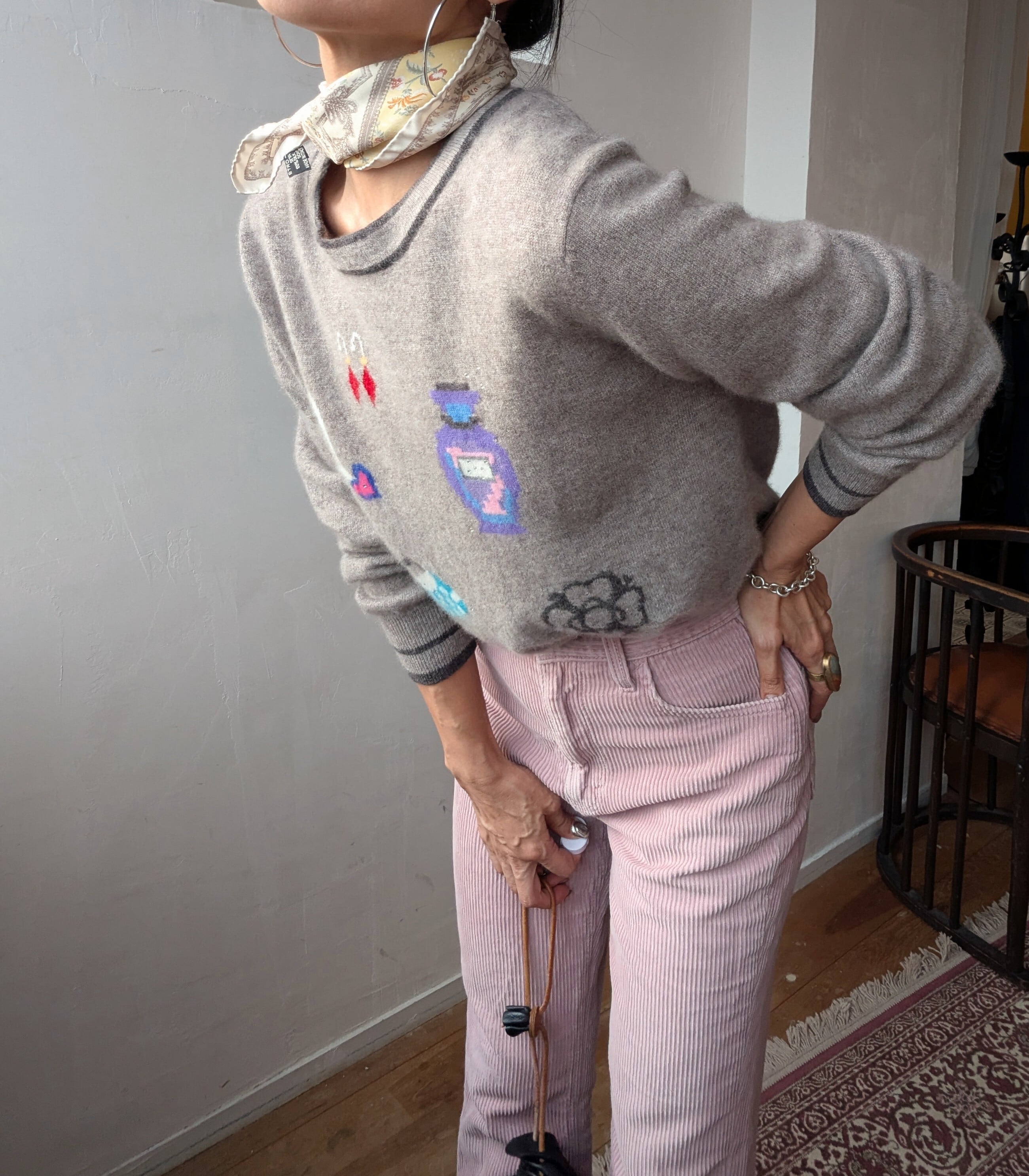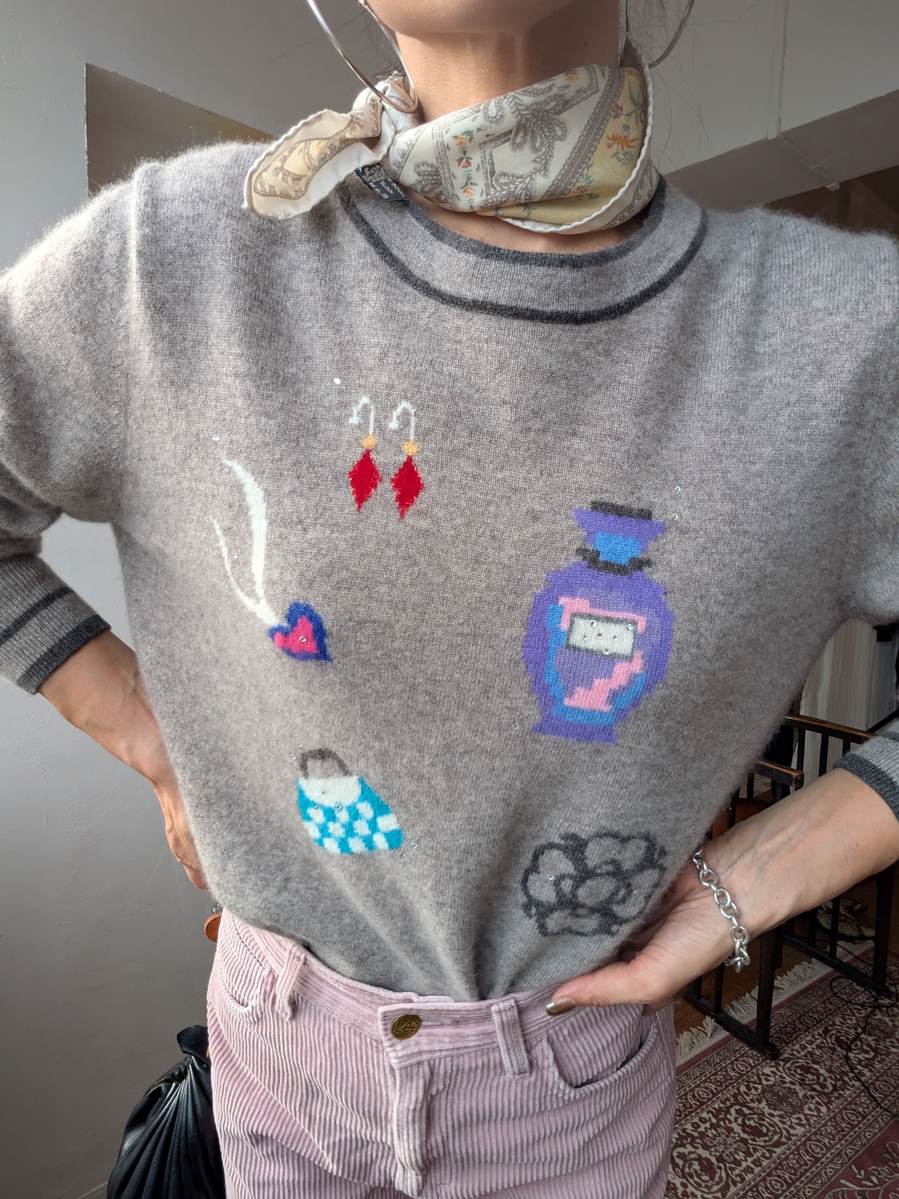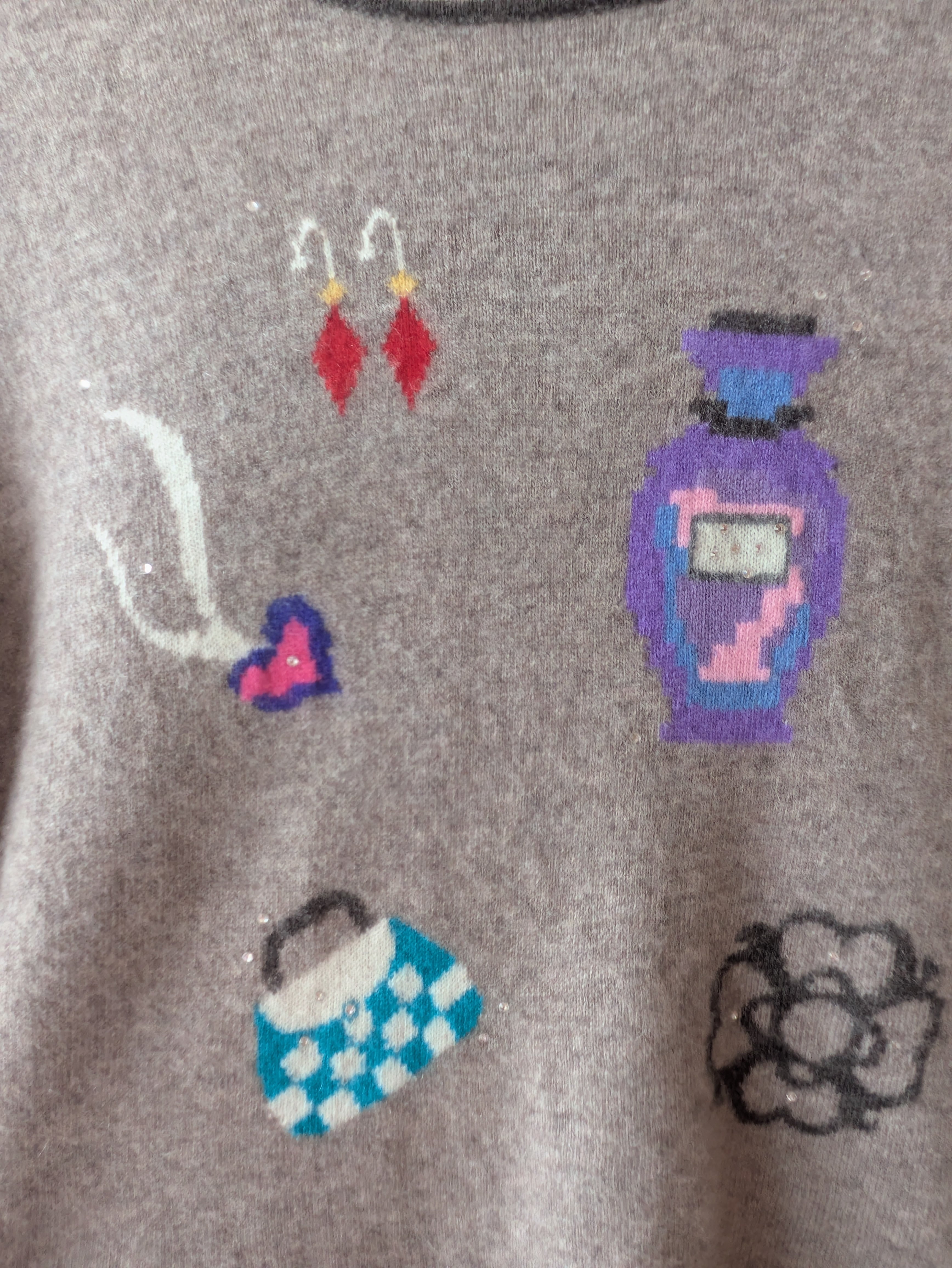 柔らかなカシミヤ100%を使用した、遊び心たっぷりの可愛らしいコスメデザインのニットです。