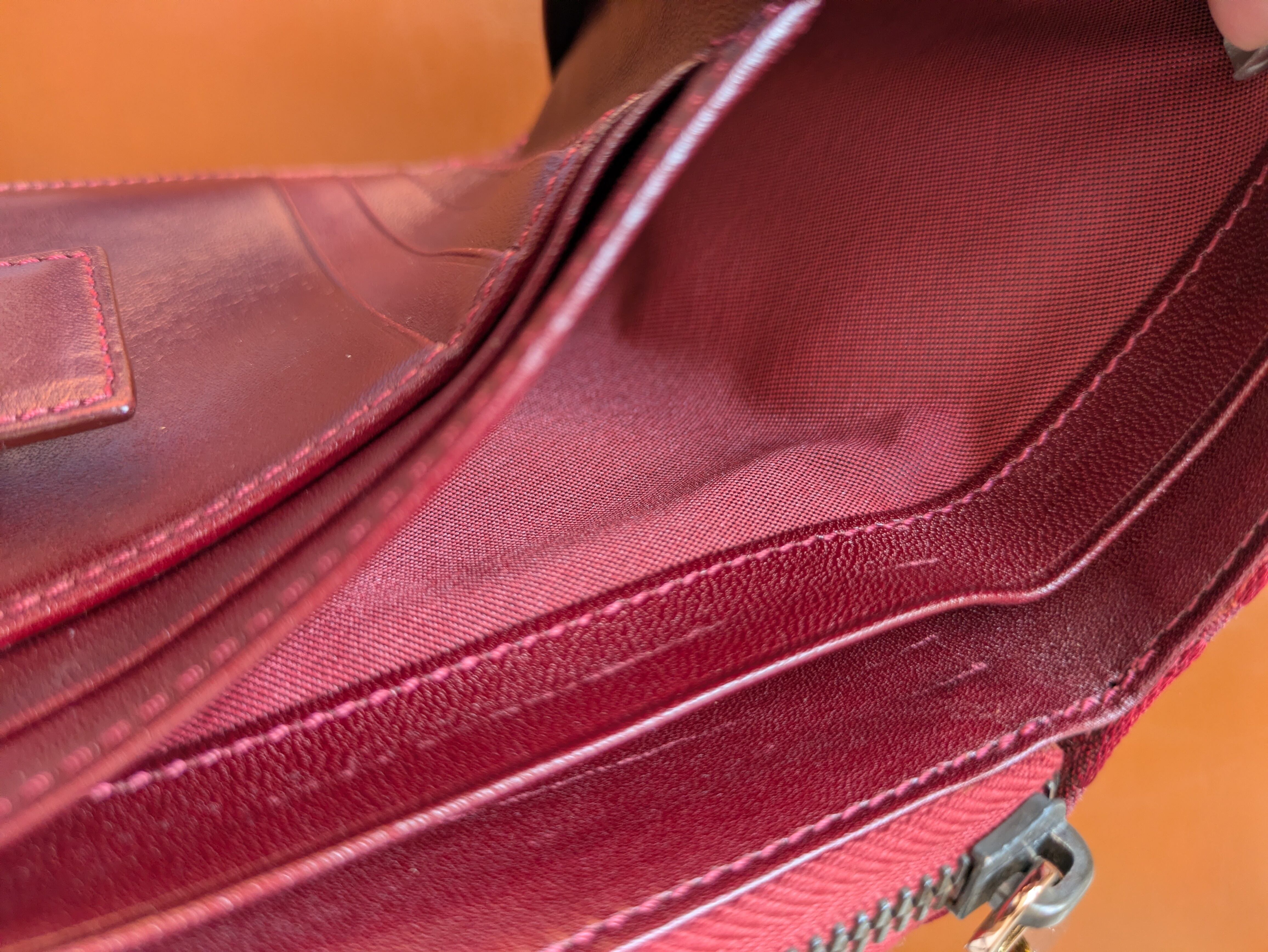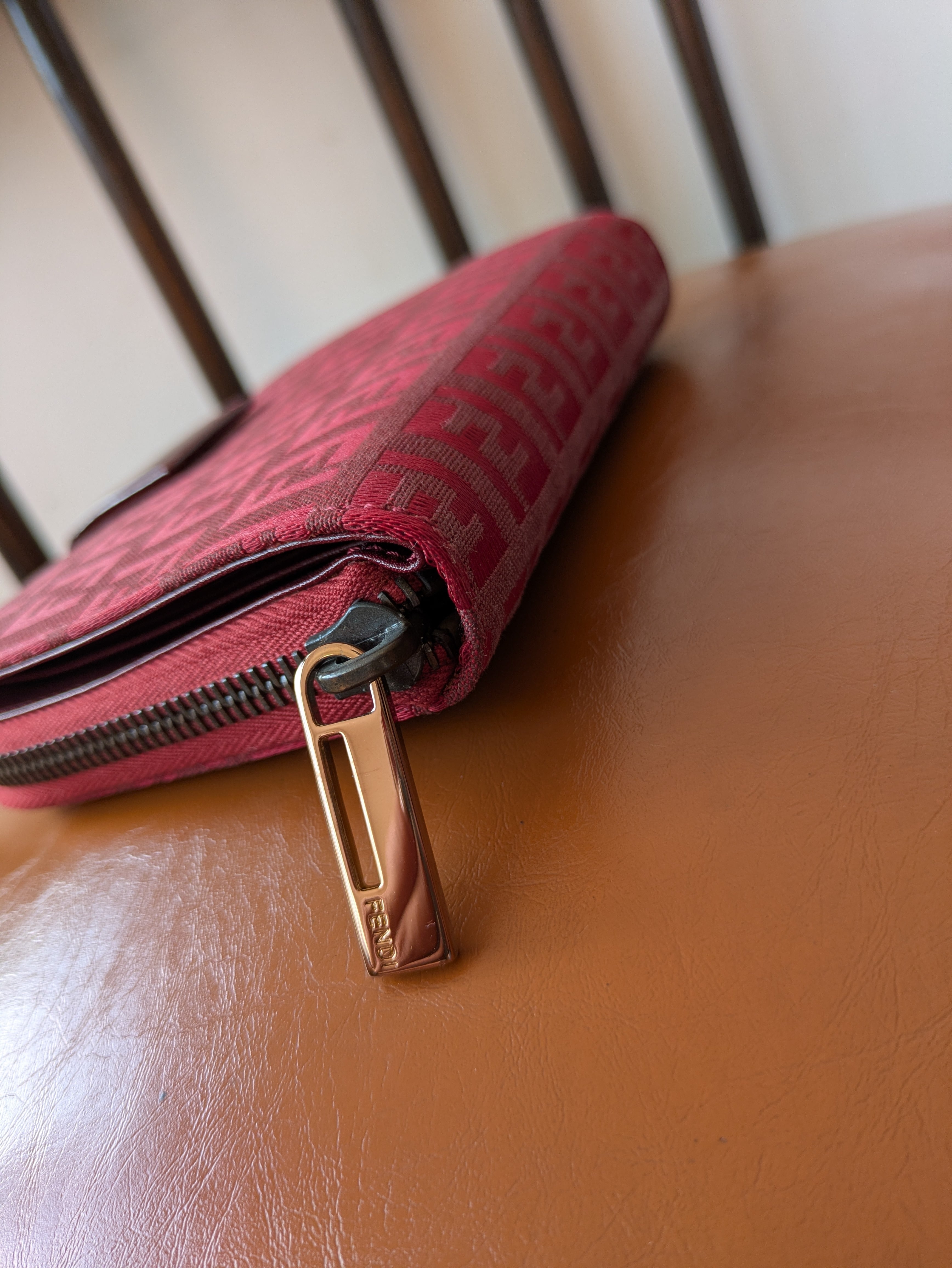 FENDIのZucchinoウォレットです。象徴的なZucchinoパターンと、ボルドーカラーがレトロな雰囲気と落ち着いた印象です。