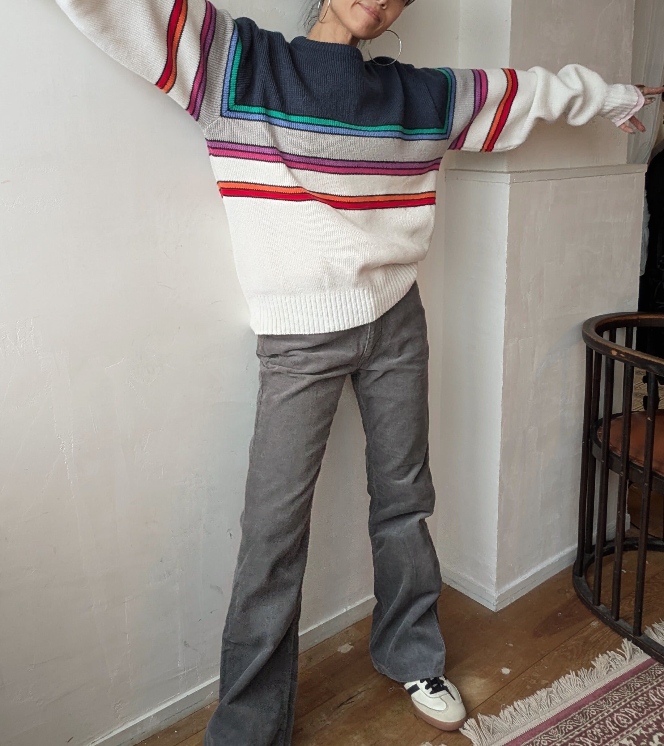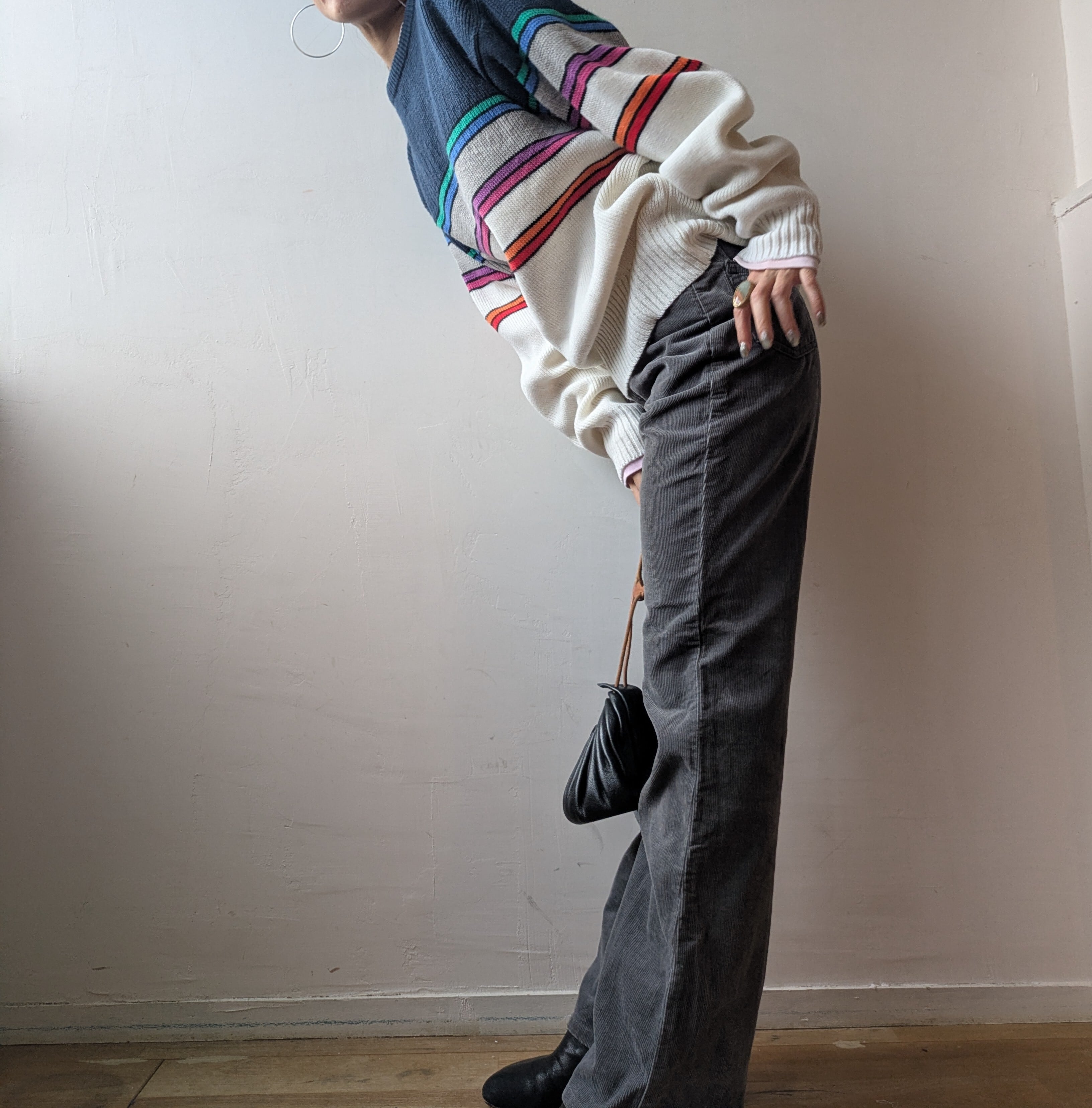 グレーカラーも併せやく、Corduroyの生地も暖かく、冬におすすめのスッキリとした美シルエットパンツです。