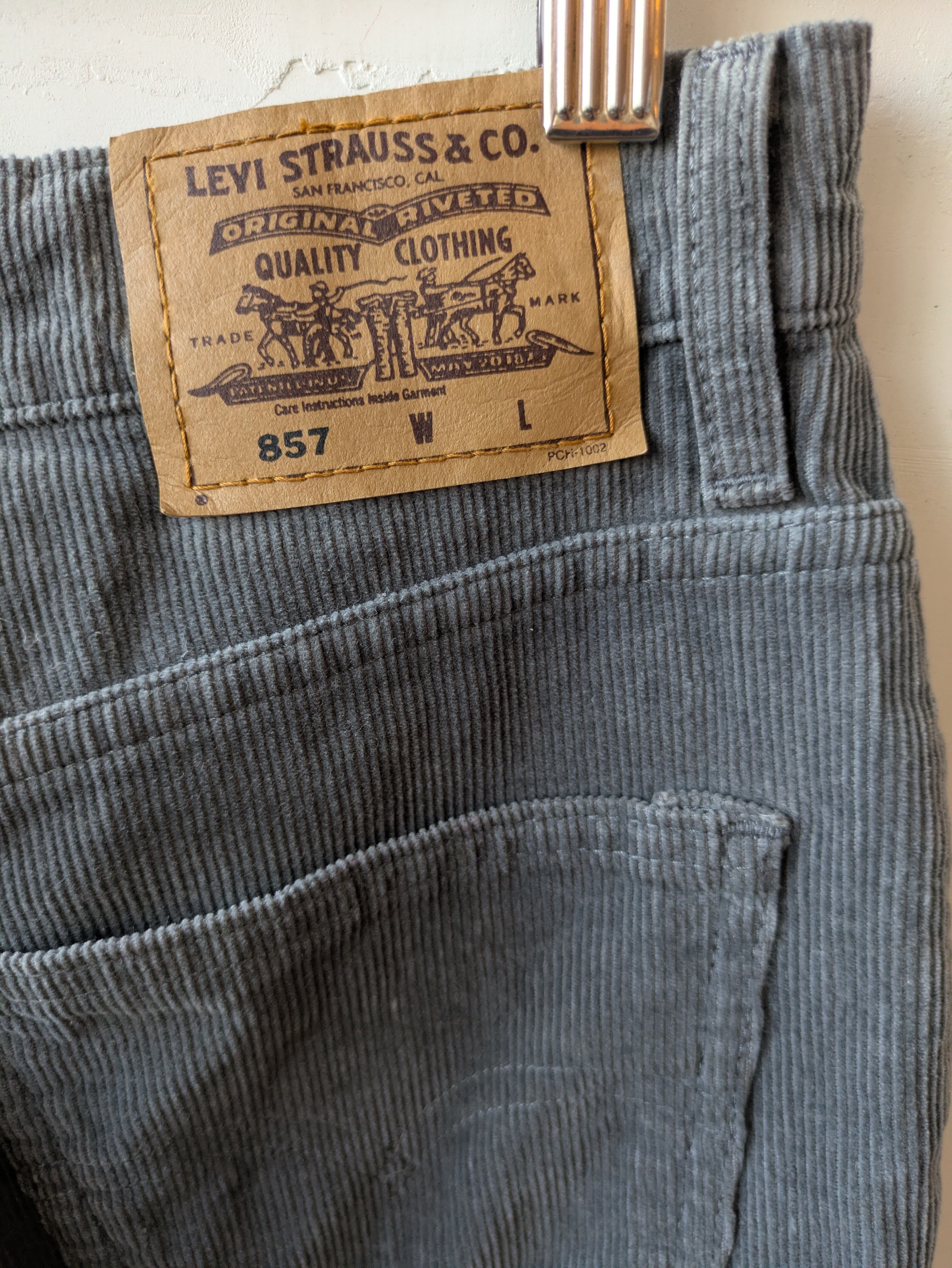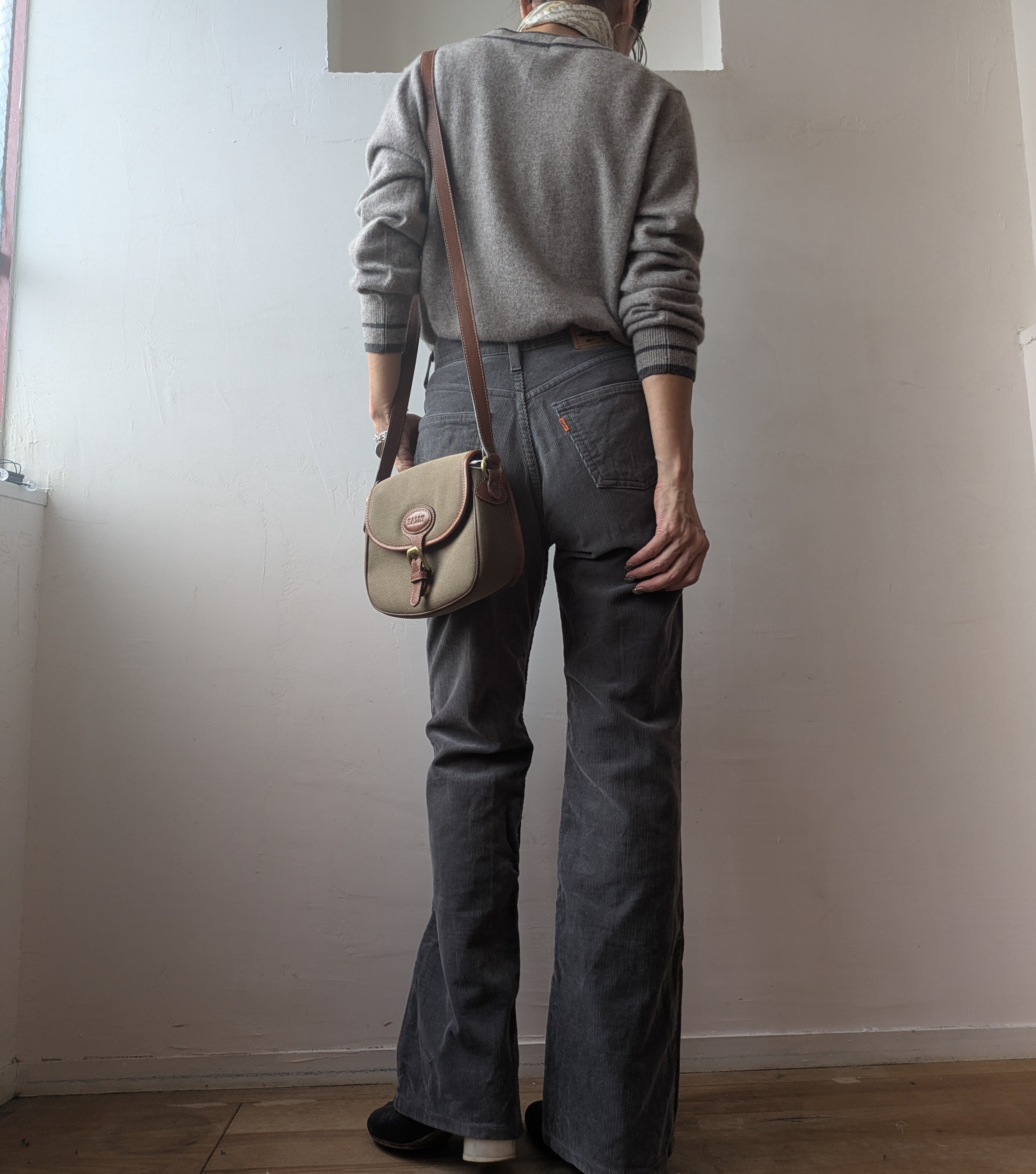 柔らかなコーデュロイ素材で仕立てられたLevisのブーツカットパンツです。絶妙な縦ラインのシルエットとグレーカラーが魅力で、カジュアルなスタイルはもちろん、少しフォーマルなシーンでも大人っぽく活躍する万能アイテムです。