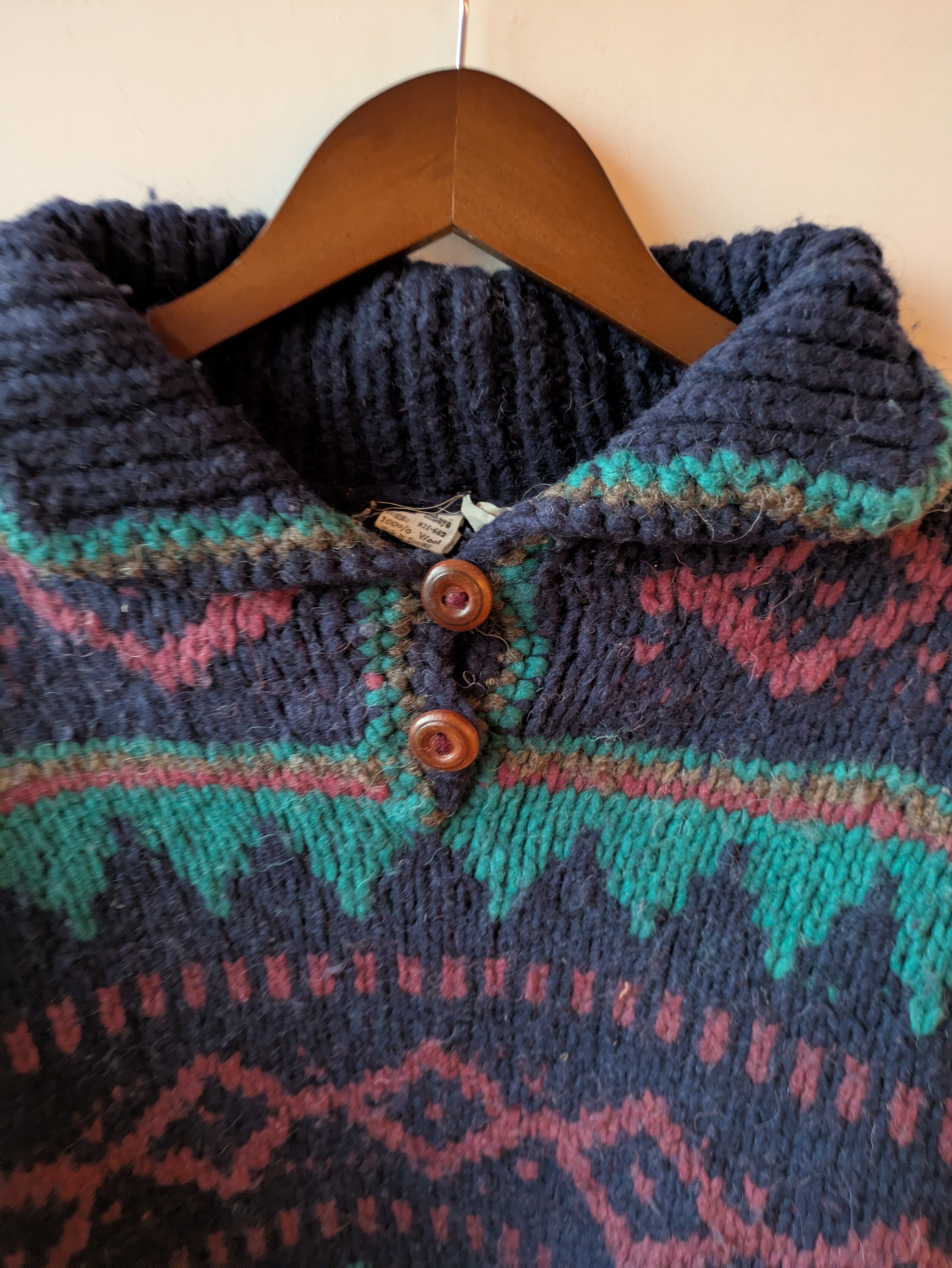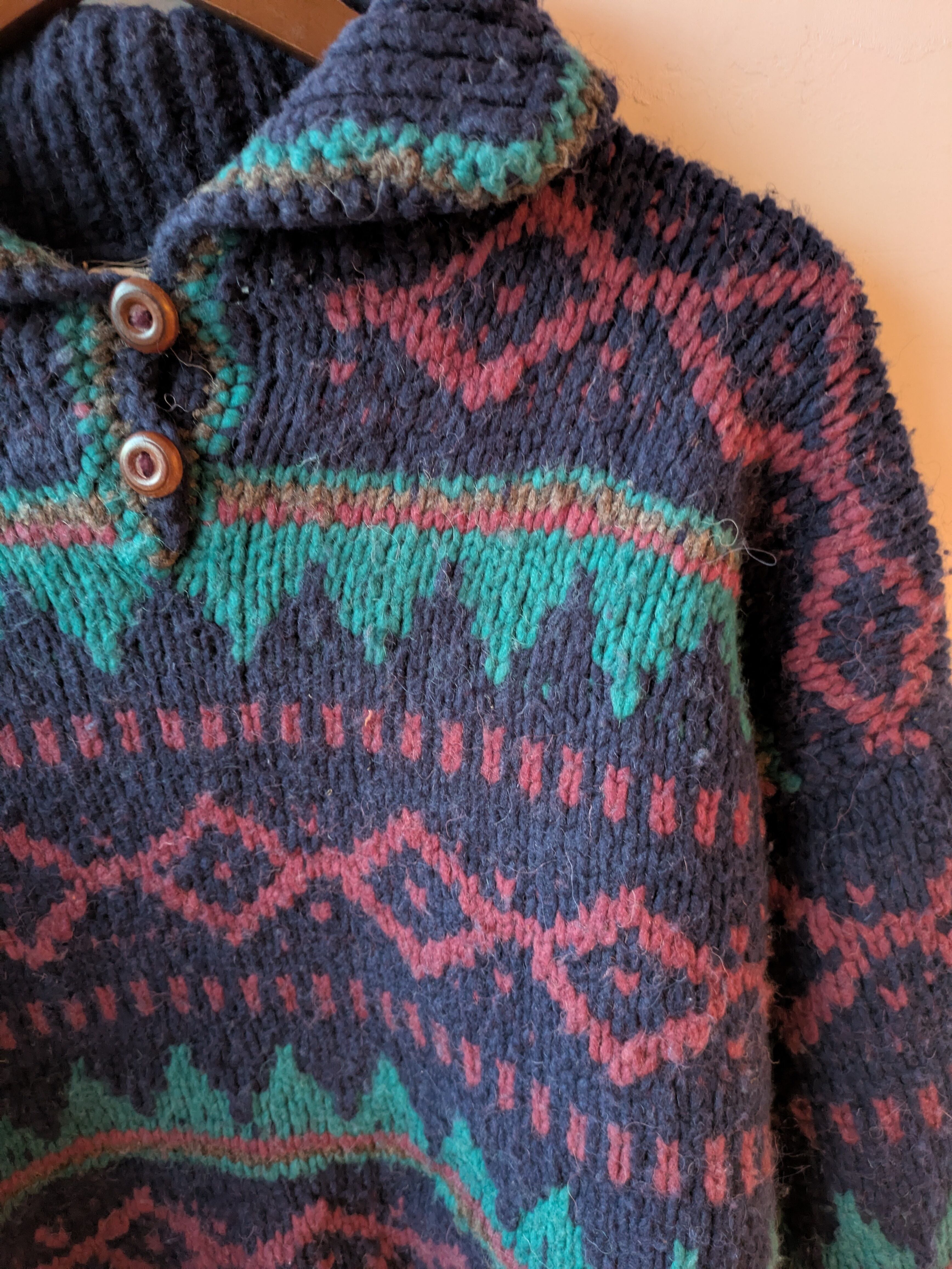 カラフルで優しい色合いに可愛いデザインが目を惹くウール100%の手編みニット。