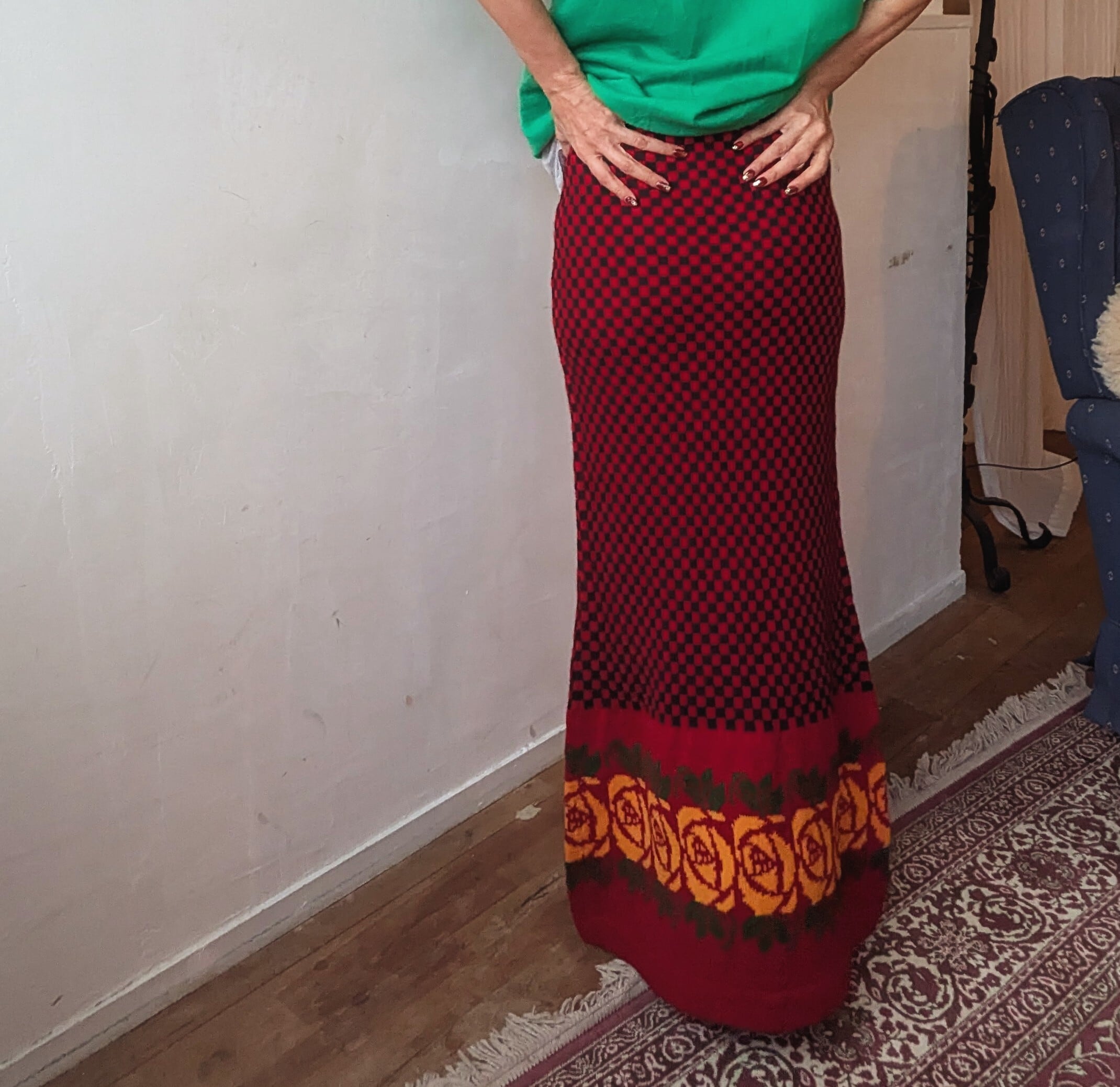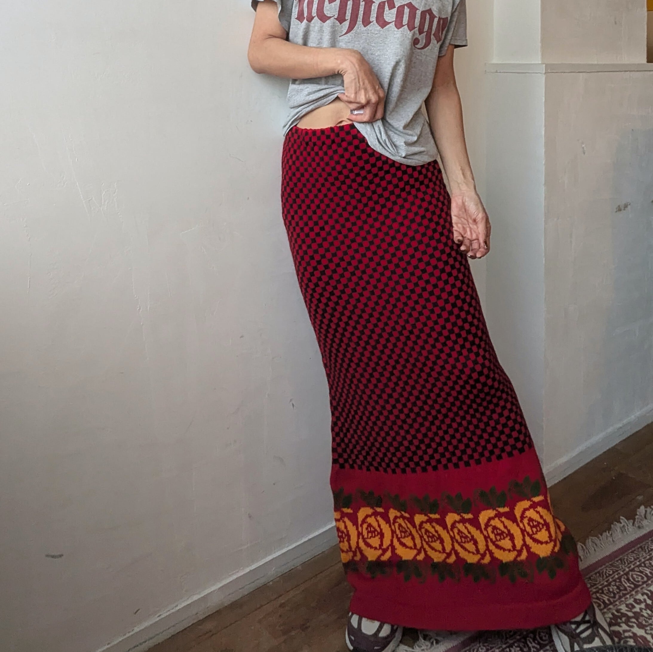 black×redのフラッグチェック柄と華やかなローズデザインがUSA vintageらしい他にはないデザイン。可愛いさとかっこよさが融合したニットロングスカート。