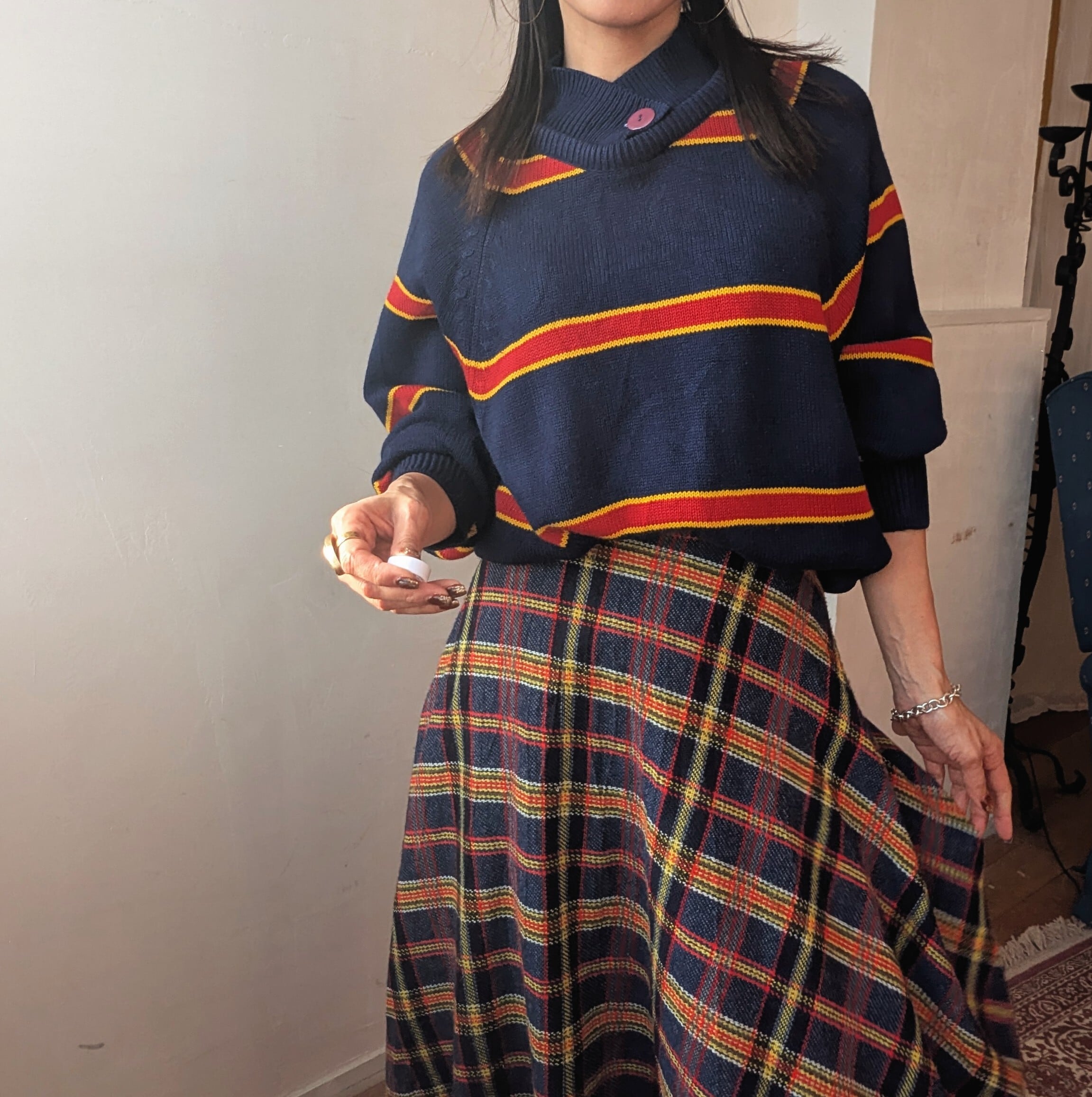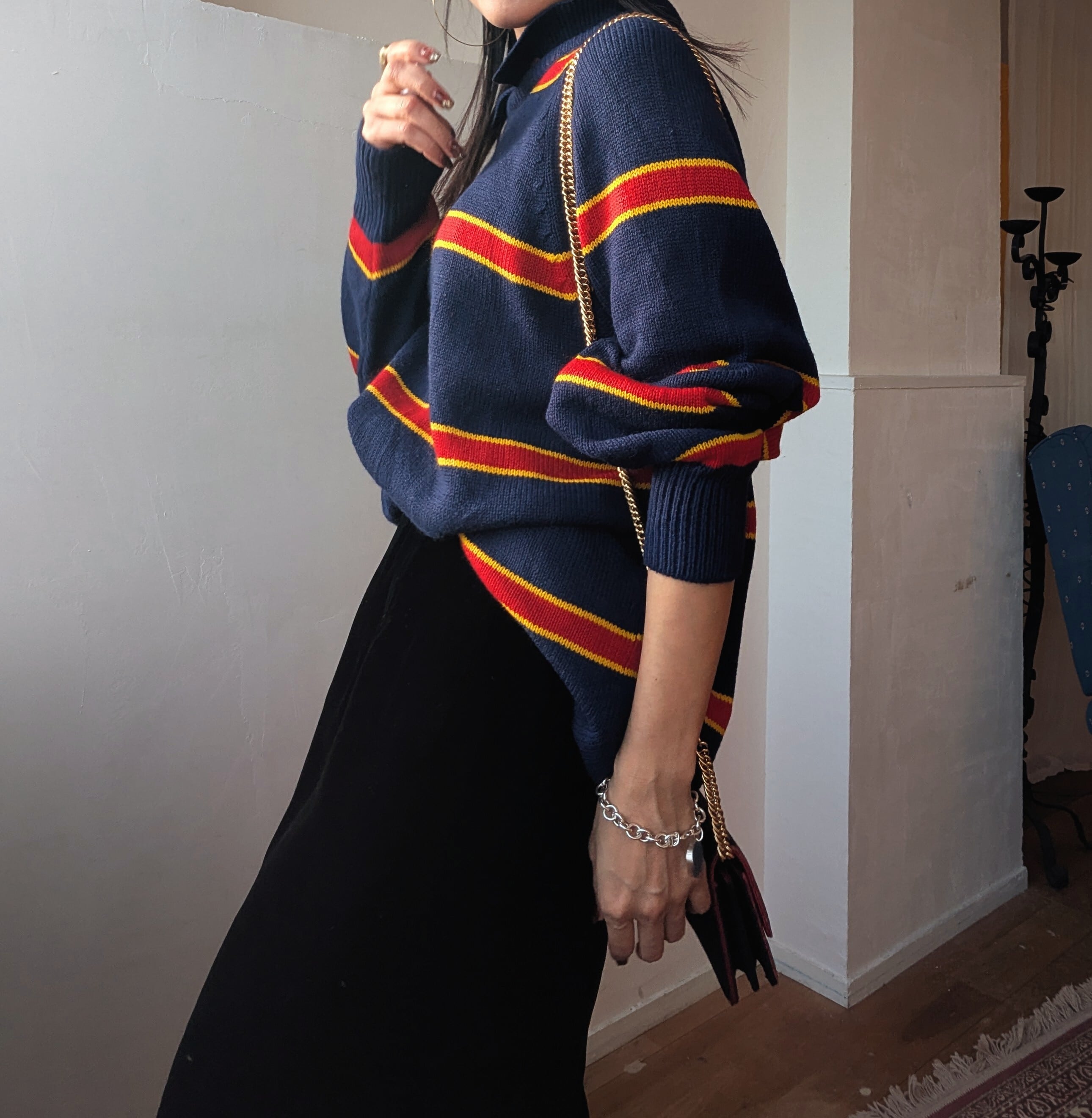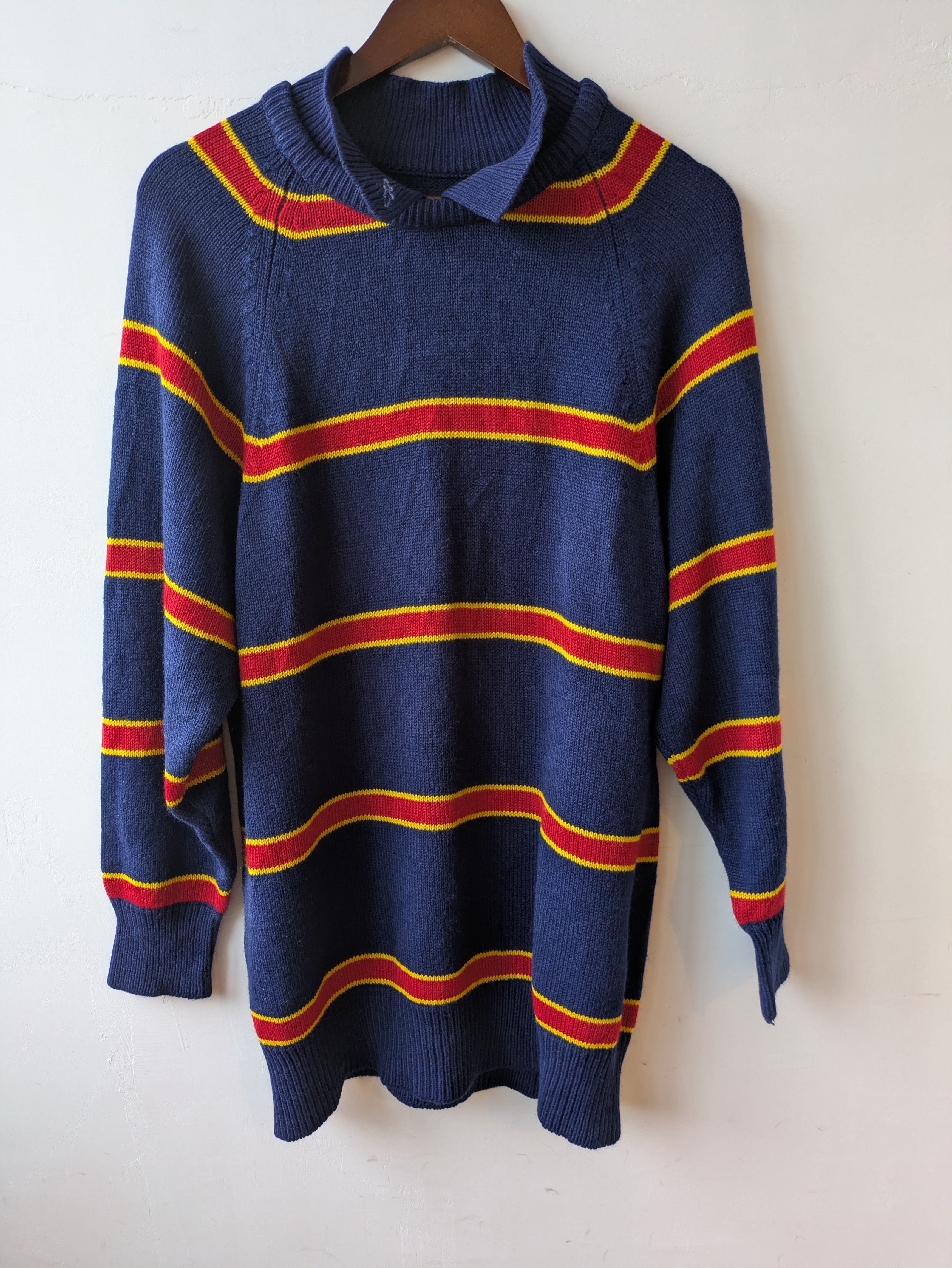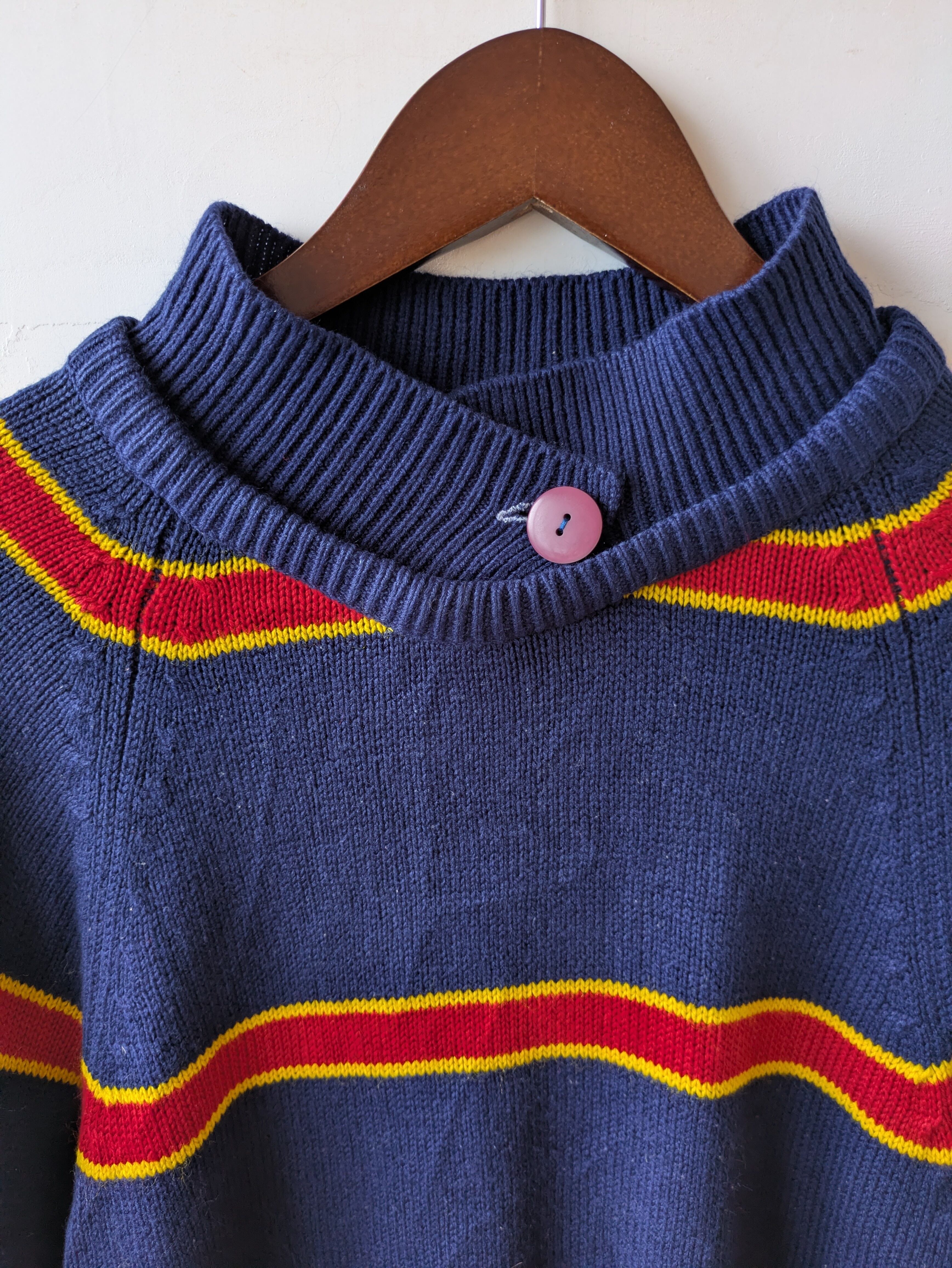 折ると襟になり、ボタンを留めるとハイネックになる、2way仕様の首元がアクセントのラガーデザインニット。