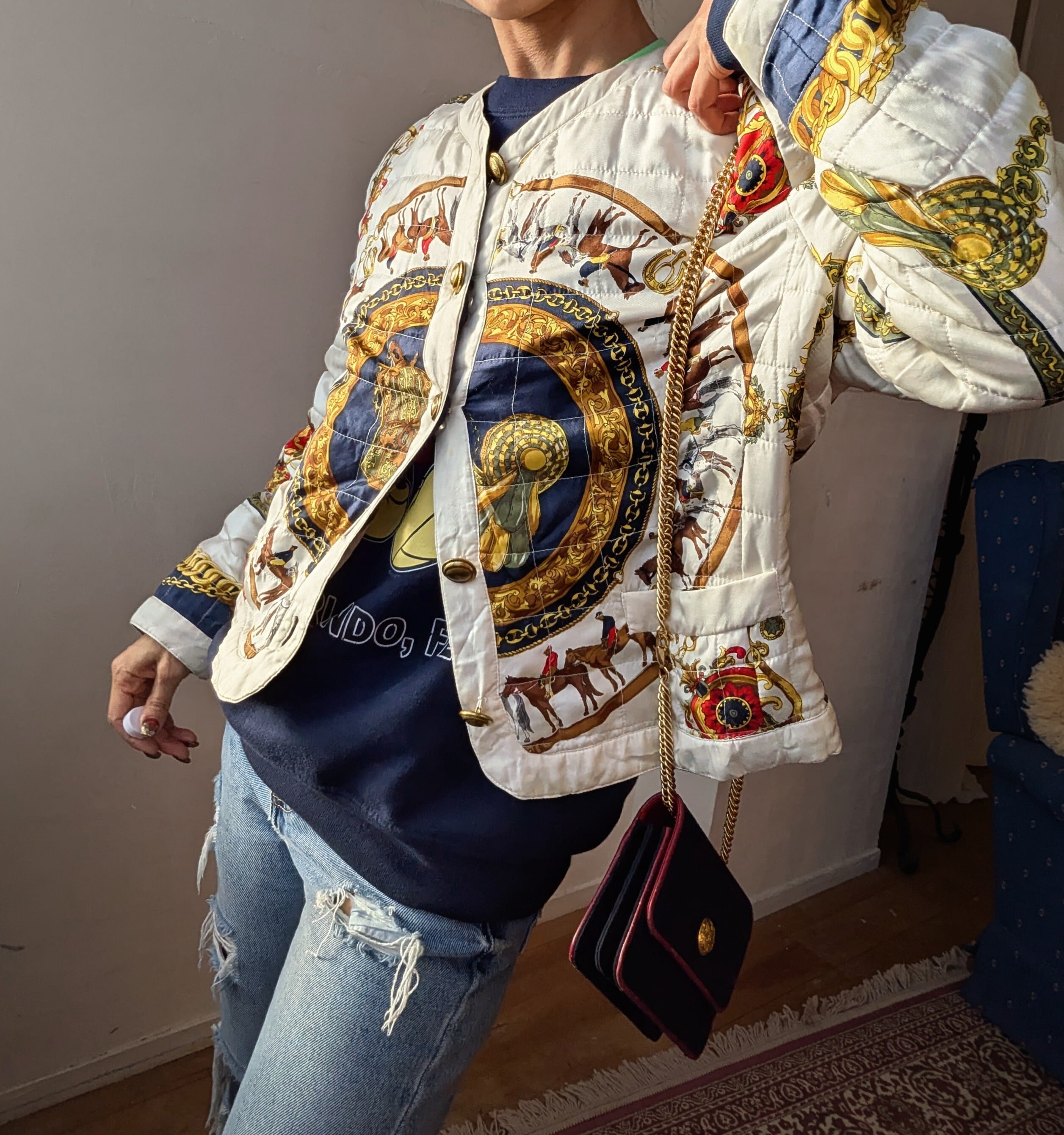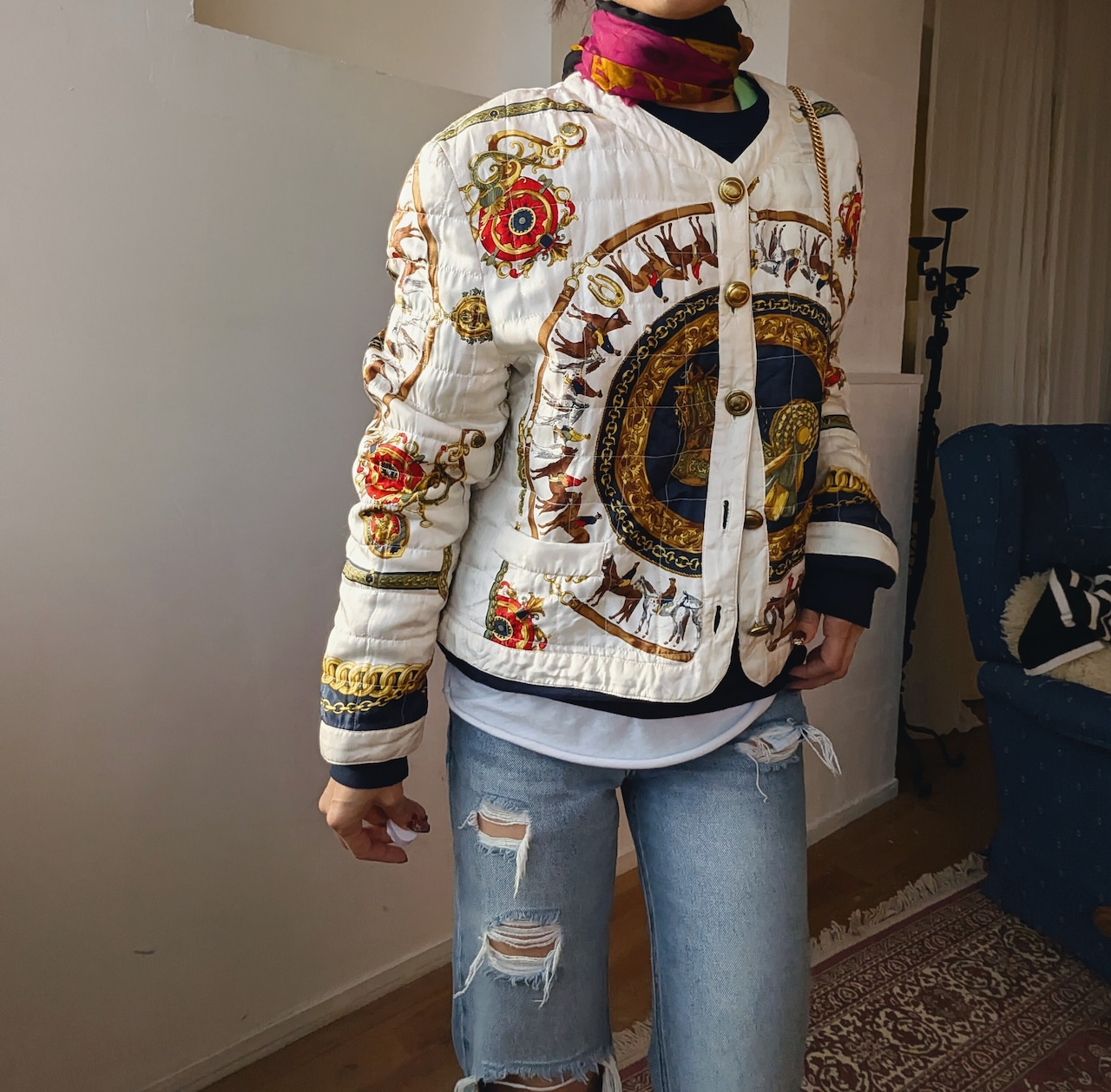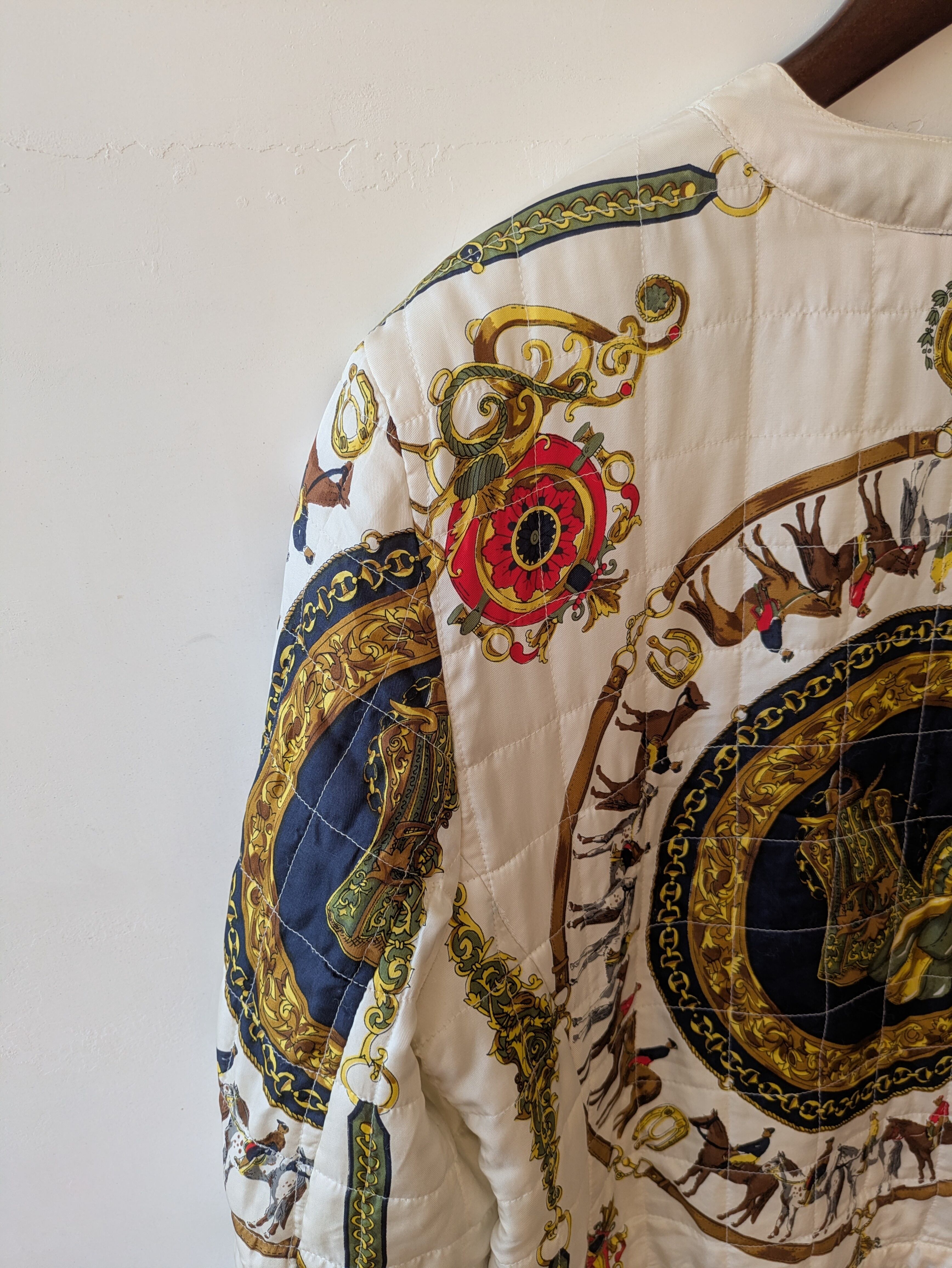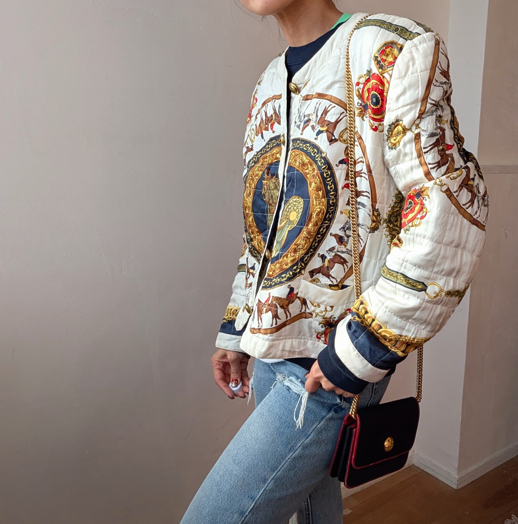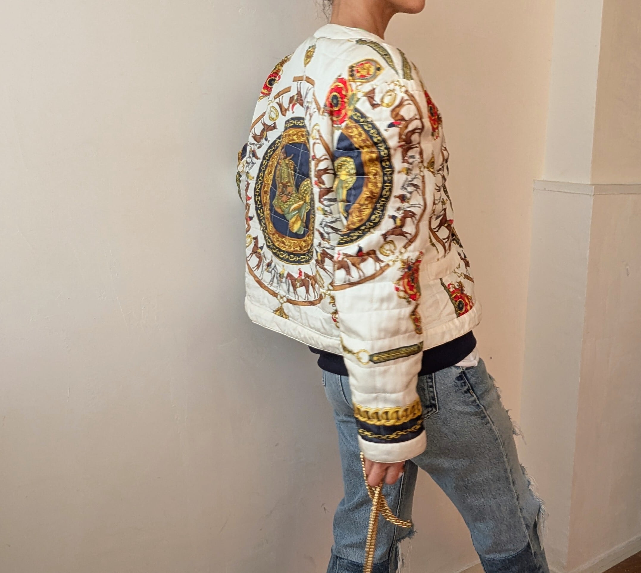 レトロなスカーフデザインが素敵なライトキルティングジャケット。