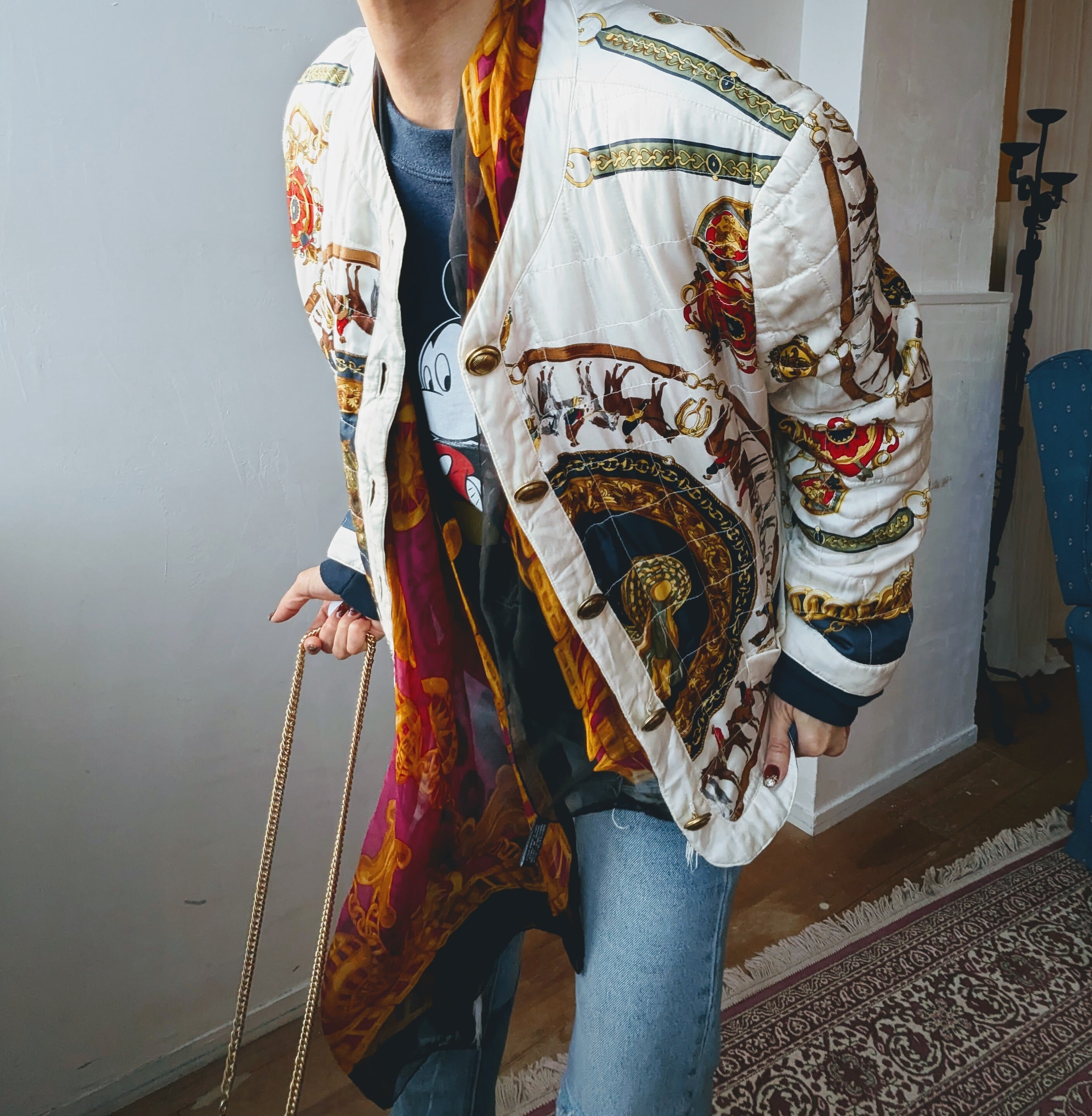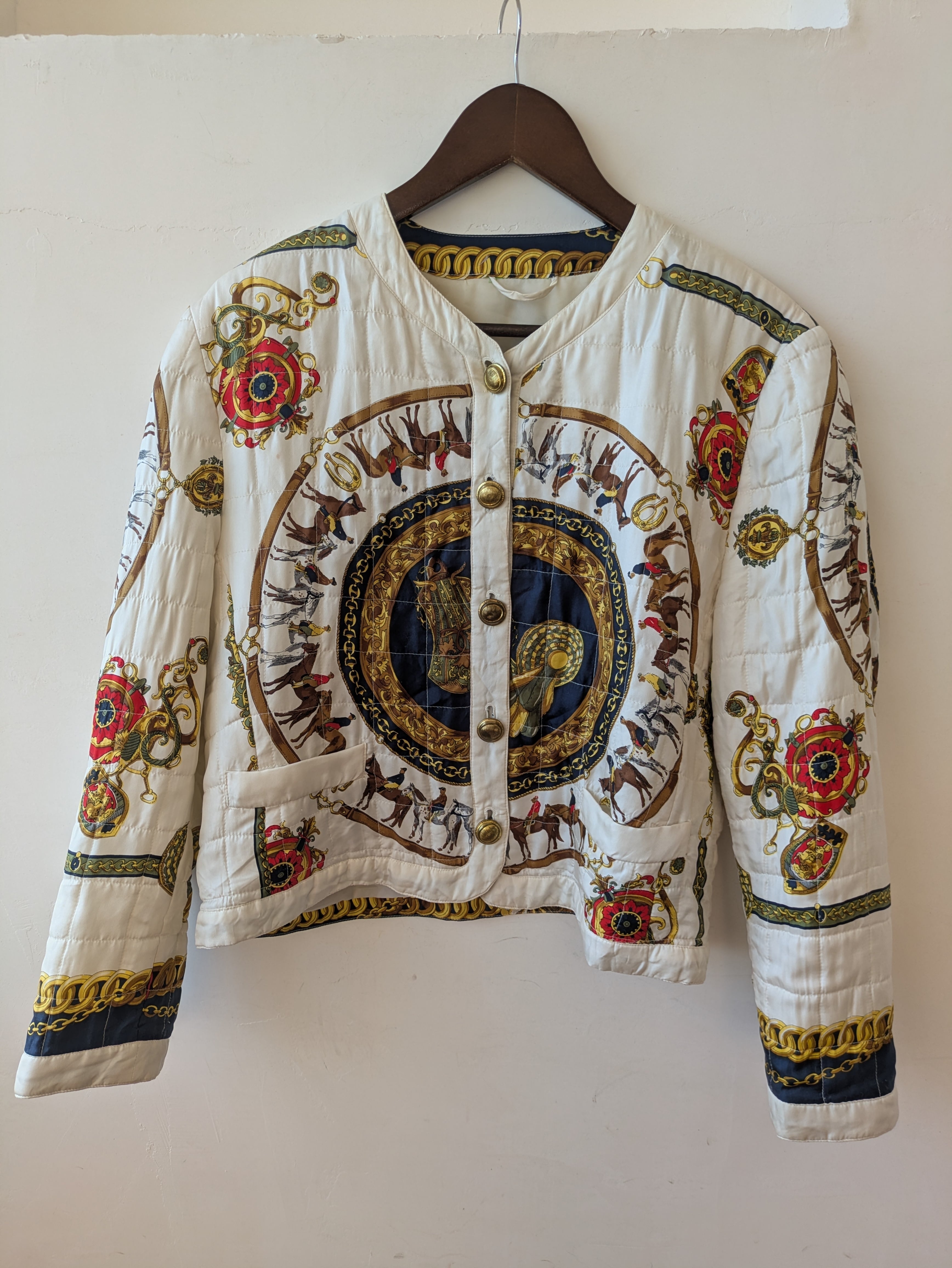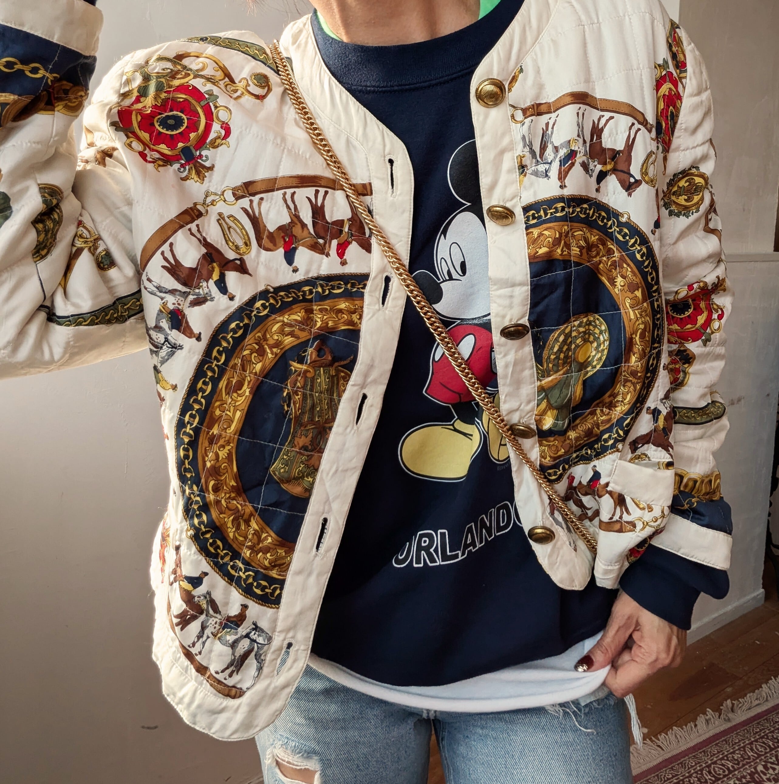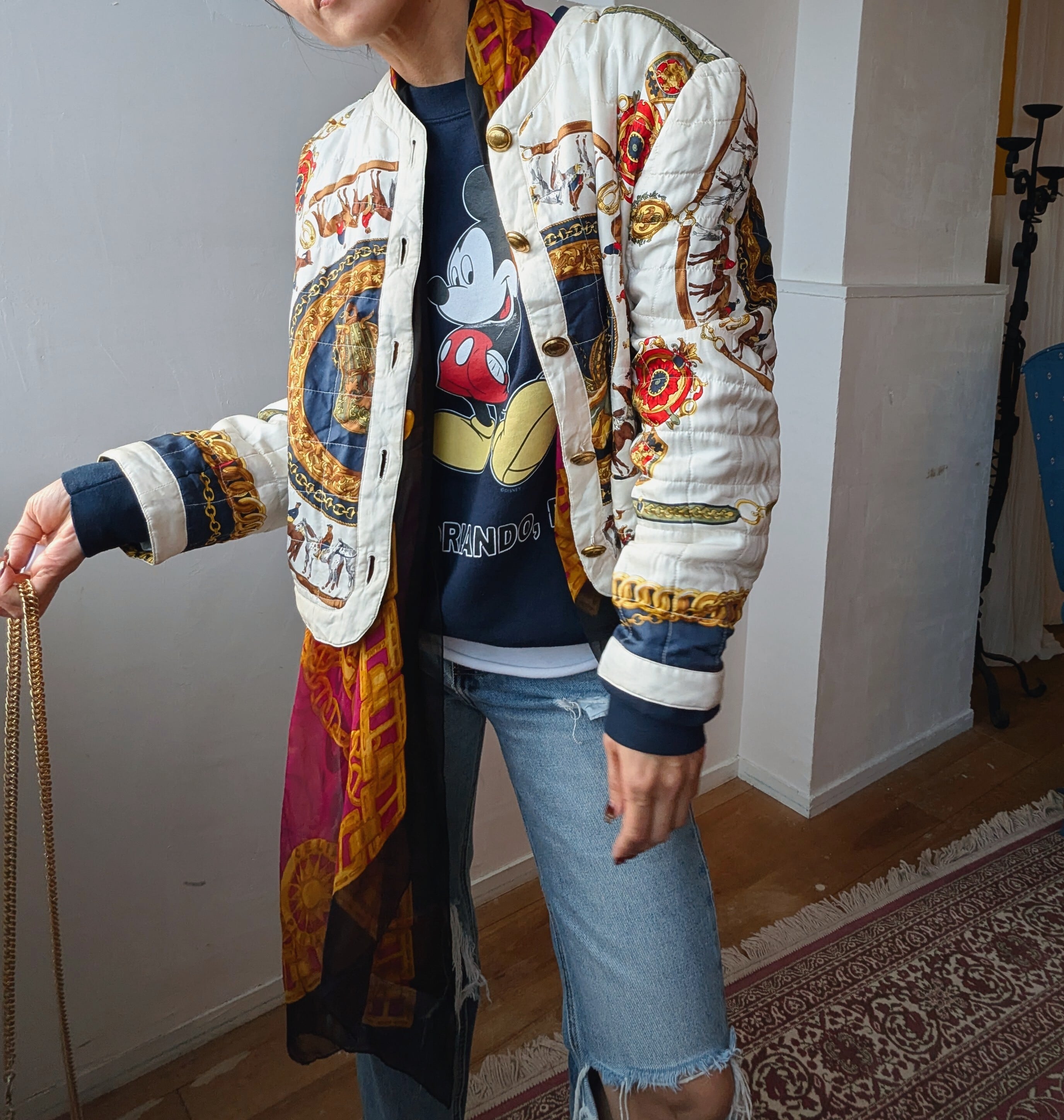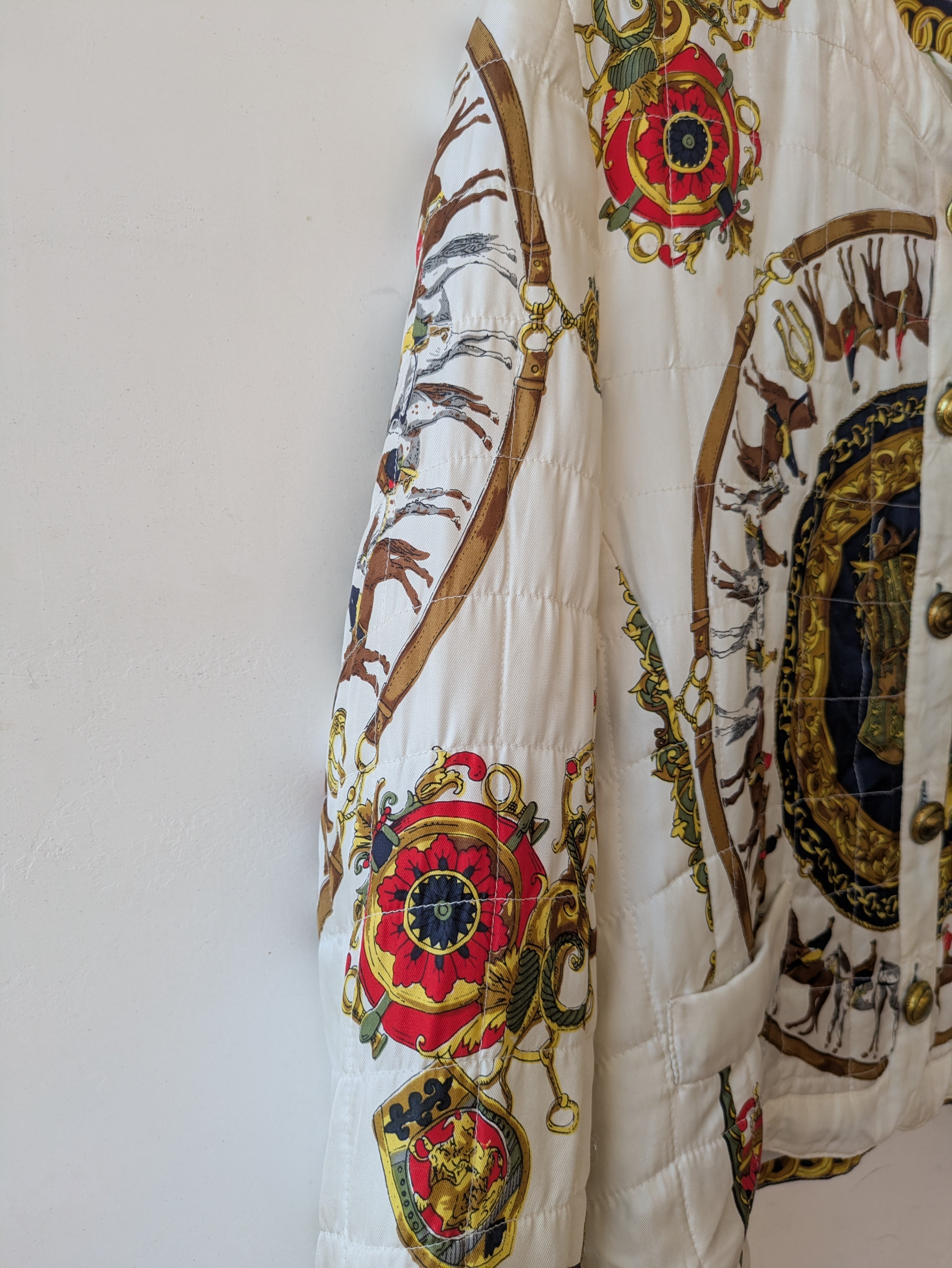 レトロなスカーフデザインが素敵なライトキルティングジャケット。