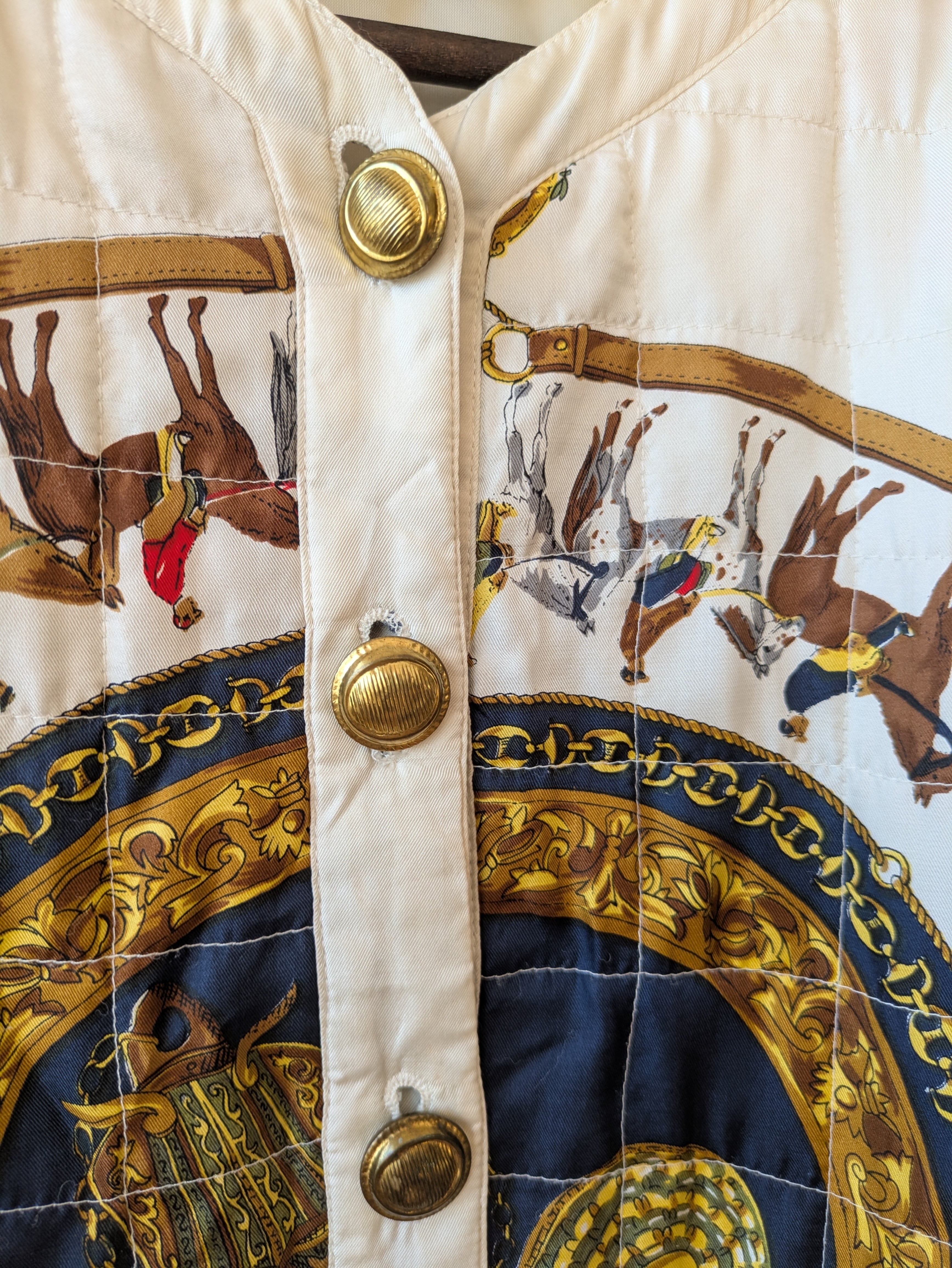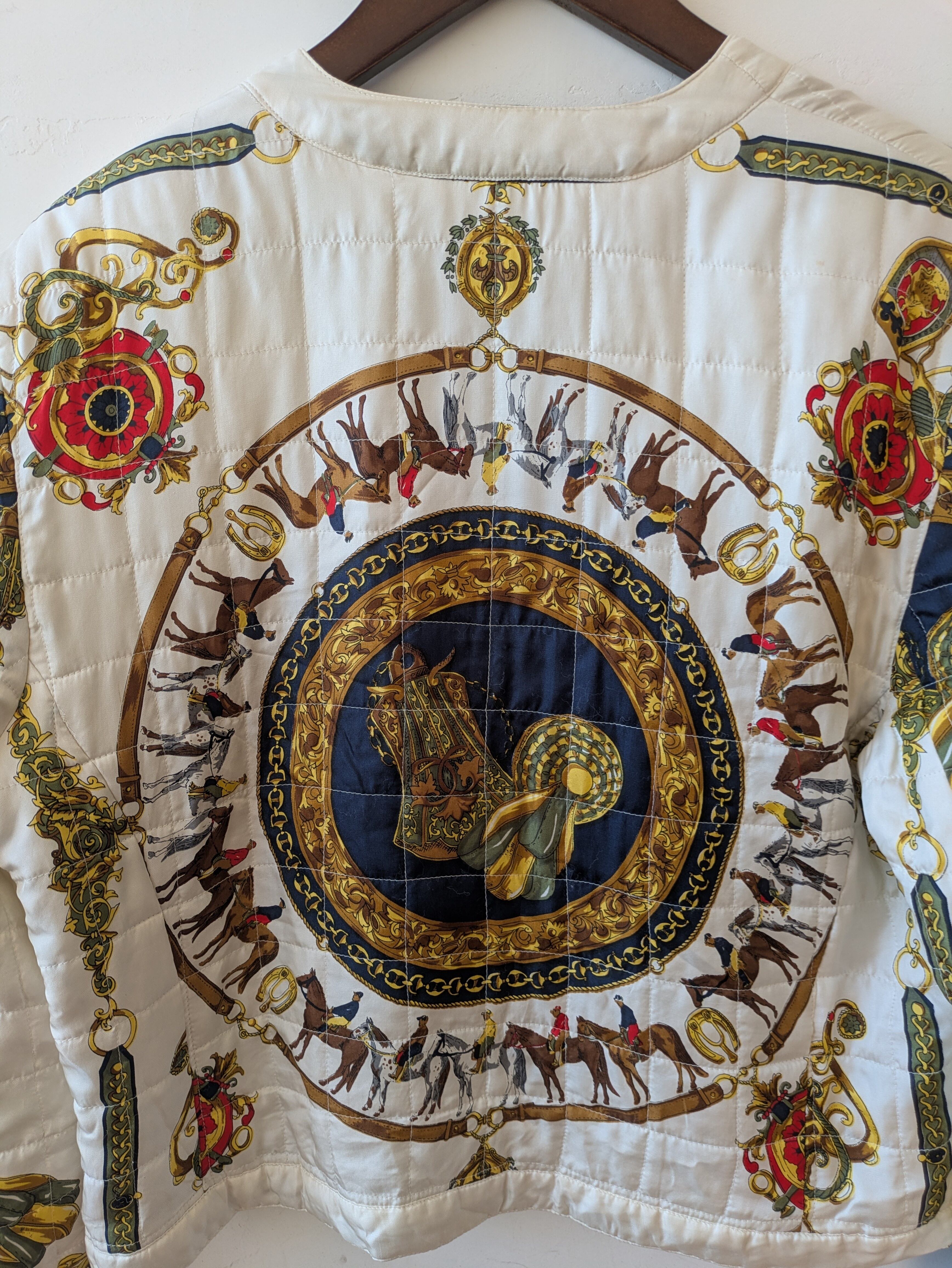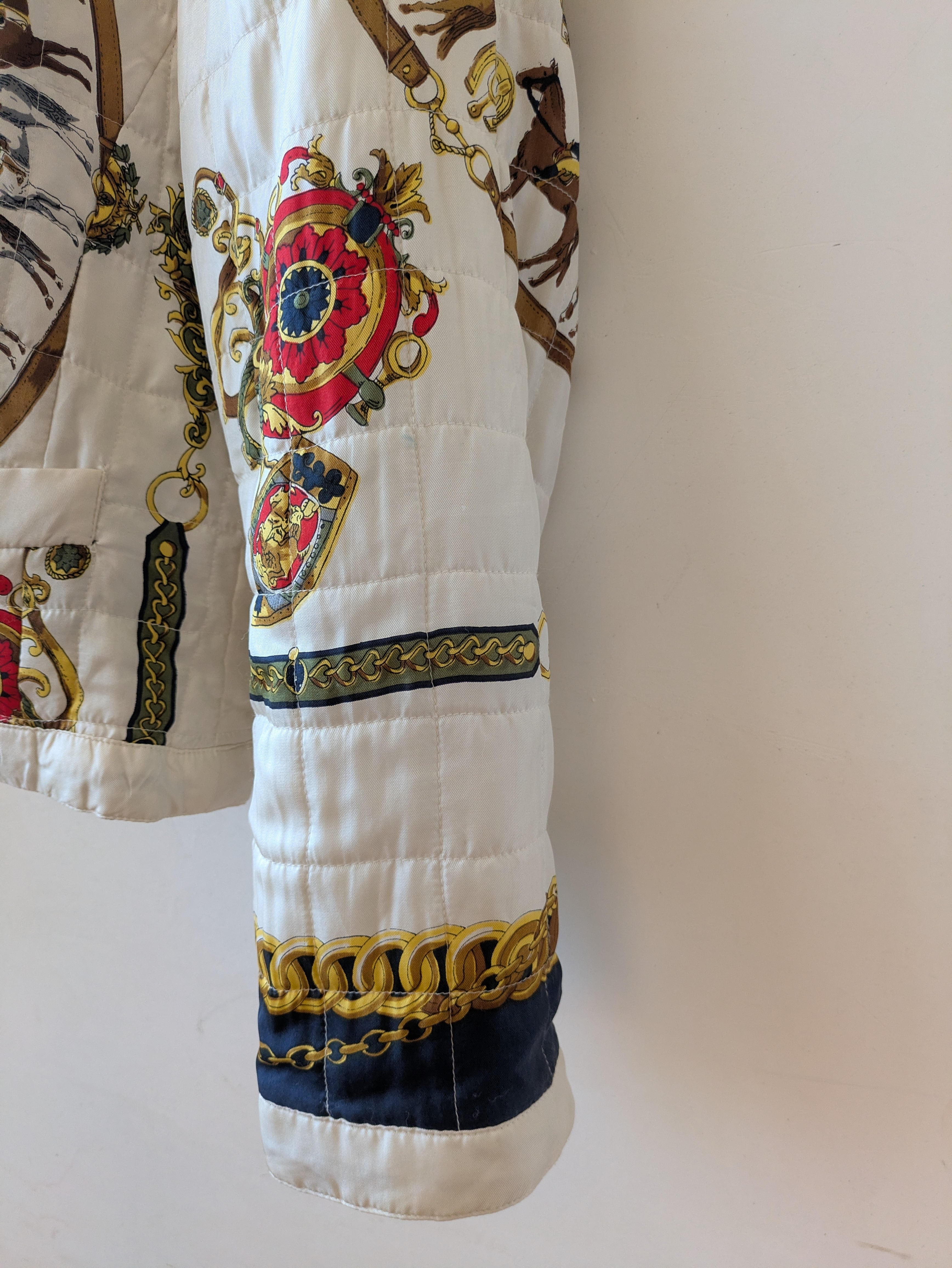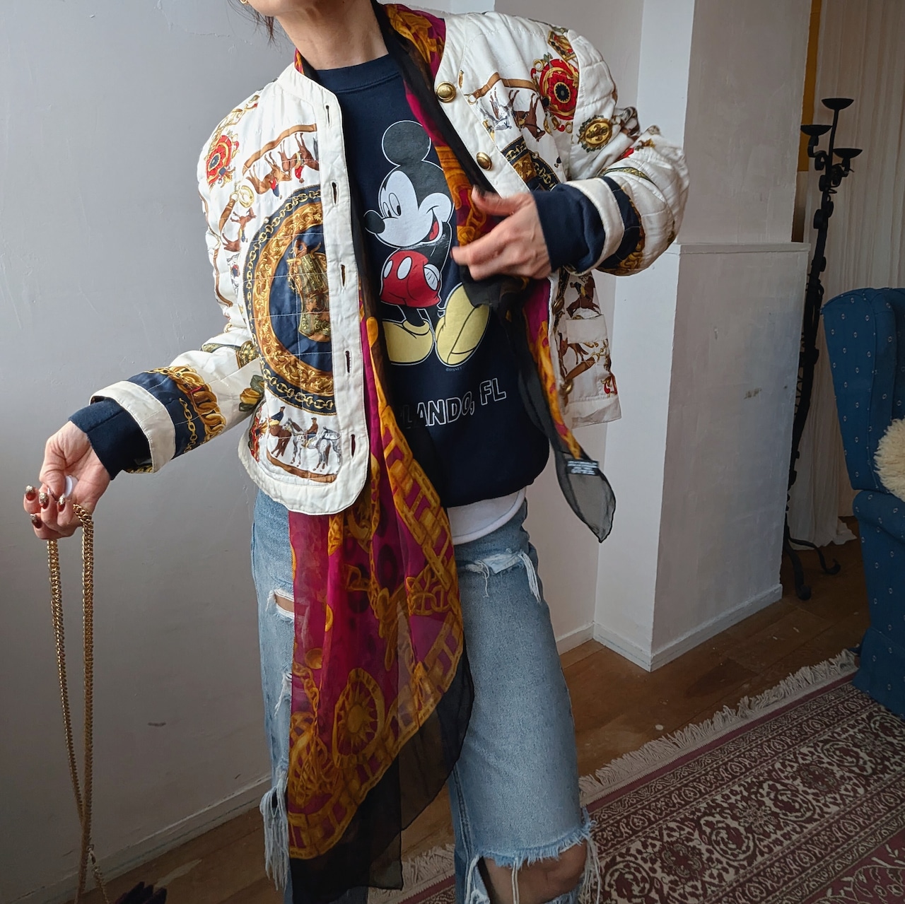 レトロなスカーフデザインが素敵なライトキルティングジャケット。